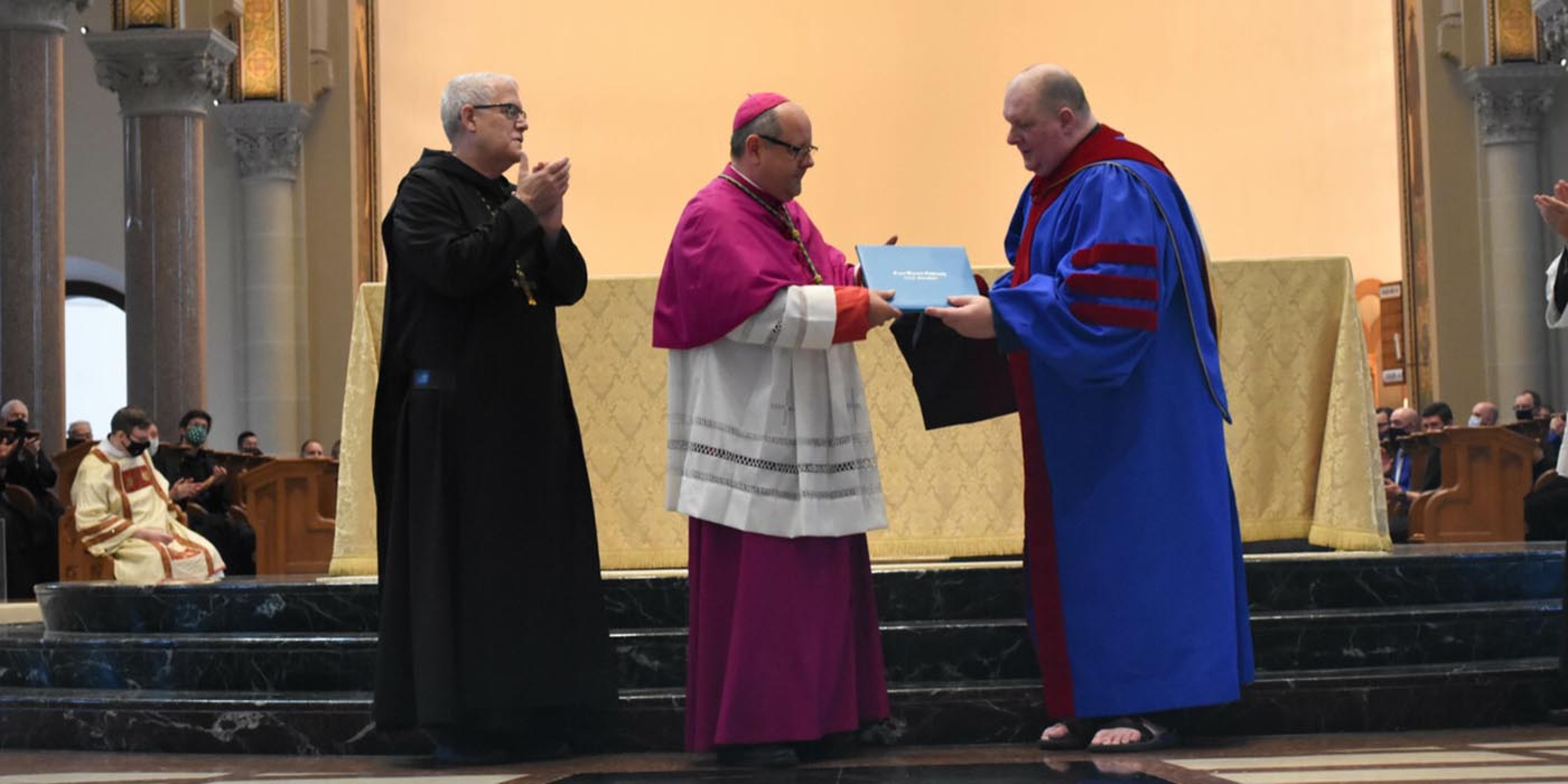 After degrees were conferred, the bishop received the honorary doctor of divinity in recognition of his work deepening the spirit of hope, encouraging others to take up the call of the new evangelization his dedication to sharing the joy of the risen Lord.
