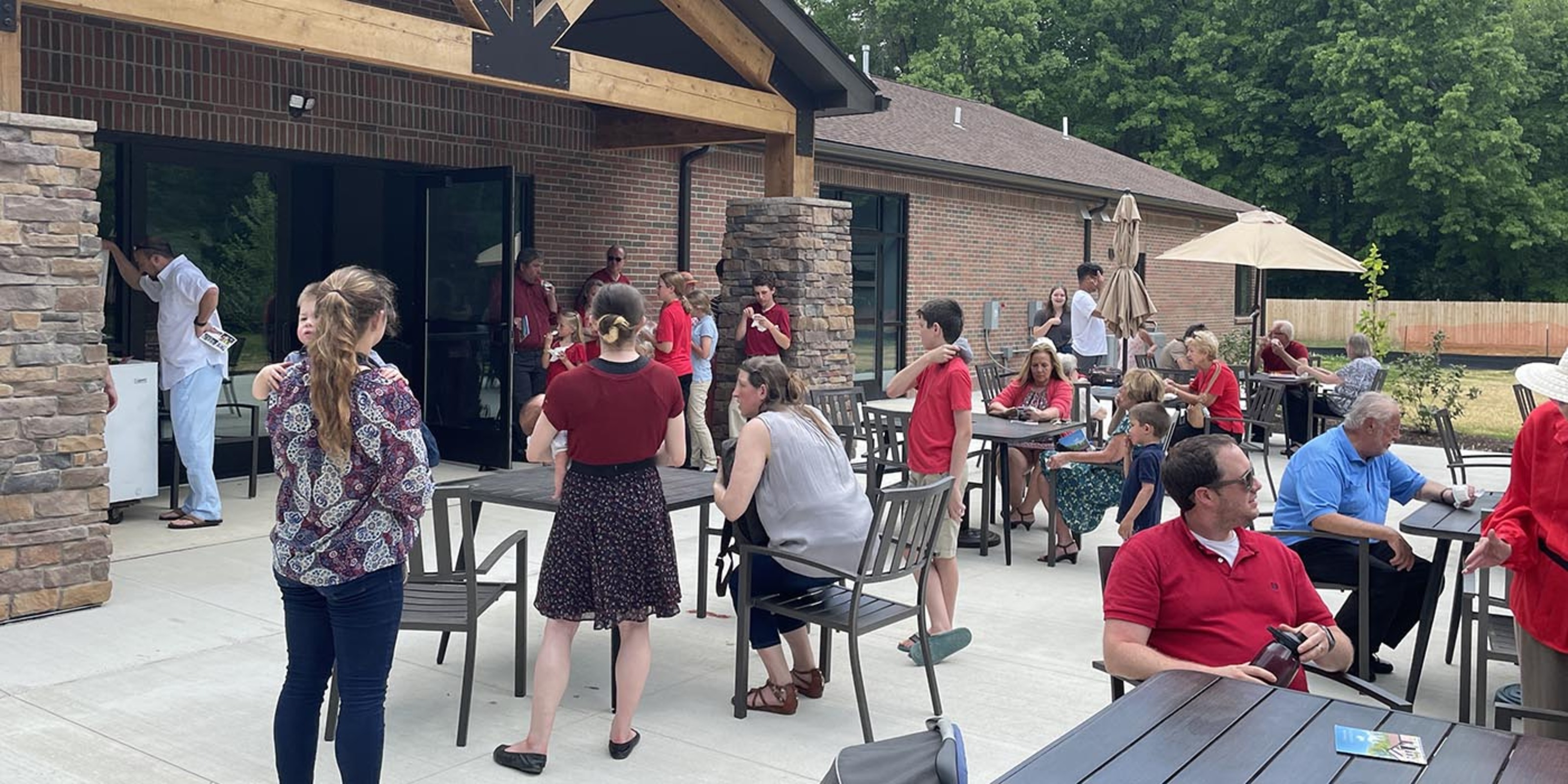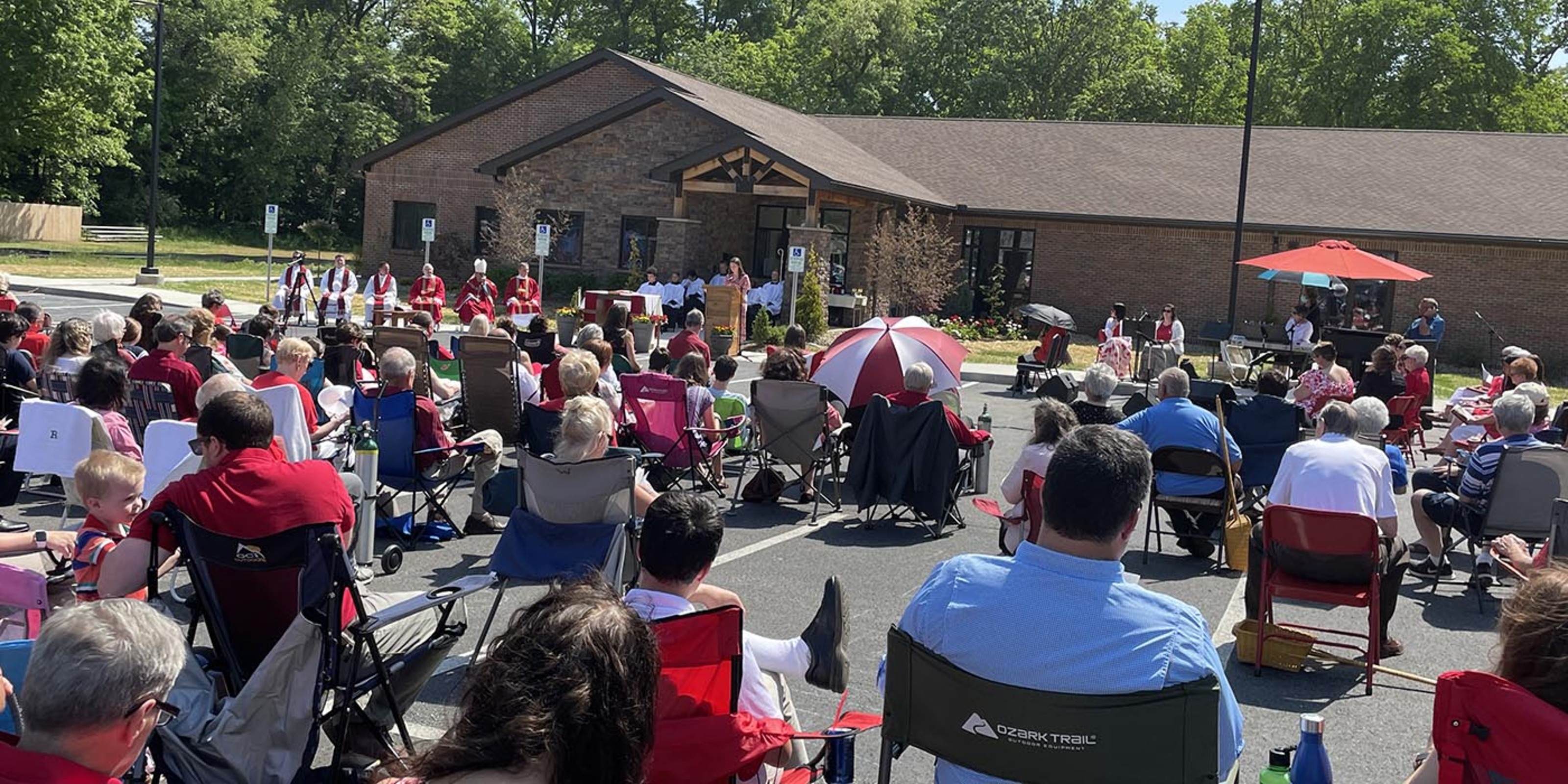 A section of the parking lot in front of the new Memorare Center at St. Francis de Sales Parish in Akron was filled with chairs, not cars, on May 23 as parishioners gathered for Mass and dedication of the building.