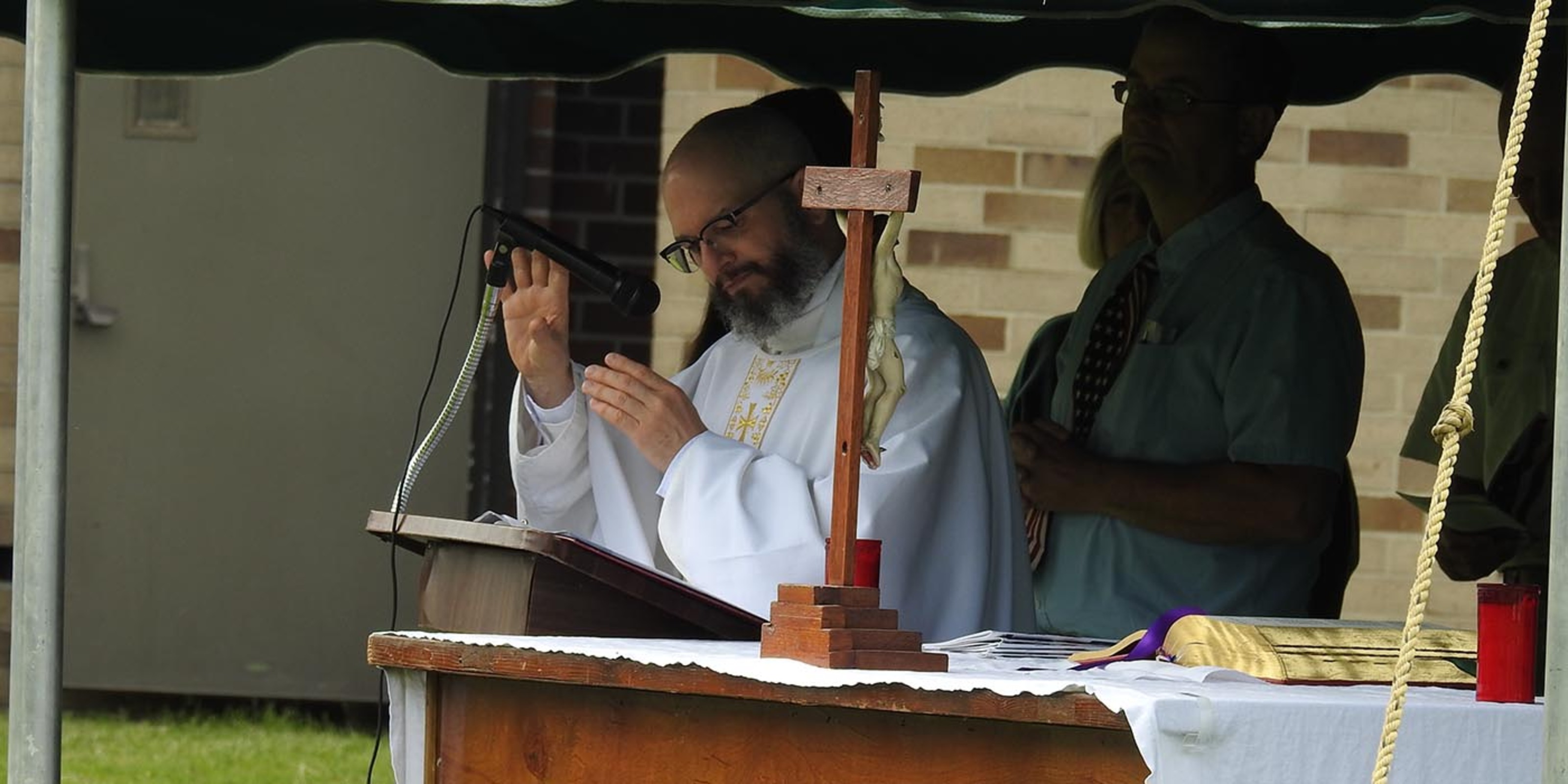 The altar was positioned under a tent, but Father Cox walked out onto the grass to deliver his homily.