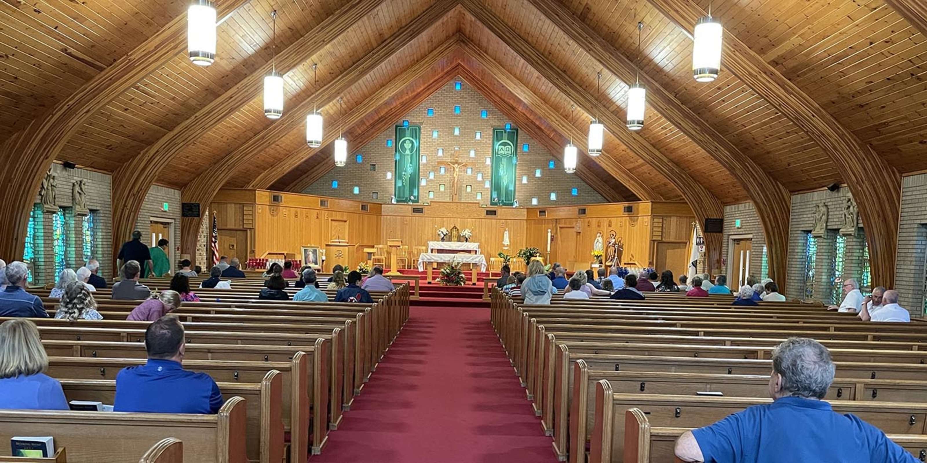 Off-and-on rainstorms on June 19 caused St. Cyprian Parish to move its previously scheduled outdoor vigil Mass into the church. Father George Kusy, the pastor, said normally the faithful of the approximately 700-family parish enjoy attending Mass outdoors in the parish grotto from May through October.
