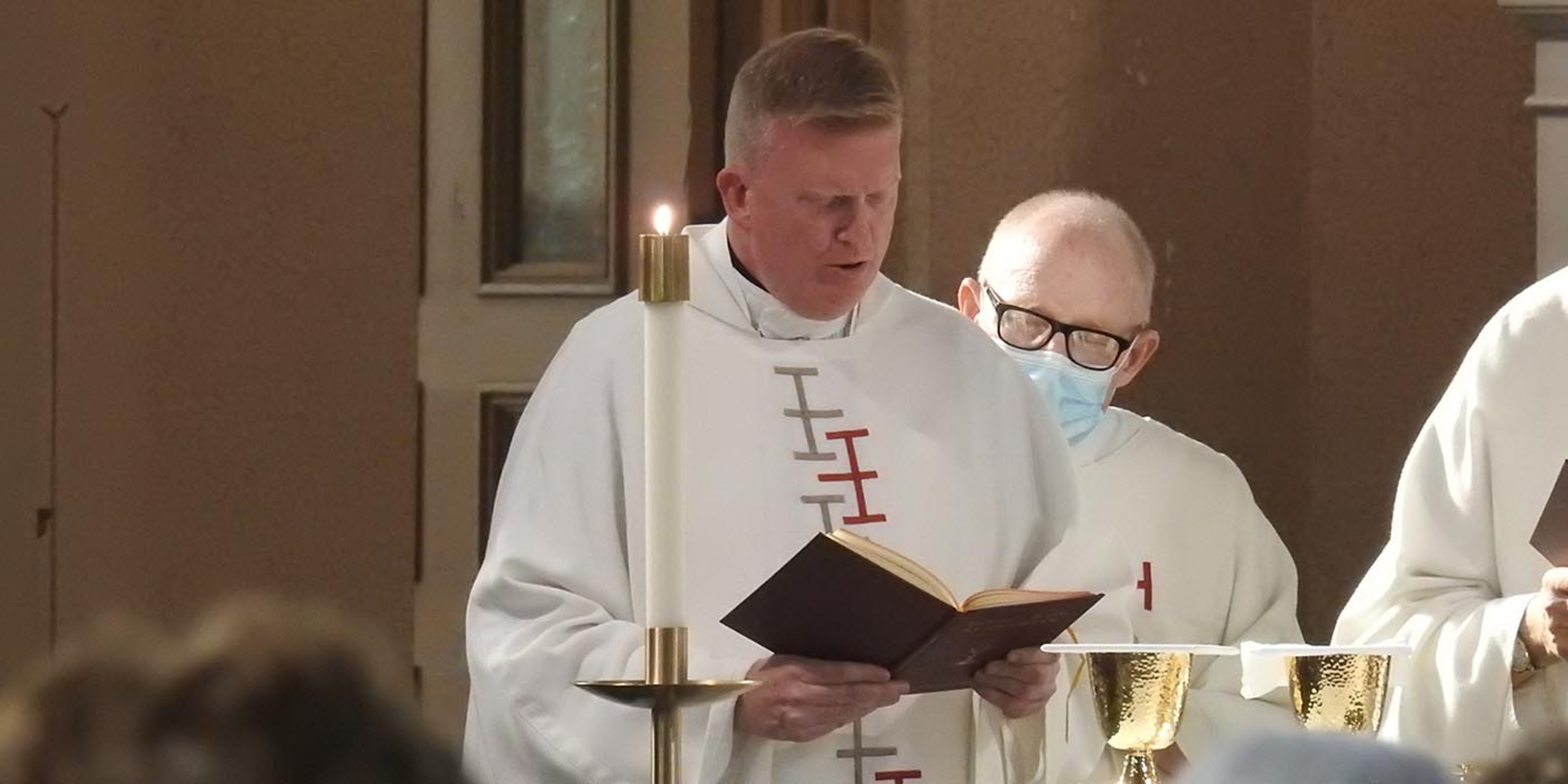 After Mass, the congregation and clergy processed outside where a wreath was placed under the cornerstone and the bishop conducted a brief reblessing ceremony. Father Mark Hollis, Father Dan Reim, SJ from nearby Saint Ignatius High School, and Father James Mayer, O de M, pastor of nearby St. Rocco Parish, concelebrated the Mass.