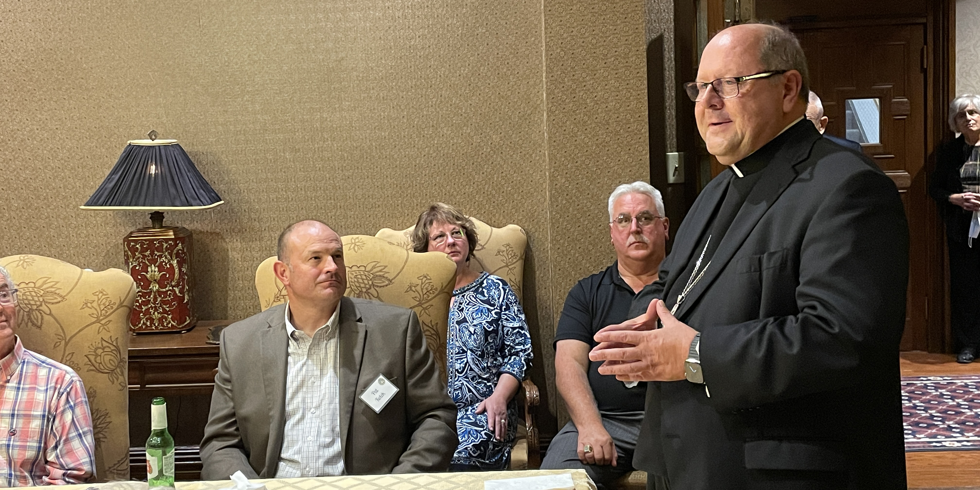 “I’m delighted to welcome you to my home,” Bishop Edward Malesic told the group of about 50 who attended the event. Also present were Father Mike McCandless, diocesan vocation director; Father Alex Spenik, who was ordained in May and serves as parochial vicar at St. Mary Parish, Painesville; seminarian Jeff Lindholm from St. Bernadette Parish, Westlake; and Father Joe Hilinski, pastor, St. Barbara Parish, Cleveland, and the diocesan delegate for ecumenical and interfaith affairs.