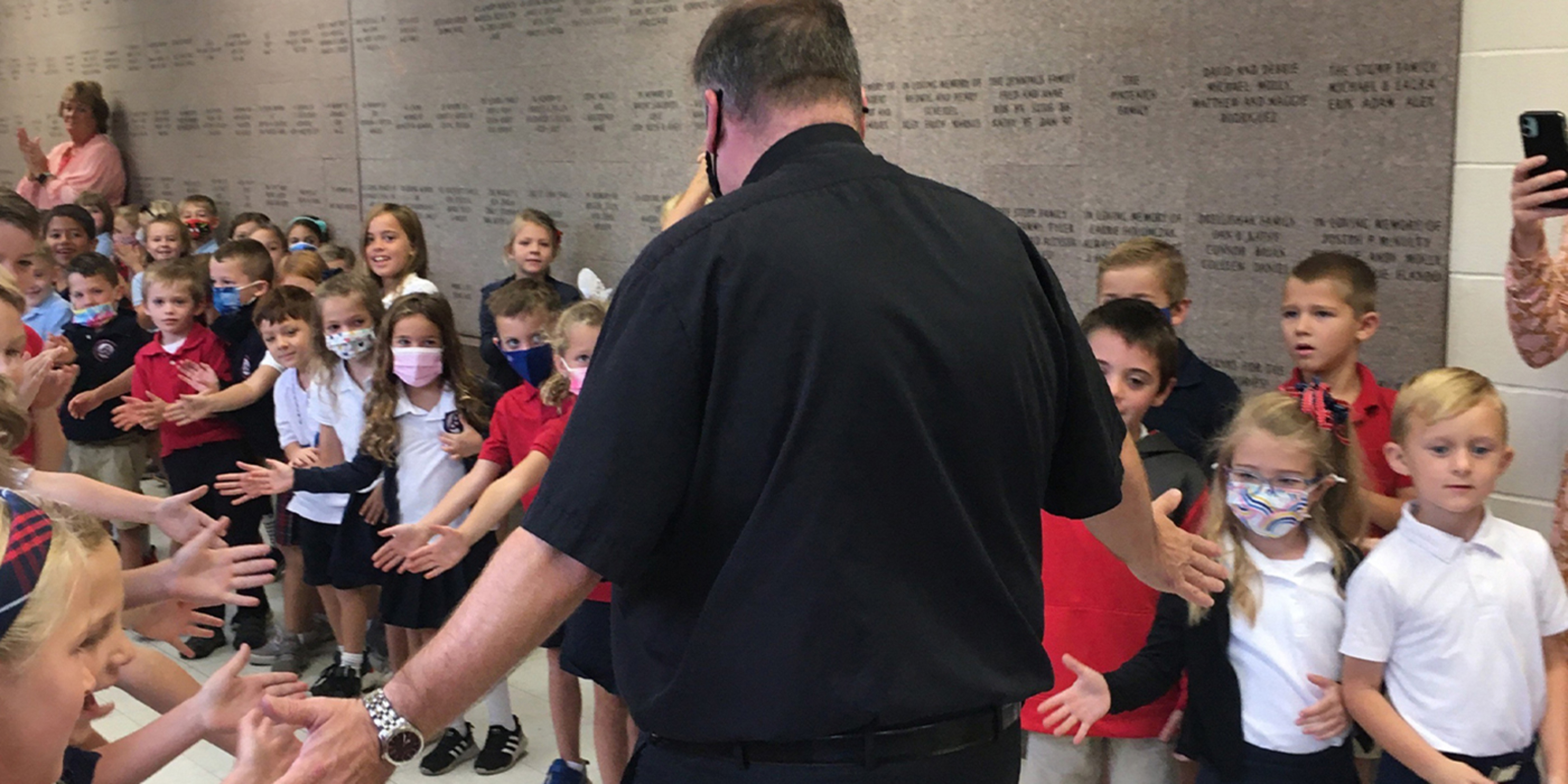 Father Hawk thanked the students, parents and staff at Holy Trinity School and PSR program for a warm welcome as the school year began. He shared how earlier in the day, students surprised him with a “clap in,” lining the hallways, cheering his name and giving high-fives as he entered the building.