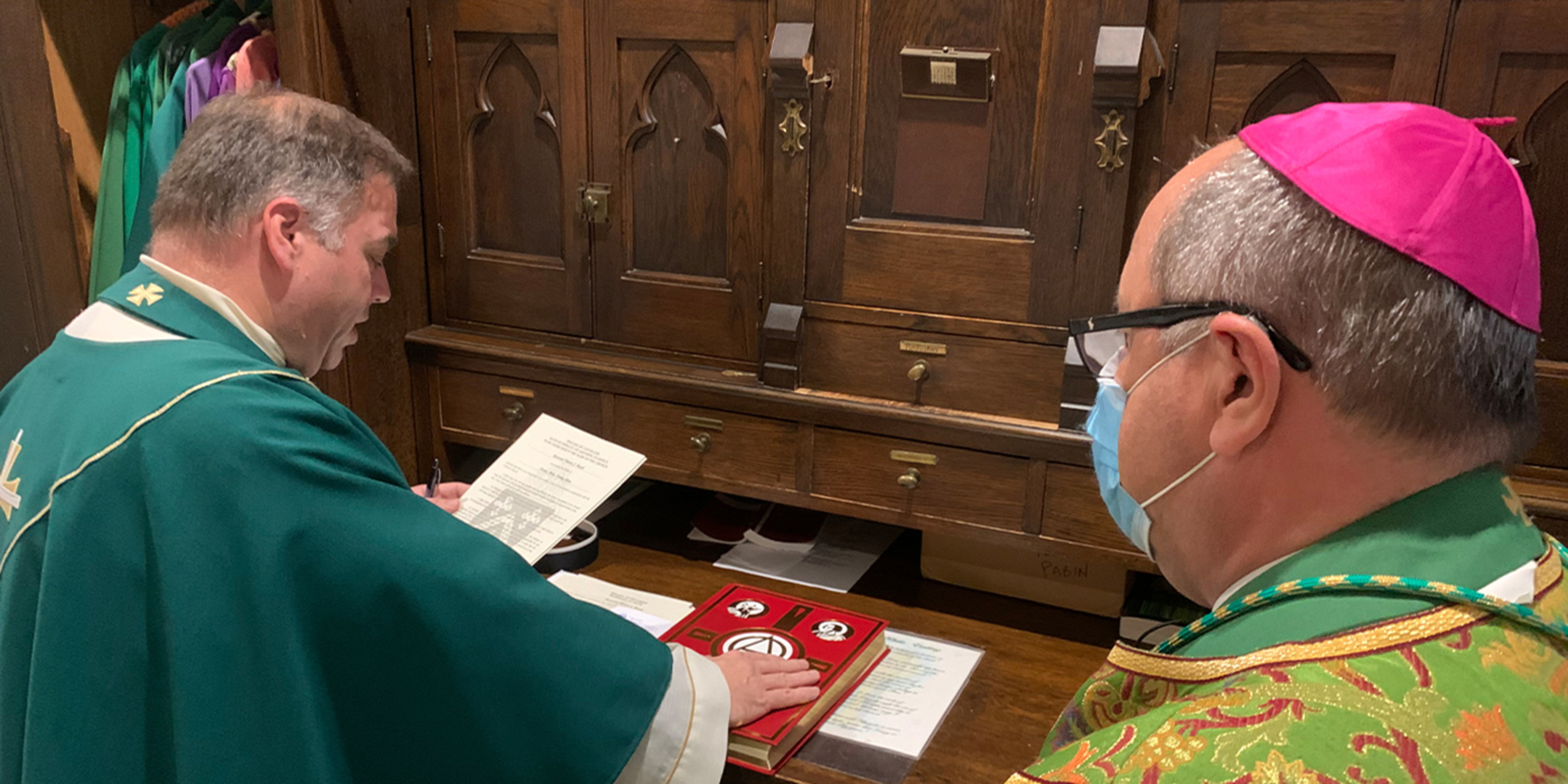 Prior to celebrating the 7 p.m. Mass, Bishop Edward Malesic prayed over Father Hawk, who pledged his loyalty to the Church and signed documents making his appointment official with parish and school administrators, pastors from across Lorain County and priests from his past assignments serving as witnesses.
