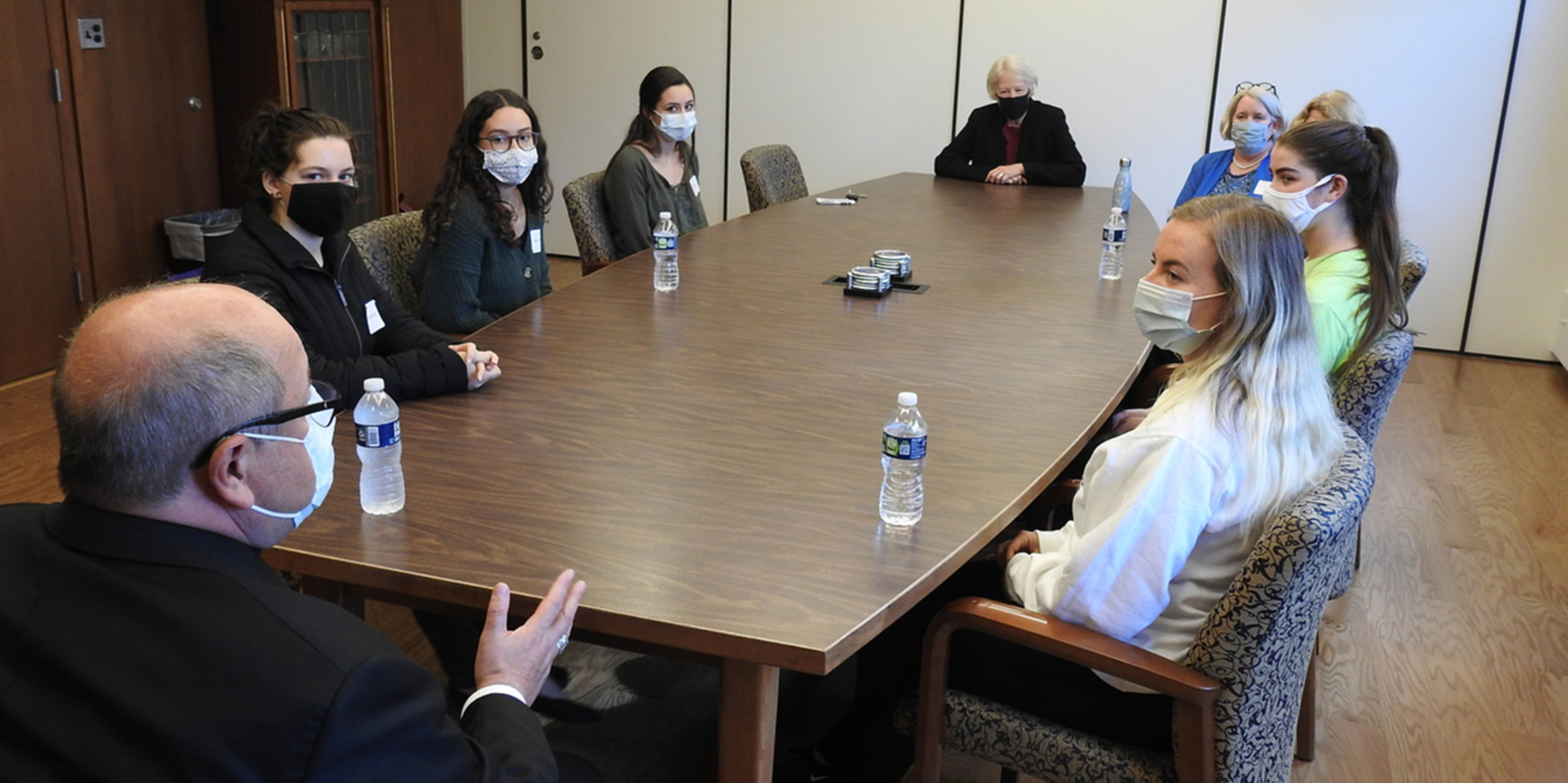 During a recent visit to the college, Bishop Edward Malesic met Sister Christine De Vinne, OSU, college president; Paula Fitzgerald, campus minister; administrators, deans, board members and a group of students. He also had the opportunity to view the college’s original charter, which the college archivist cares for in the library.