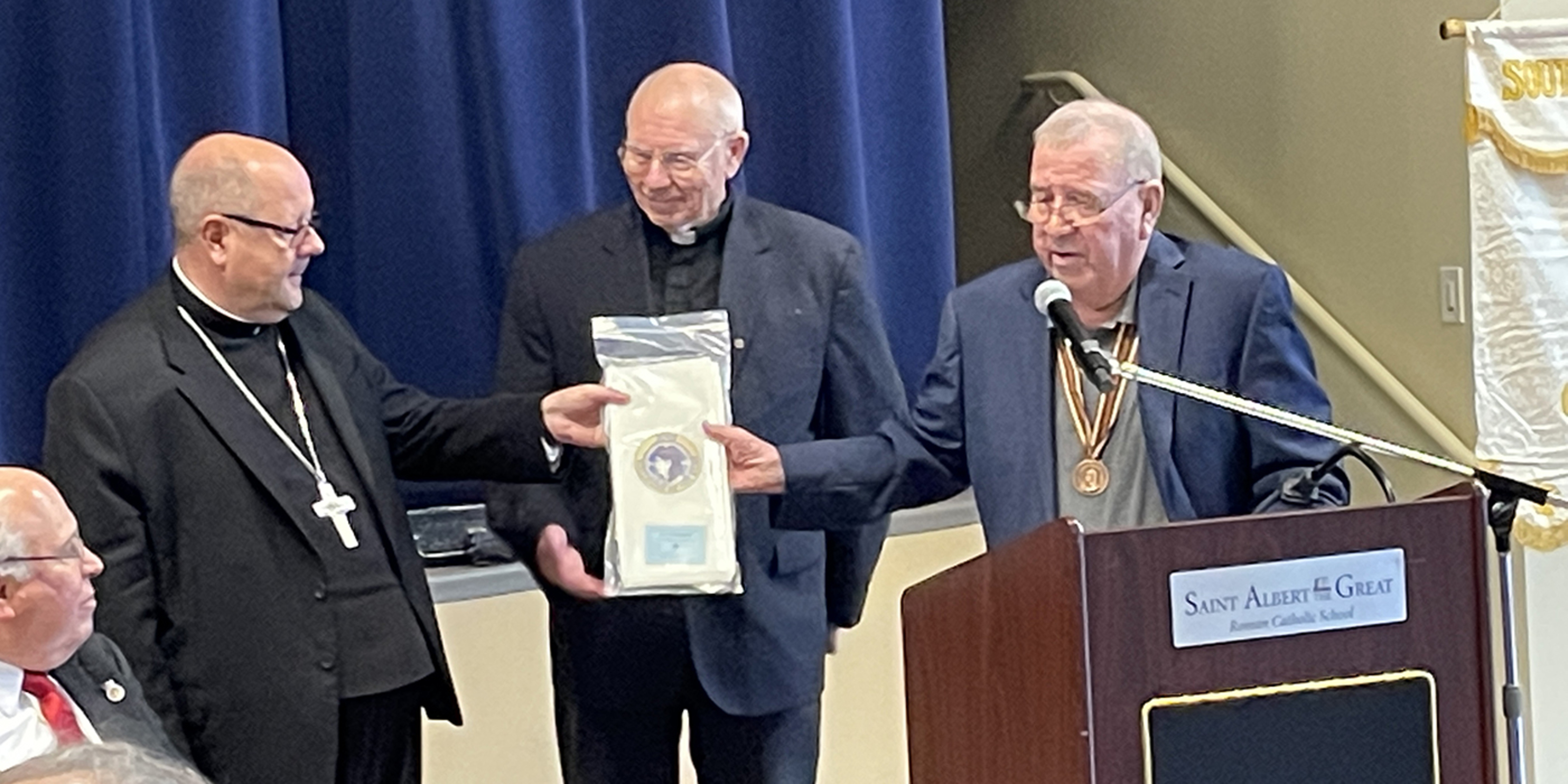 In addition to awards presentations, there were presentations by the bishop, Father Haren, a welcome by Father Ed Estok, St. Albert the Great pastor, and remarks by Jim Joyce, diocesan Holy Name president, and Jerry Bacher, diocesan past president. David Deschler served as master of ceremonies once again and Deacon Joseph Litke, Southwest Deanery spiritual advisor, offered prayer before the meal.