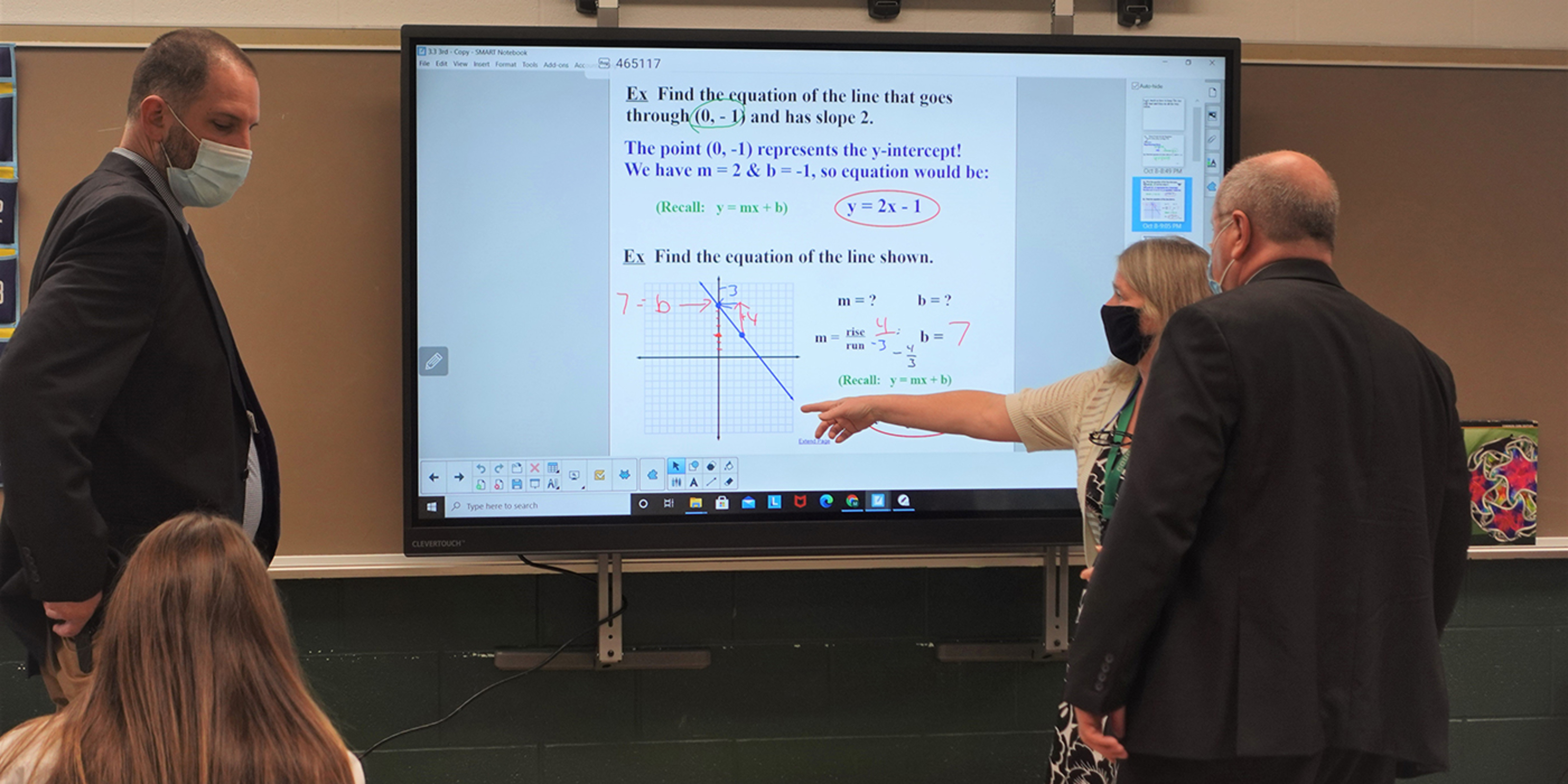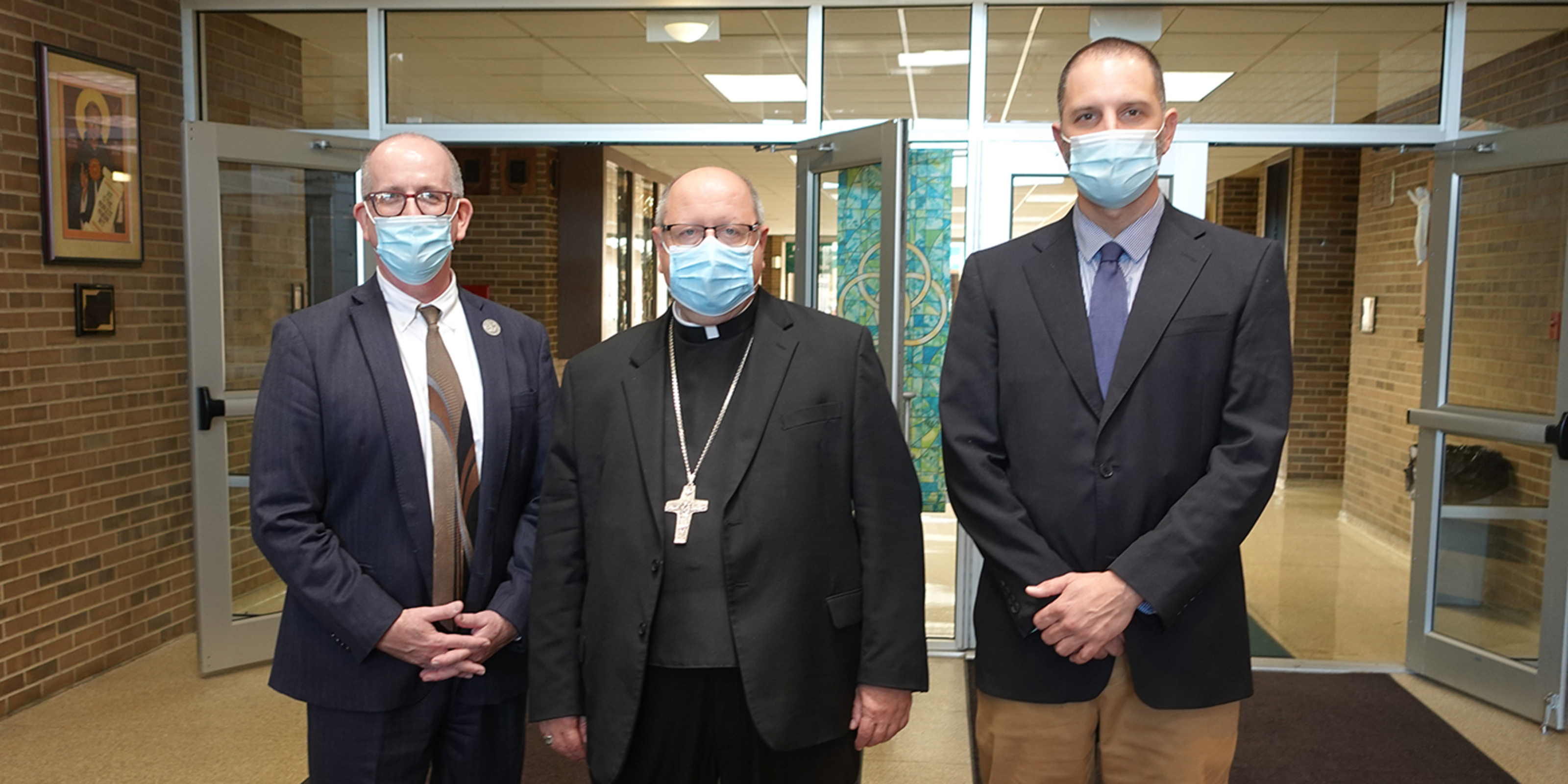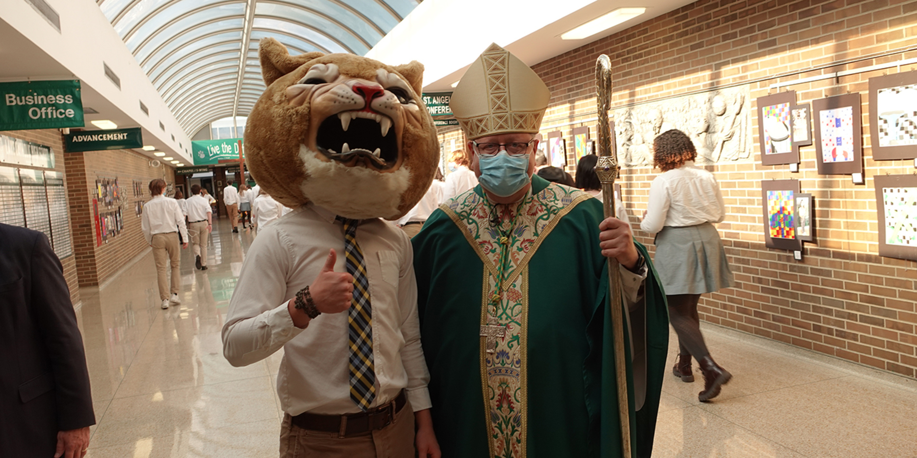 After Mass, Lake Catholic President Mark Crowley presented the bishop with a “swag bag” filled with Cougar gear, including a baseball cap that he modeled. Crowley led the bishop on a tour of the campus, pointing out the chapel and its striking stained-glass window, a digital memorial board, various classrooms with new technology, the media center and displays of student artwork.