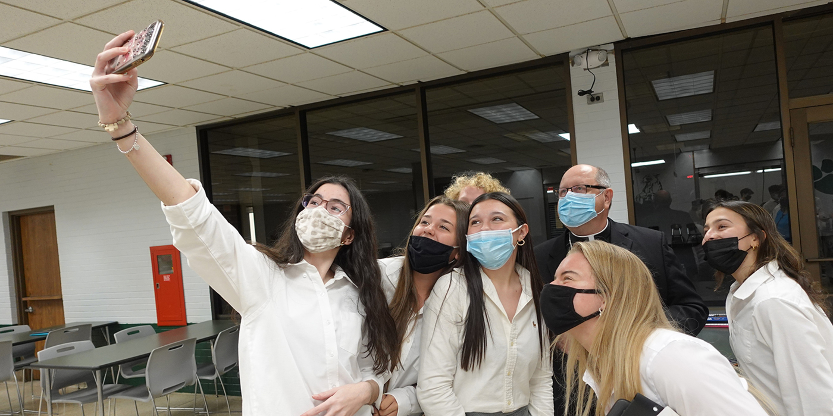 The bishop enjoyed lunch with a group of students and posed for selfies before ending his visit. He also saw the girls volleyball trophy for their recent win in the regional championships. The team will play in the state semifinals on Nov. 12. In recognition of the achievement, Bishop Malesic – with Crowley’s approval – announced there would be no school that day.