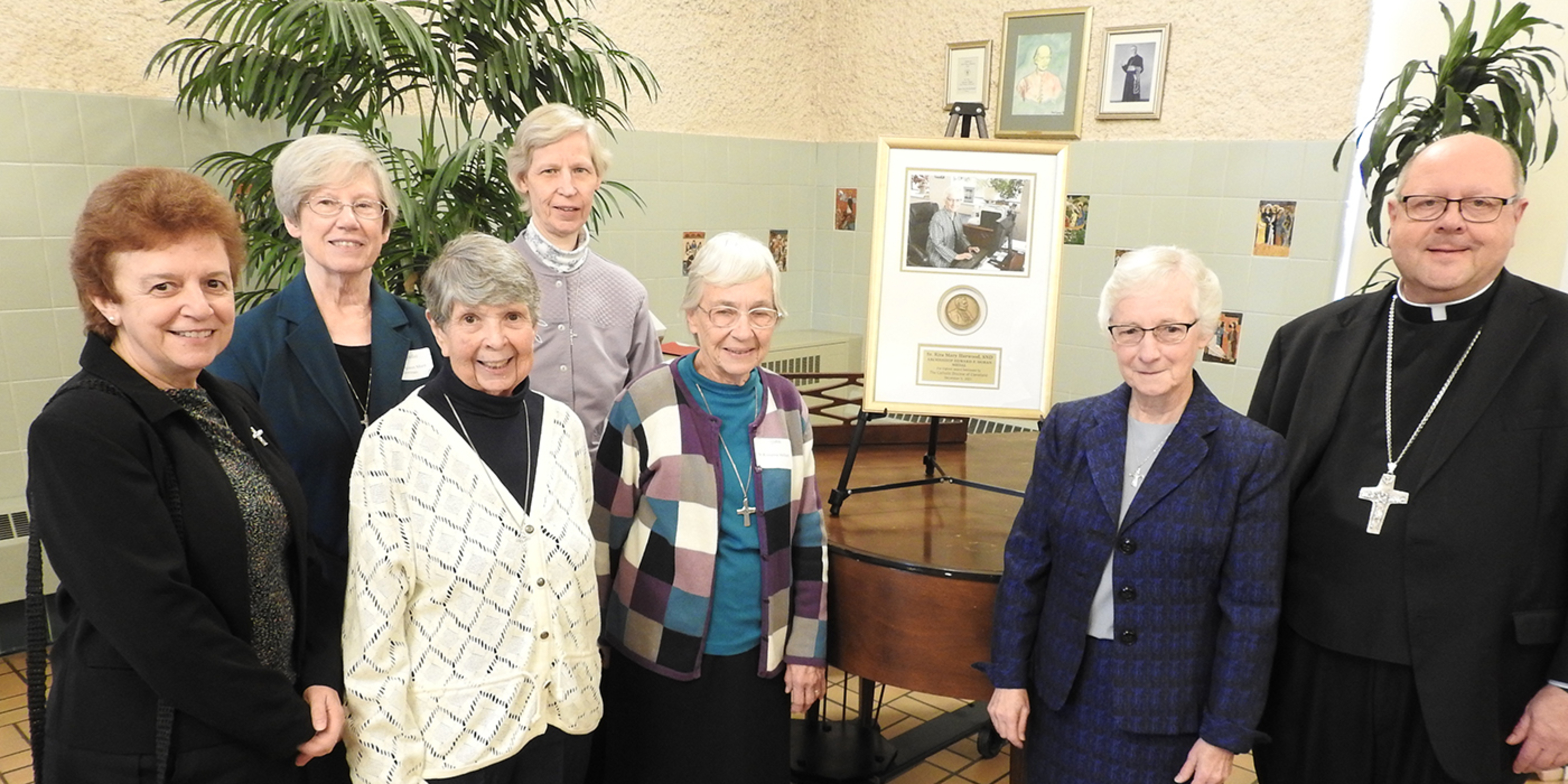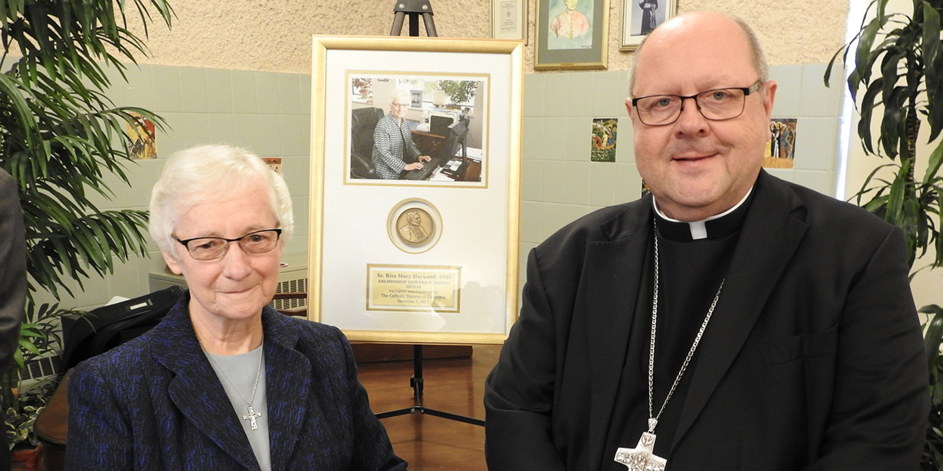On Dec. 5, Sister Rita Mary Harwood, SND, who retired in August after 27 years as secretary for parish life and development, was presented with the Hoban Award by Bishop Edward Malesic.