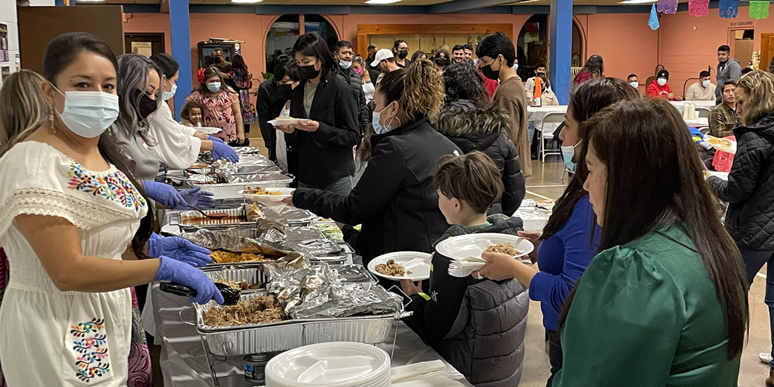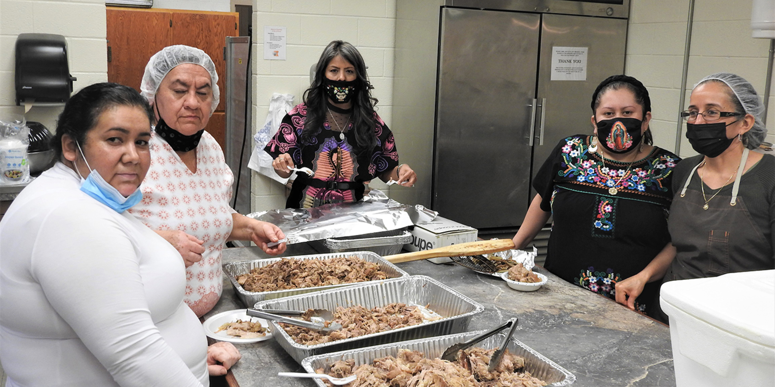In the hall, volunteers were preparing Mexican food for the feast after Mass.