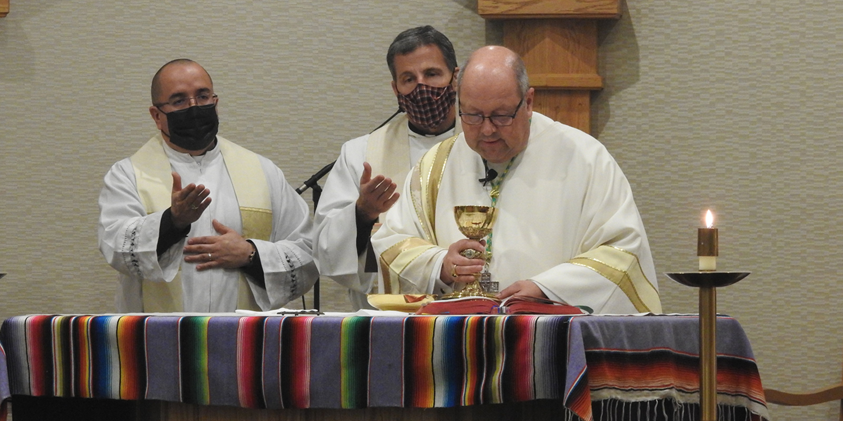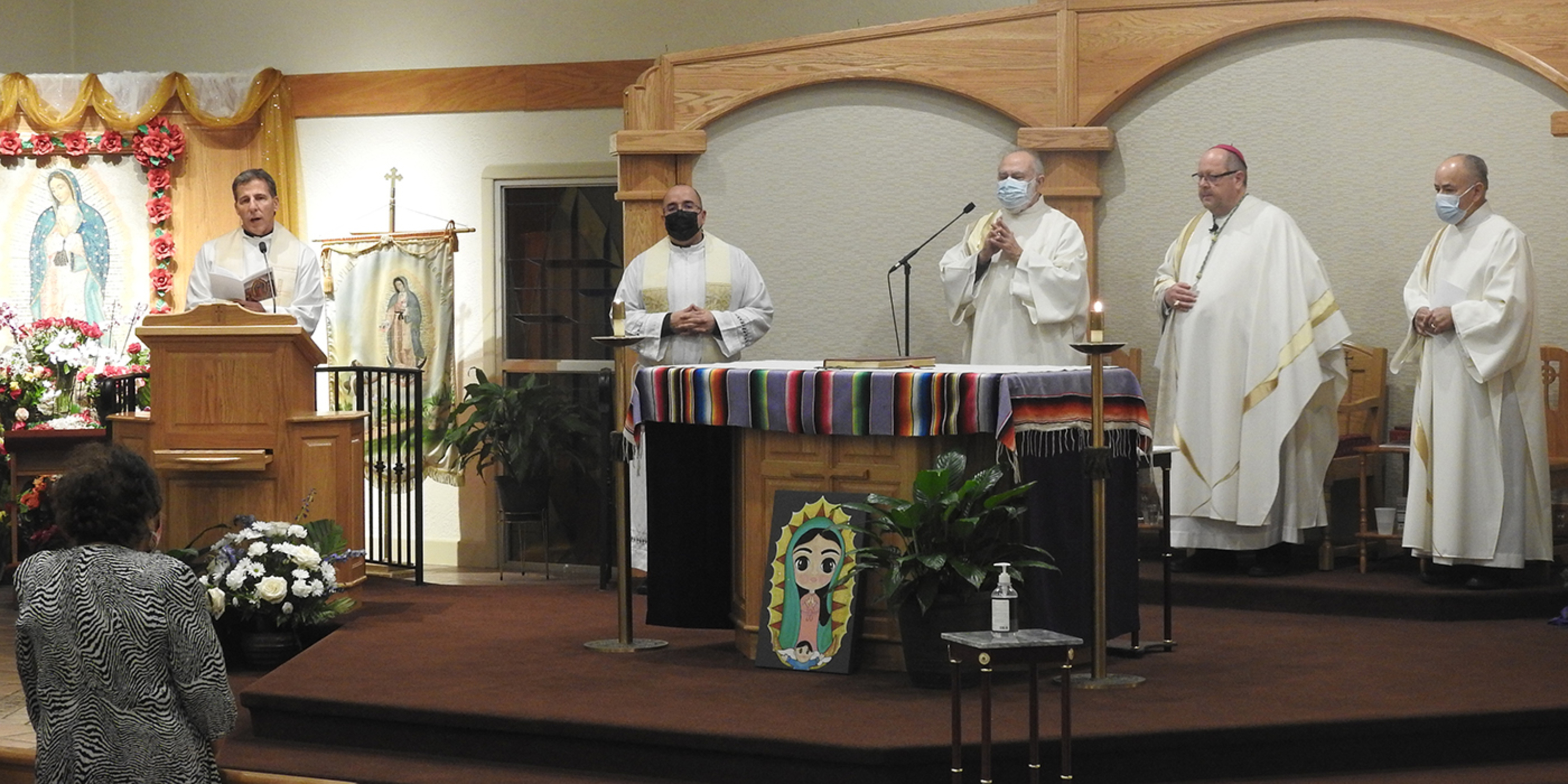 This year, Bishop Edward Malesic celebrated Mass at the Hispanic parish on Dec. 12. Concelebrating were Father Bill Thaden, Sacred Heart pastor, and Father Francisco Honorato Garnica, CSJ, who was installed by the bishop earlier that day as pastor of another Hispanic parish – La Sagrada Familia – in Cleveland. The mariachi band that played at Sagrada Familia also provided music at the Sacred Heart Chapel Mass and celebration.