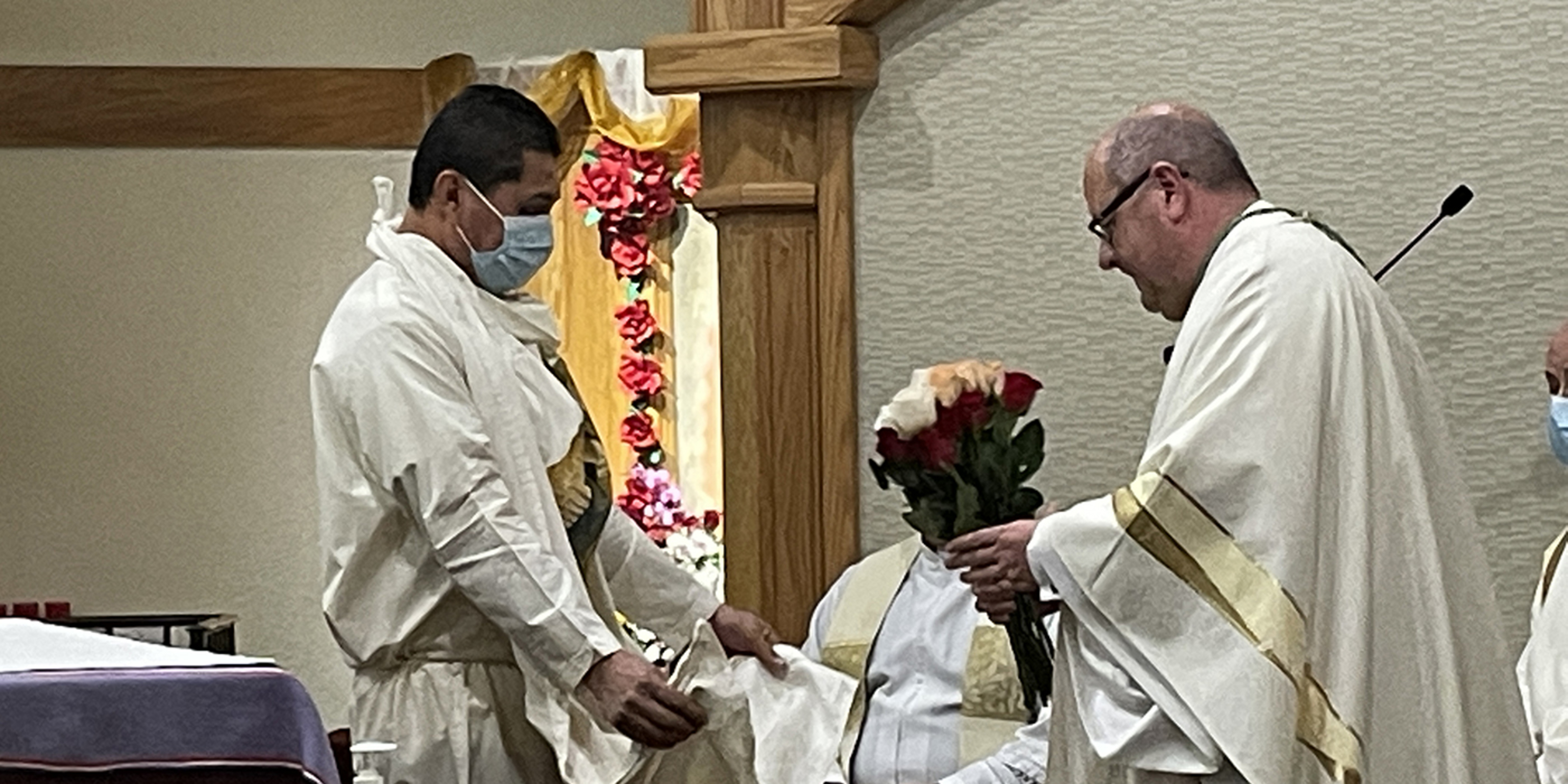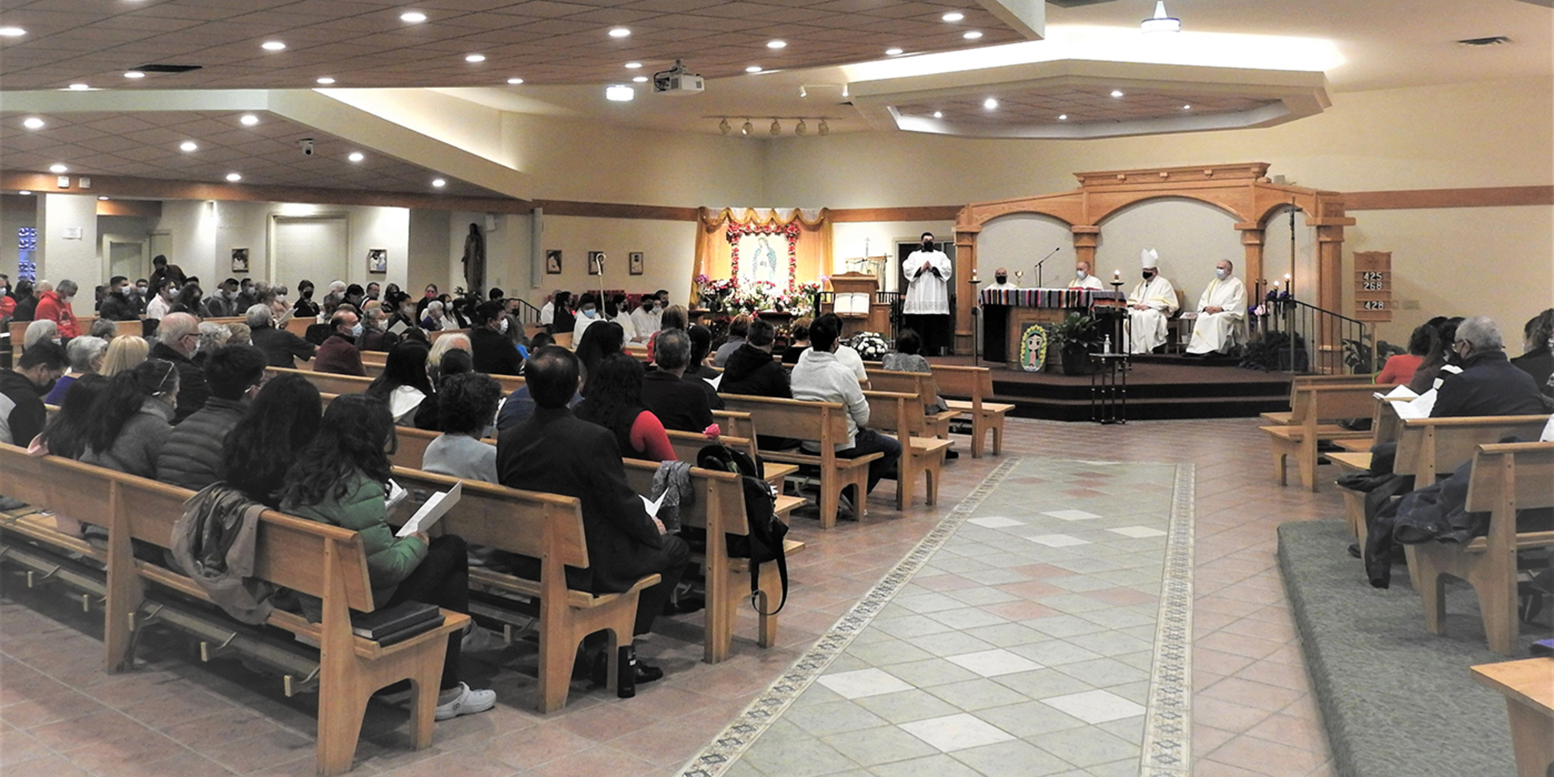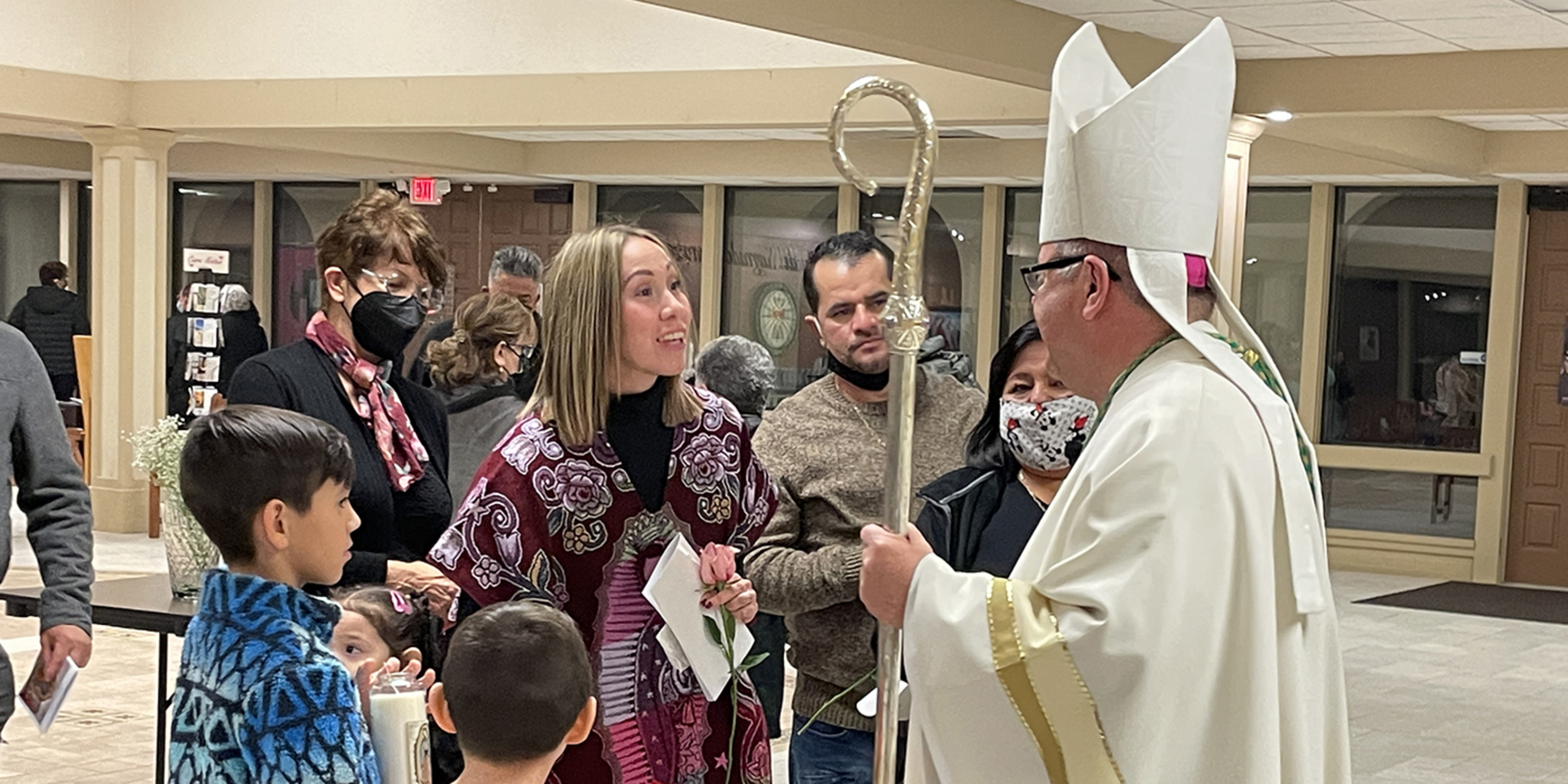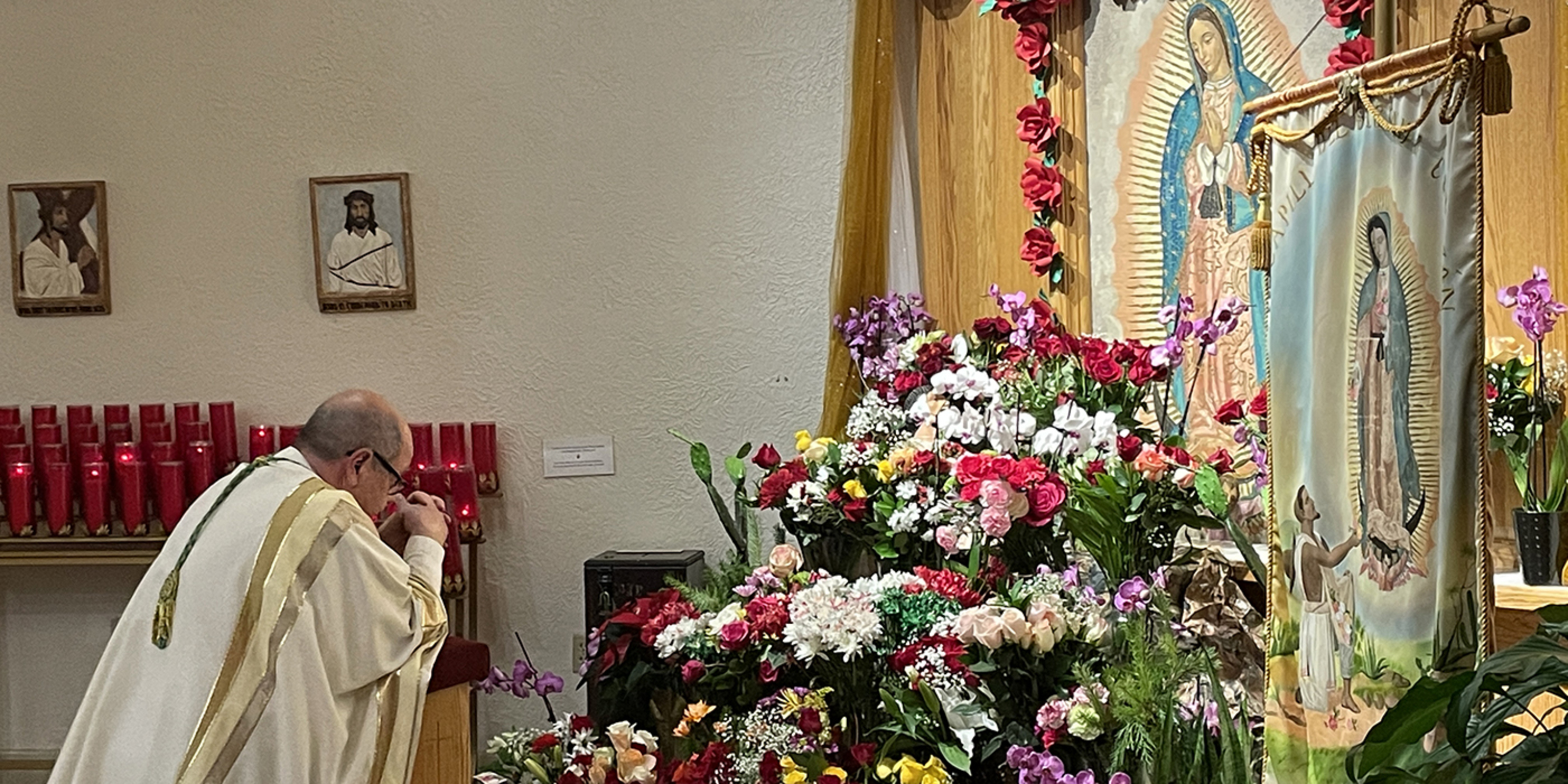 After Communion, a parishioner dressed as Juan Diego and cradling a bouquet of roses in his tilma (cloak), presented the flowers to the bishop, who then walked to the shrine and placed the roses at the feet of the Blessed Mother. He spent a few minutes in silent prayer before returning to the altar to conclude the Mass.