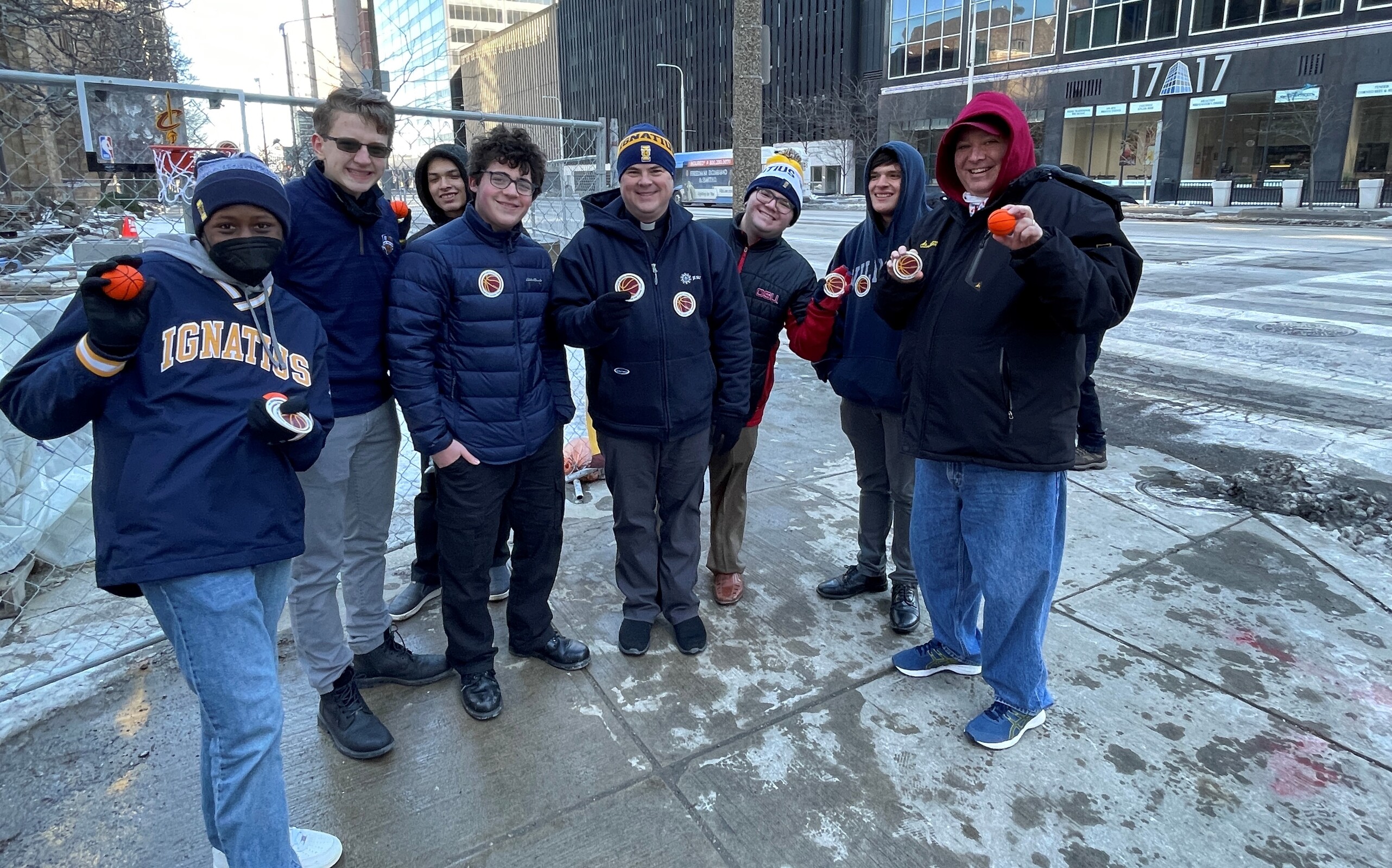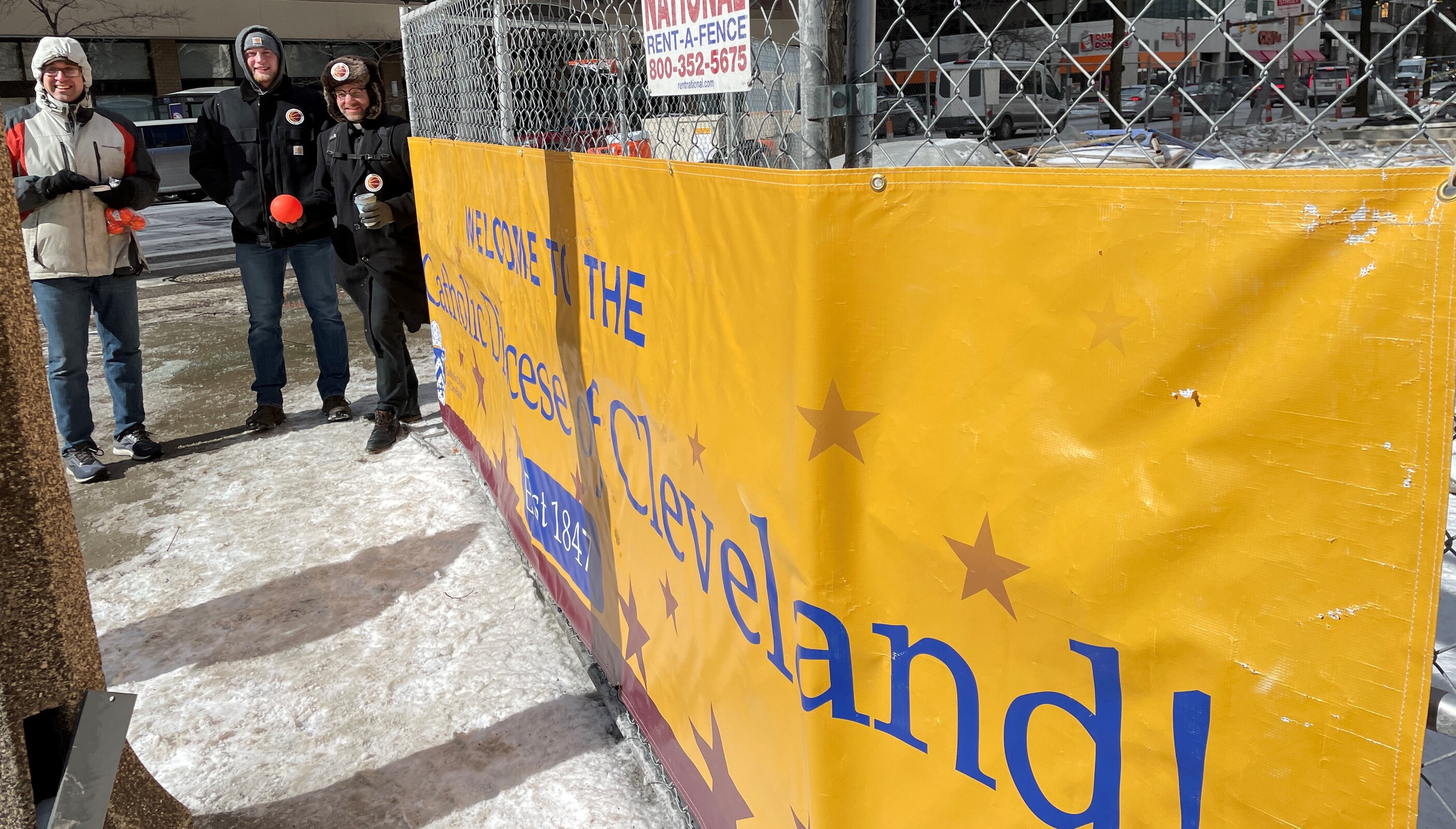 Mike Hayes, director of the Office of Young Adult Ministry; Francine Costantini, director of the Office of Youth Ministry; Miguel Chavez, director of the Office of Missionary Discipleship; and Terri Yohman, director of the Office of Marriage and Family Life recruited volunteers to help work shifts Feb. 19-20 outside the Cathedral of St. John the Evangelist at East Ninth Street and Superior Avenue. A large banner sporting the wine and gold colors of the Cleveland Cavaliers basketball team shared the message of the diocese’s 175th anniversary.