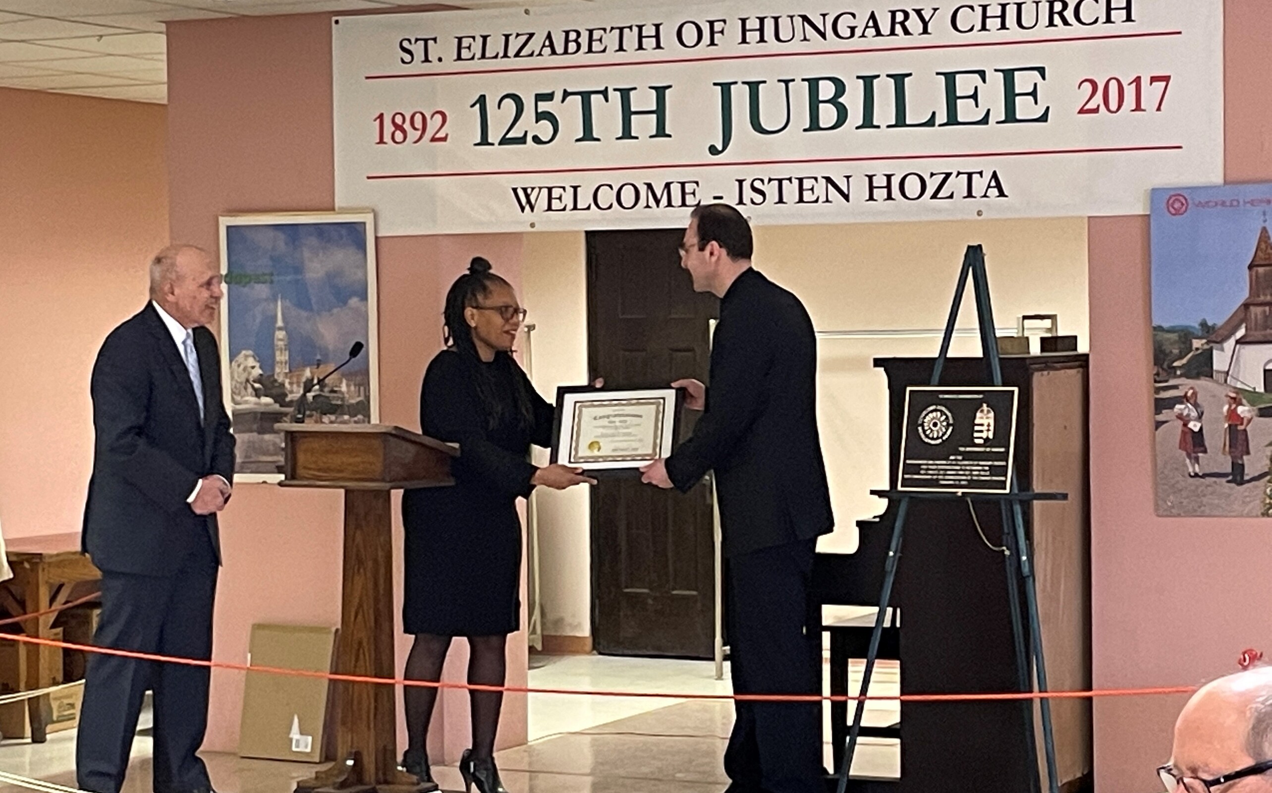 A brass plaque recognizing the significant contributions of the Hungarian government, Cleveland Hungarian Development Panel, parishioners and friends of the parish for the refurbishing of the bell and celebration of the centennial anniversary of the church dedication will be placed in the church.