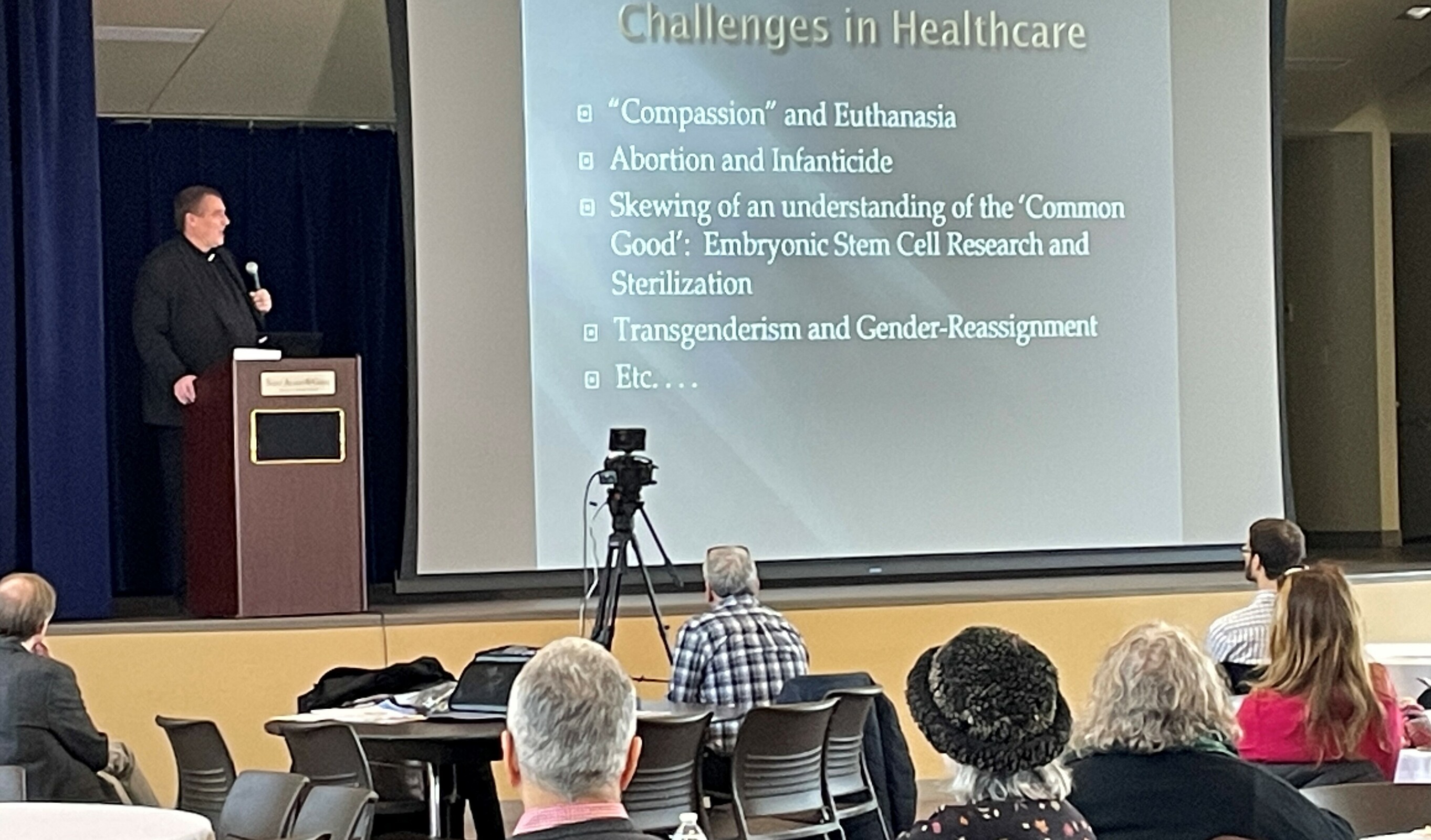 The first speaker, Father Joseph Koopman, vice rector and professor of moral theology at Saint Mary Seminary and Graduate School of Theology, set the stage for the conference. He explored how the truth of Christian love embraced by Catholic values runs counter to false notions of love that often are perpetuated in certain realms of society and medicine to support anti-life practices such as euthanasia and abortion.
