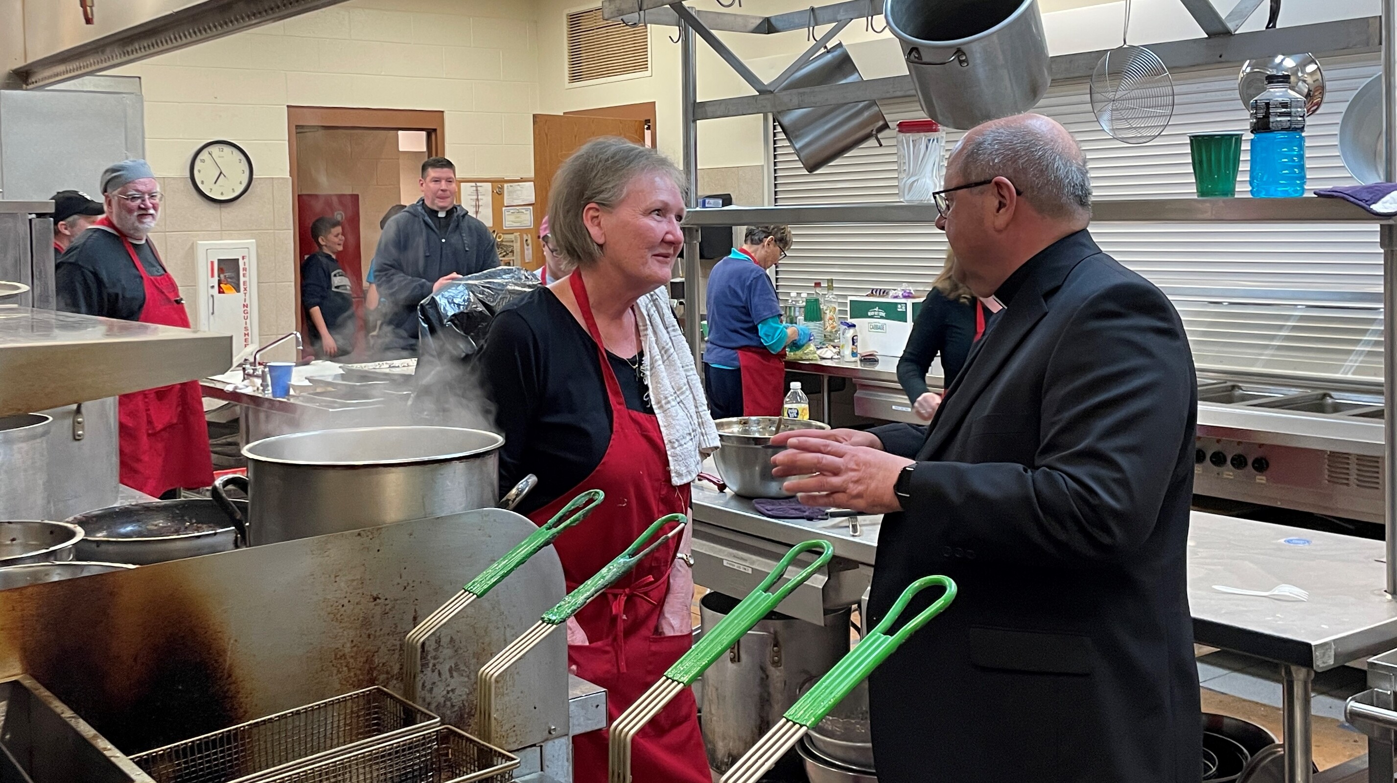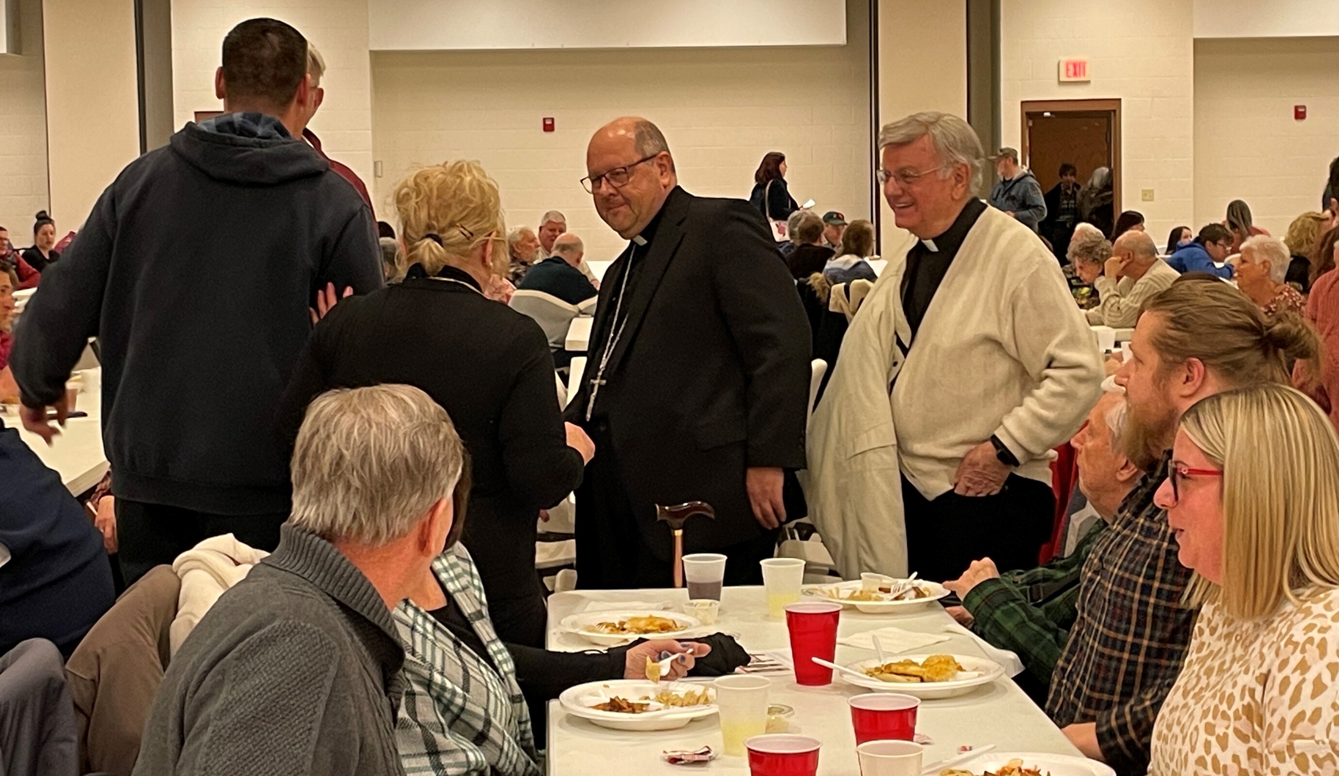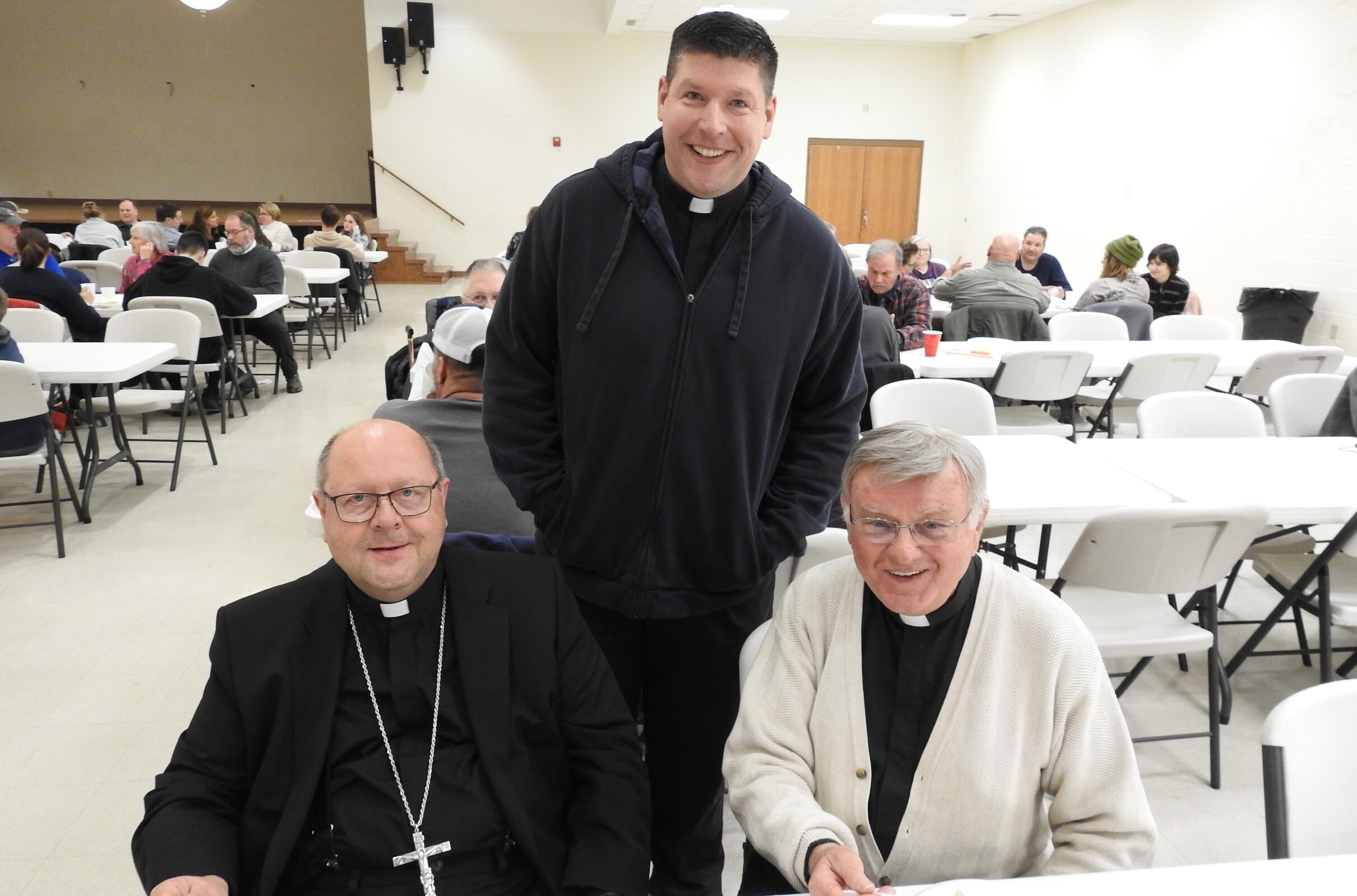 The bishop made a few brief remarks after the Stations before heading to the parish hall to sample the fish fry. He chatted with volunteers in the kitchen and those serving customers. The meal included baked perch, macaroni and cheese, two kinds of pierogi – sauerkraut and potato and cheese – cabbage and noodles, fries and coleslaw. Father Gerald Keller, pastor emeritus who served the parish 1974-2008 and after whom the parish hall is named, joined Father Butkowski and the bishop for the fish fry.