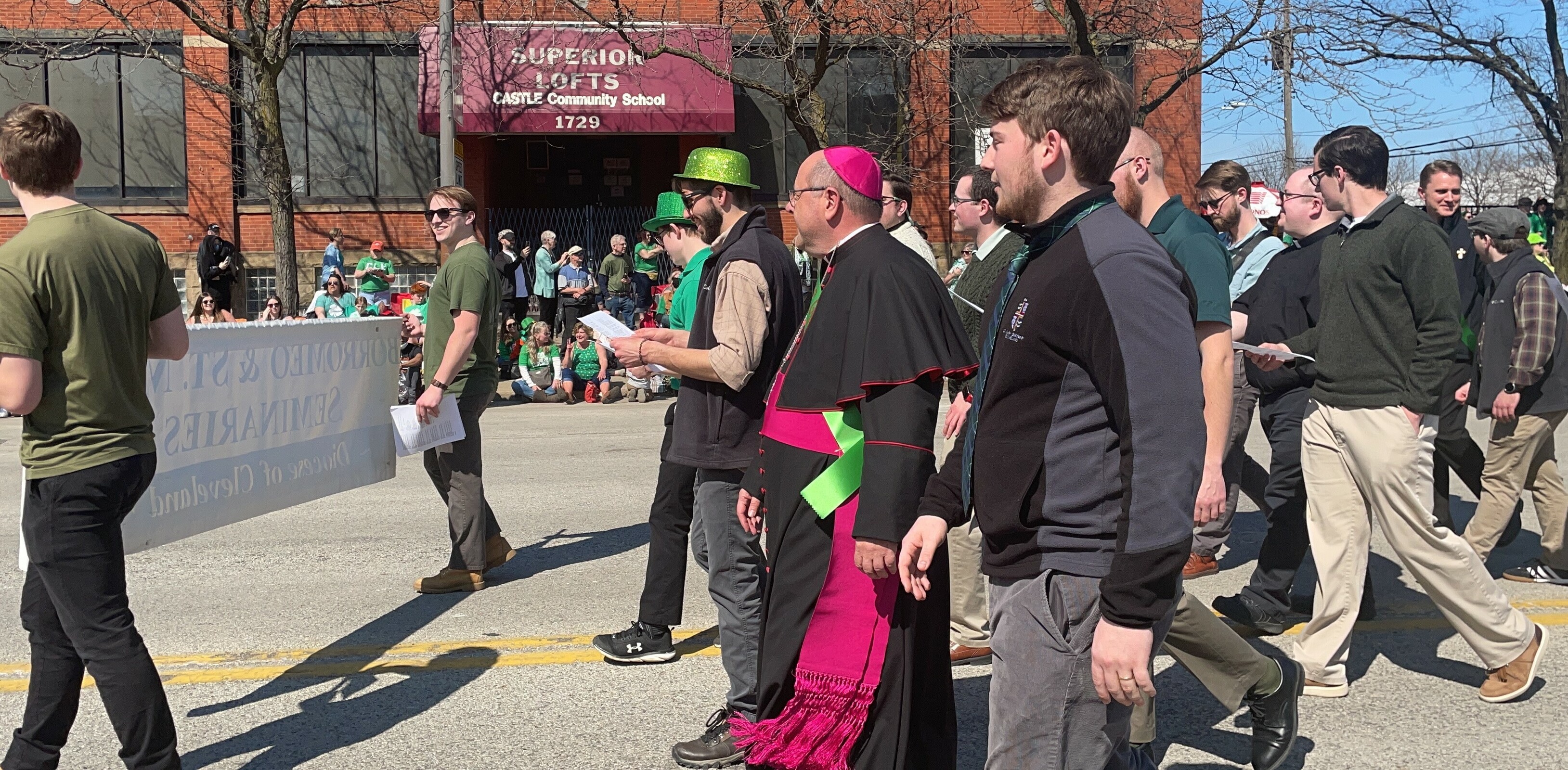 Prior to the parade, Bishop Malesic mingled for a few minutes with the crowd lining Superior Avenue for the festivities. Then he gathered with other dignitaries and honorees to bless the parade, which stepped off from East 18th Street and Superior, marched west on Superior to Public Square, then turned onto Rockwell Avenue before disbanding. The bishop walked in the parade for a while, joining seminarians from Borromeo and Saint Mary seminaries.