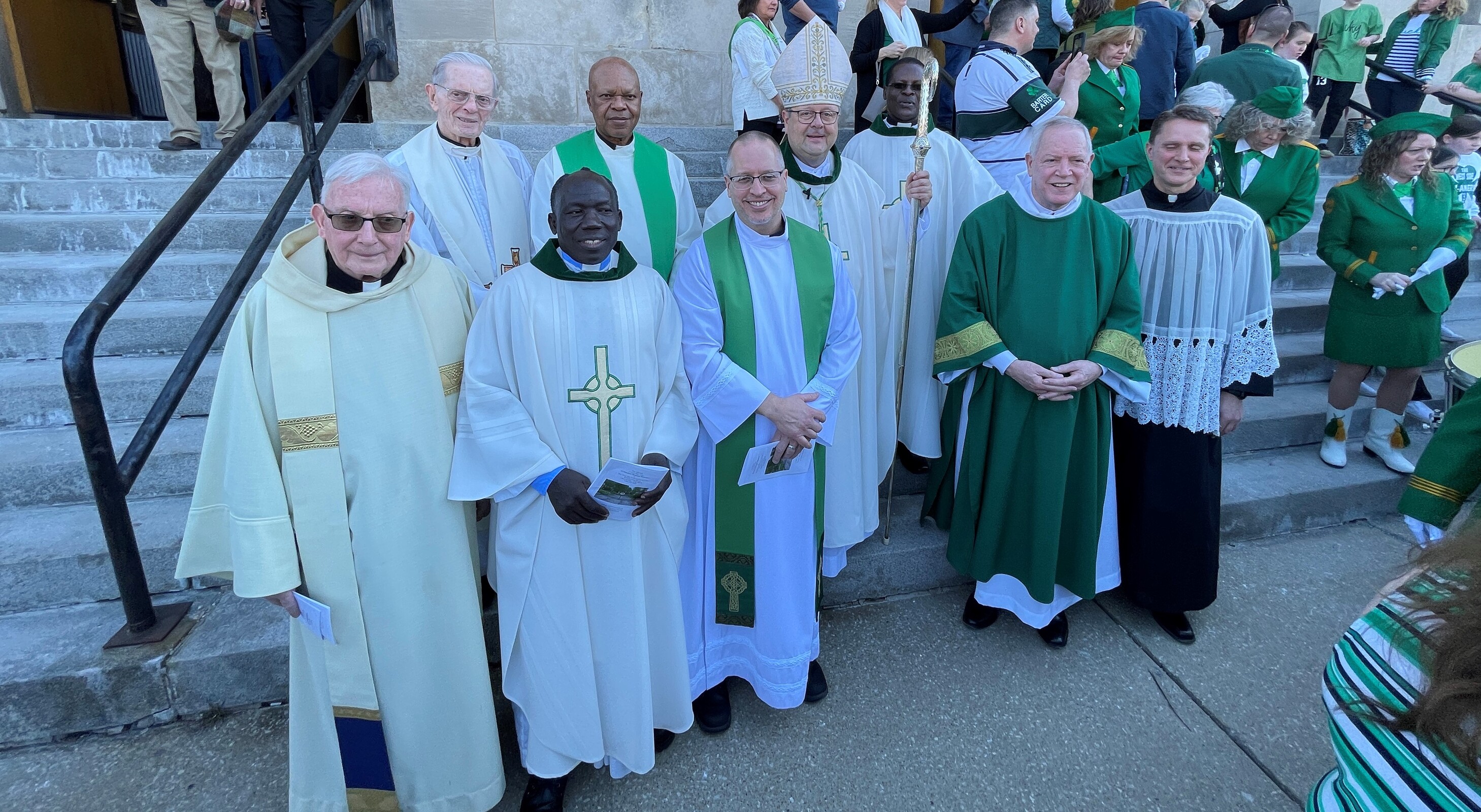 Members, honorees, parade units and friends of the West Side Irish American Club gathered for the annual pre-parade liturgy. There were about a dozen concelebrants included Father Caroli Shao, AJ, St. Colman pastor; Father Benjamin Koka, AJ, St. Colman parochial vicar; and Father Thomas Mahoney, a retired diocesan priest and Hibernian of the Year.