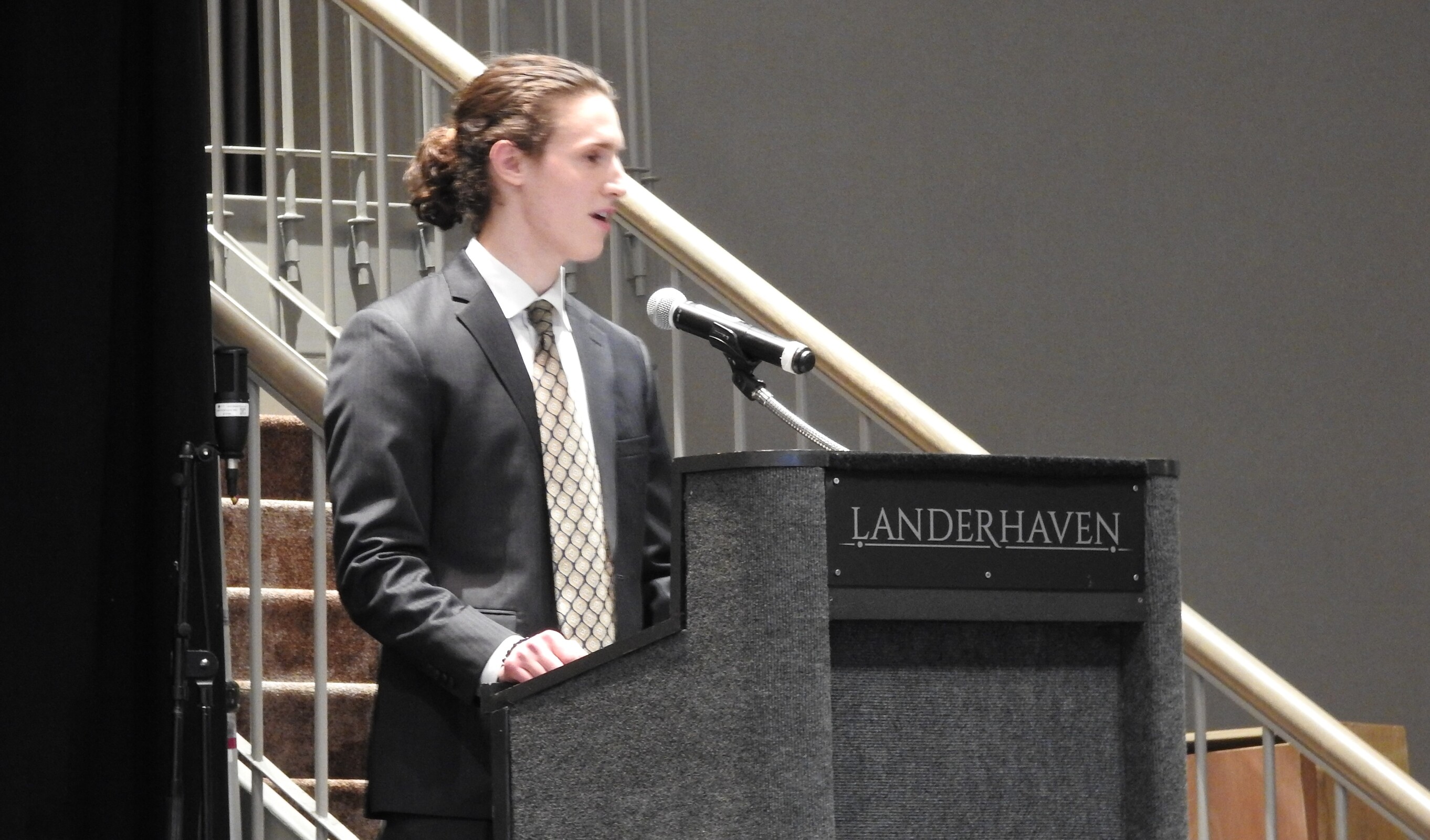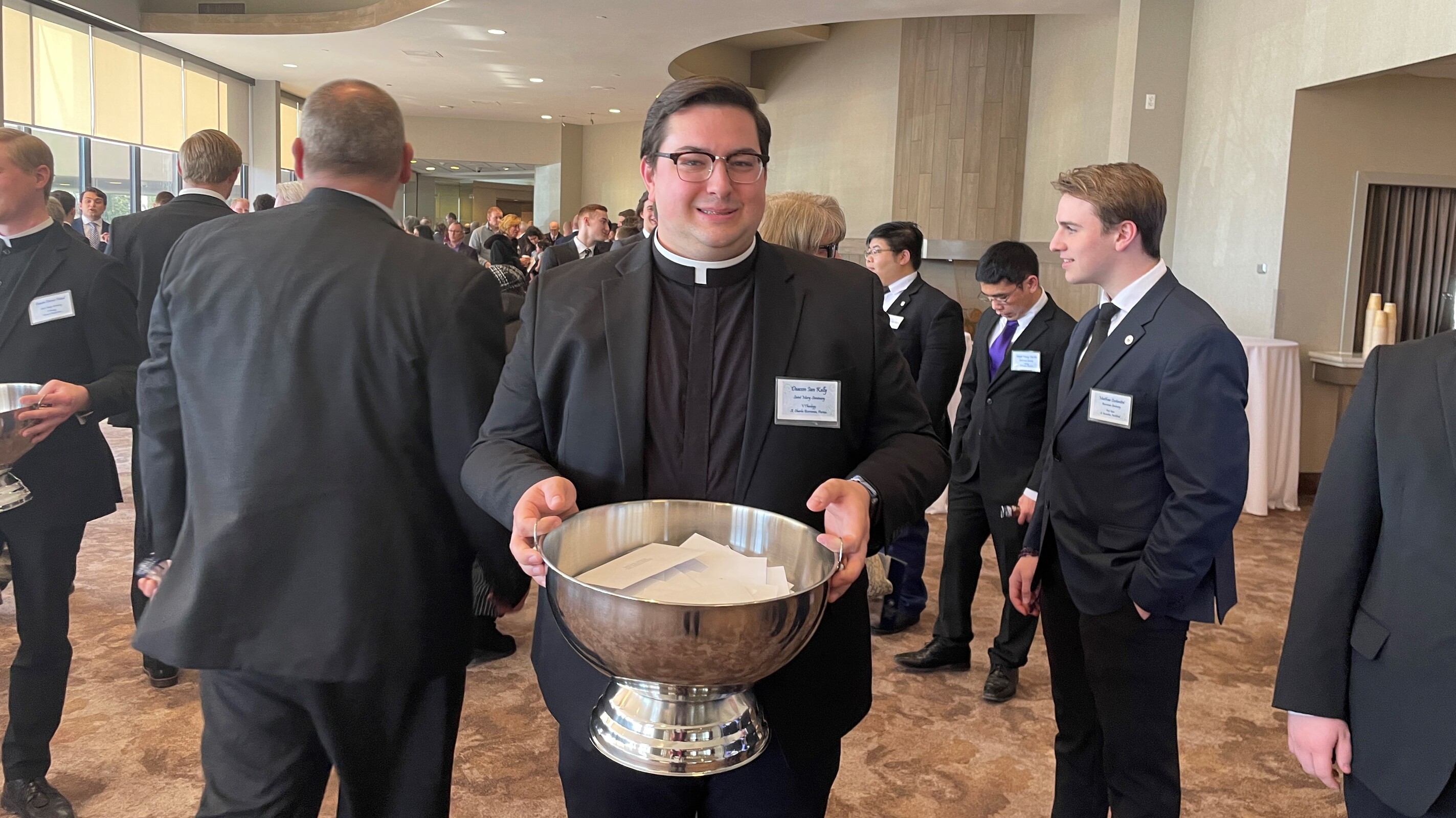 Seminarians formed two lines outside the ballroom and as guests left, they were invited to drop pledge envelopes in the large silver bowls held by some of the seminarians.