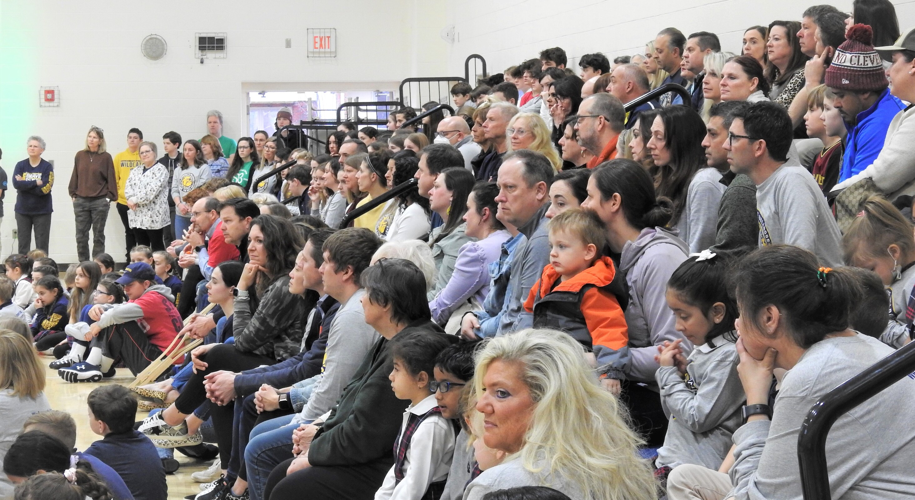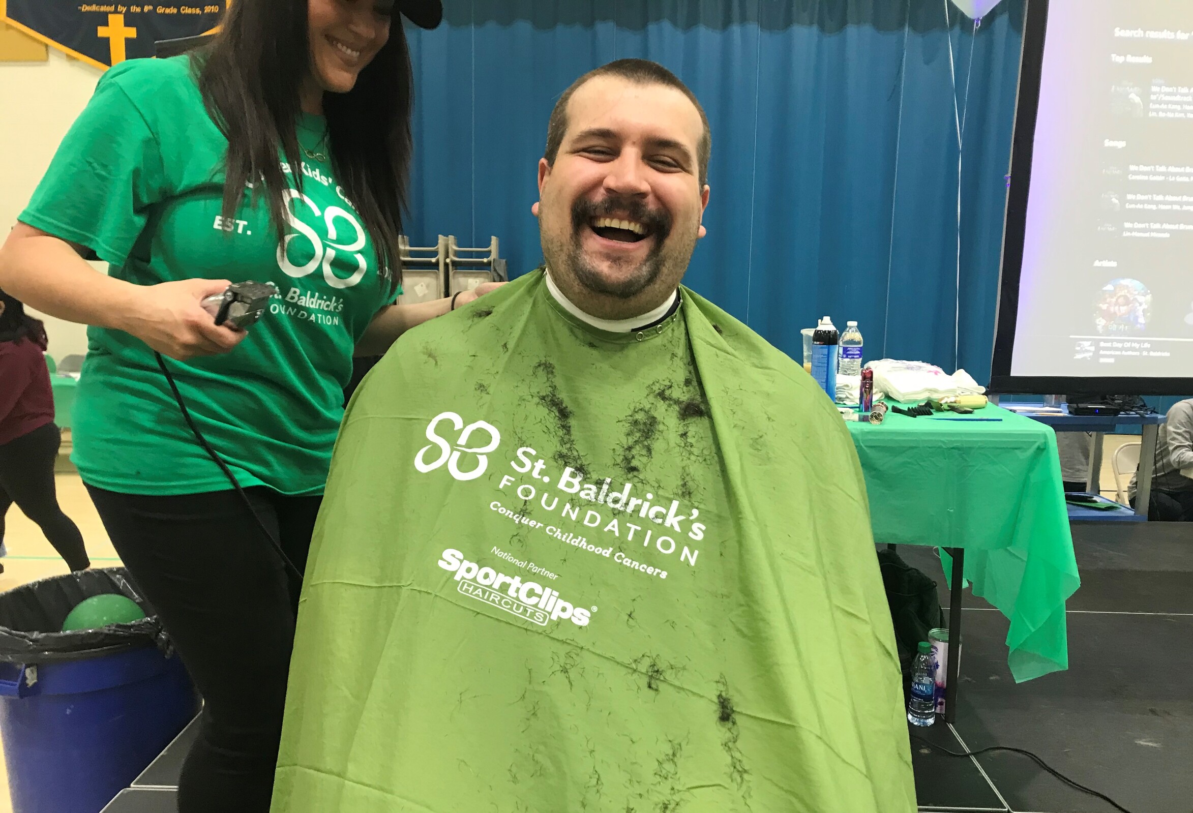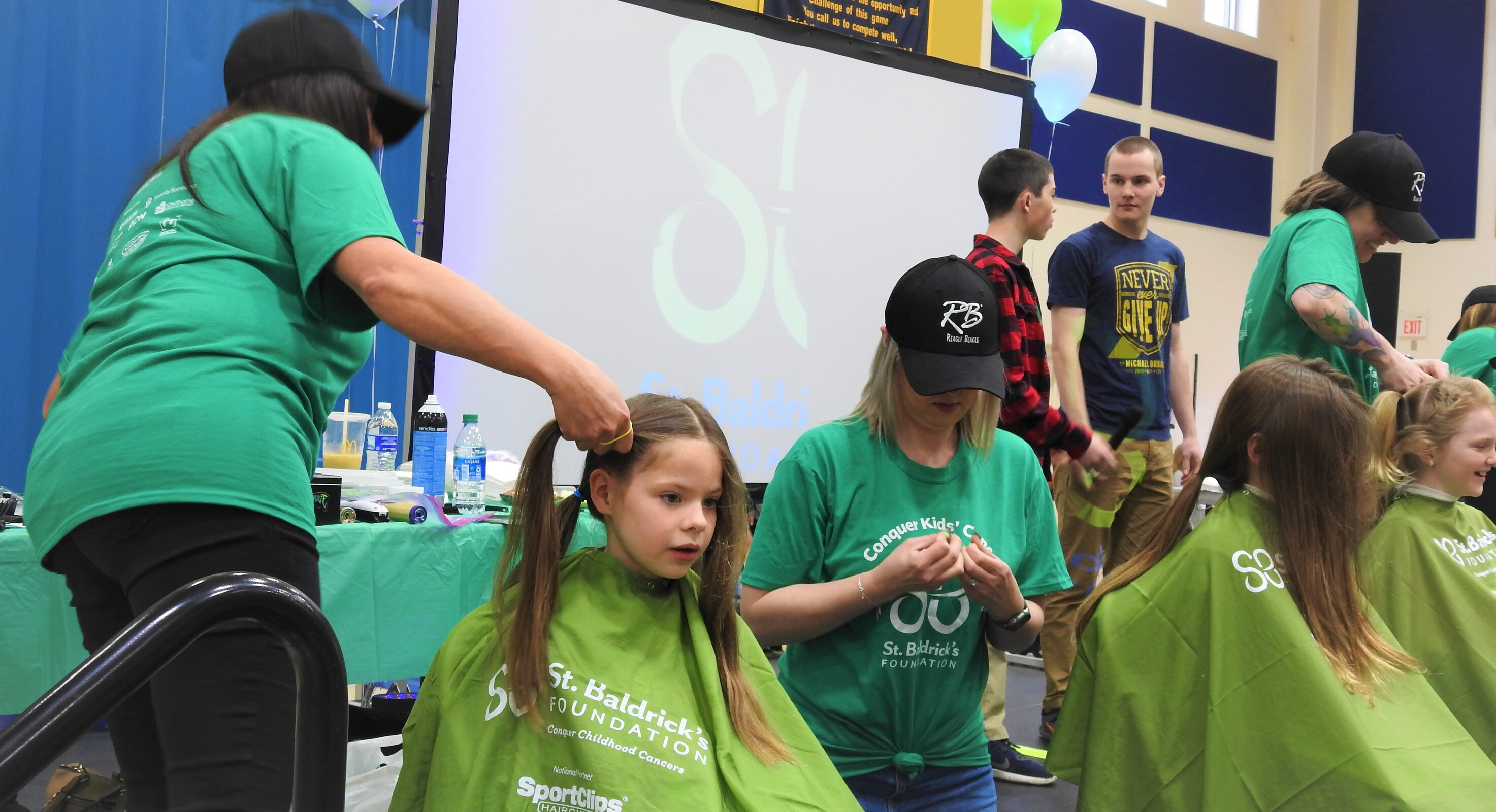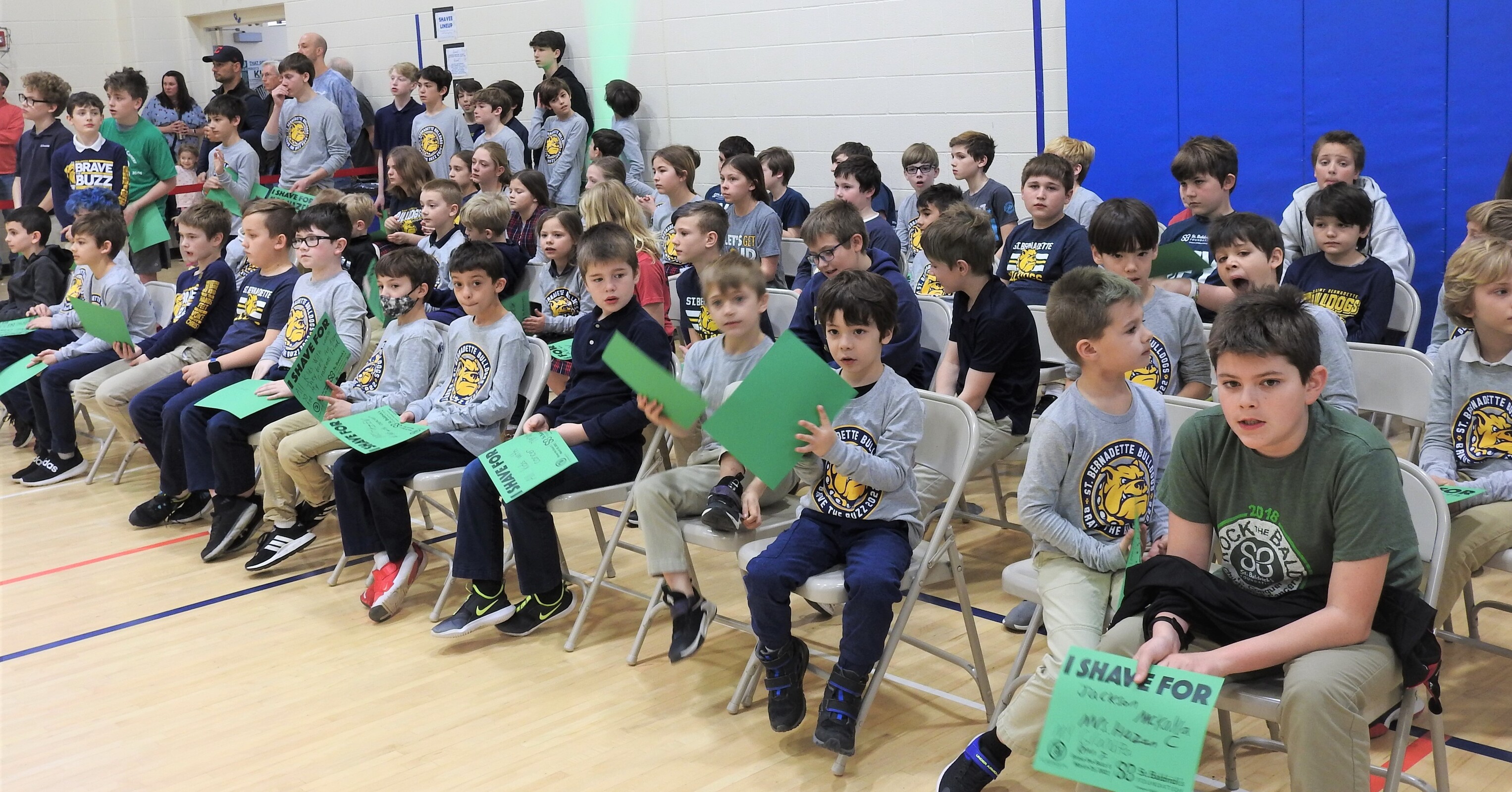 There was plenty of lively music in the gym as those in the stands cheered for the shaves. The St. Bernadette Bulldog cheerleaders helped pump up the crowd. Students waiting their turn to have their heads shaved were seated in one area of the gym and were bouncing beach balls. Meanwhile, the bulldog mascot made the rounds in the gym offering high-fives and waving to the crowd.