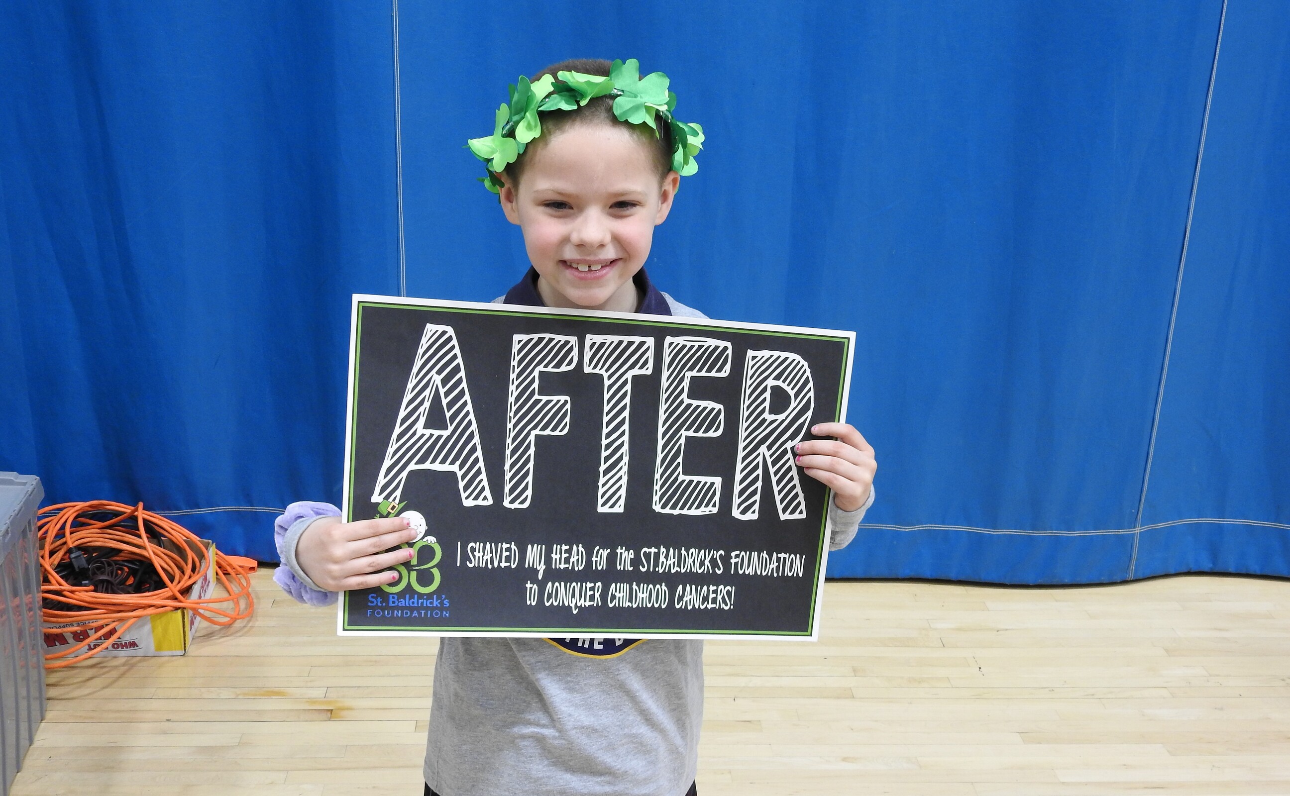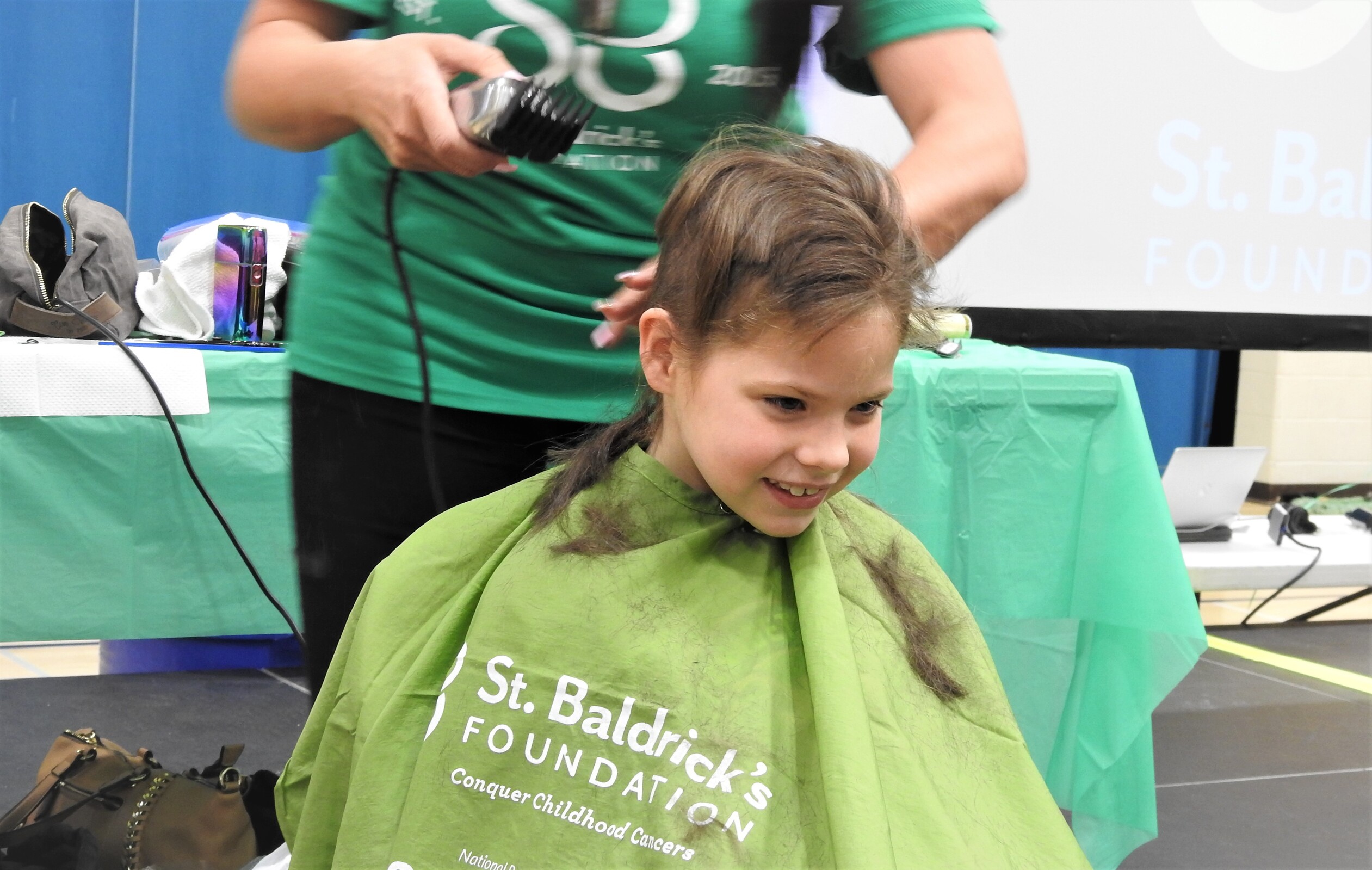 Among the first group of shavees were Ruby Stilla, a first-grader, and Maggie Chambers, a fourth-grader. Both donated 12 or more inches of hair before having their heads shaved and receiving a shamrock crown. This was the second time that Maggie, who also was the largest fundraiser, had her head shaved.
