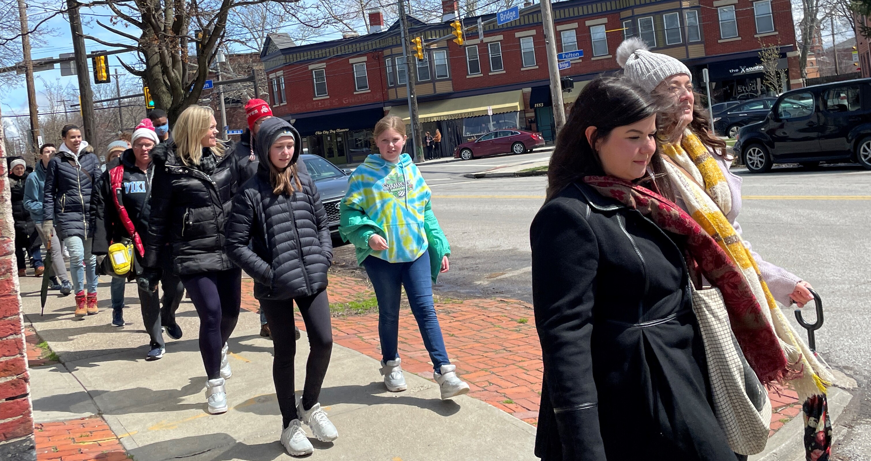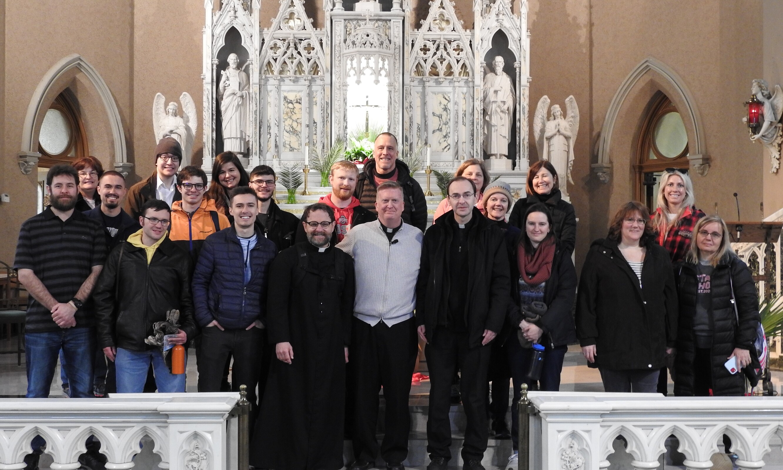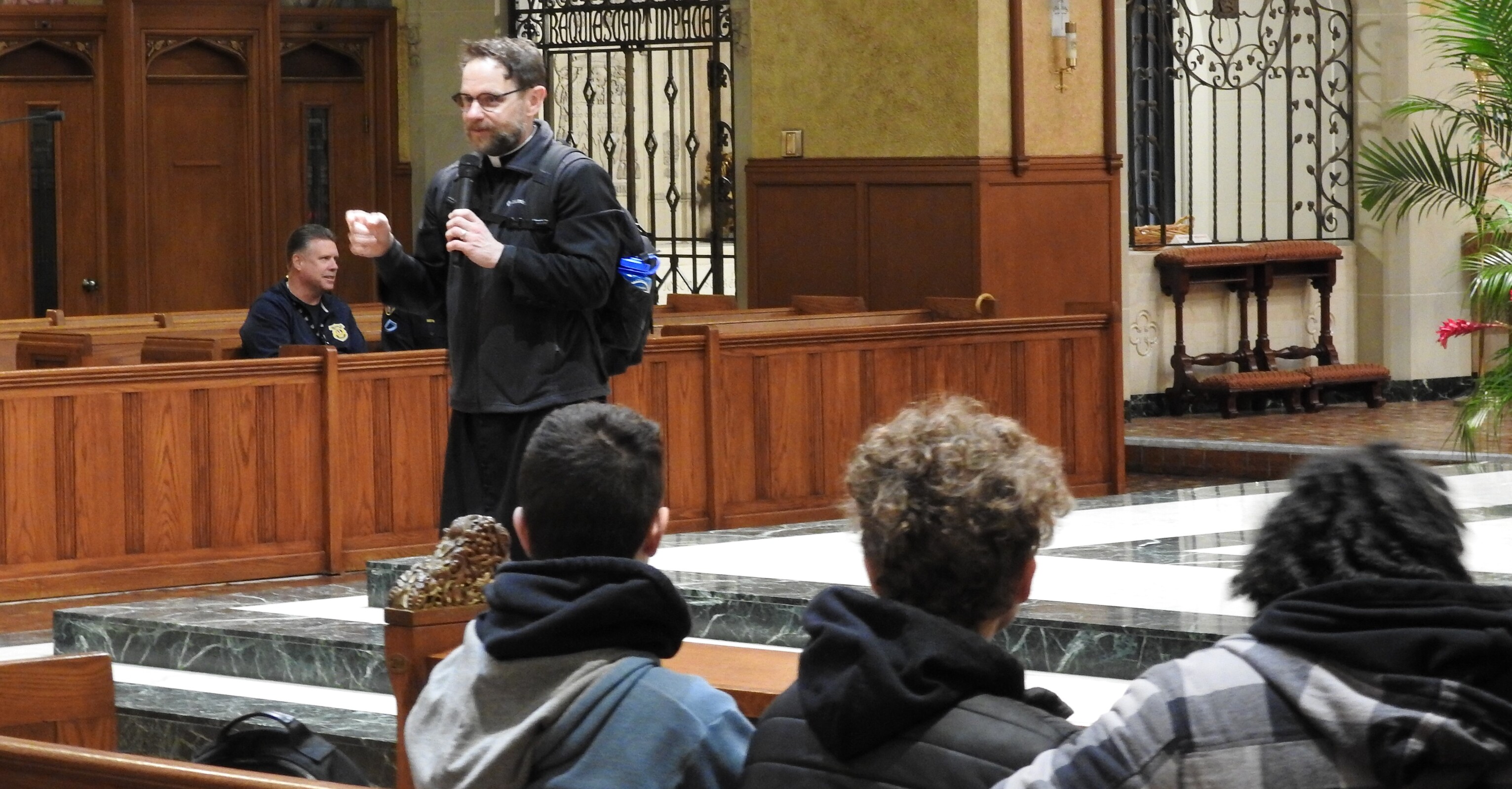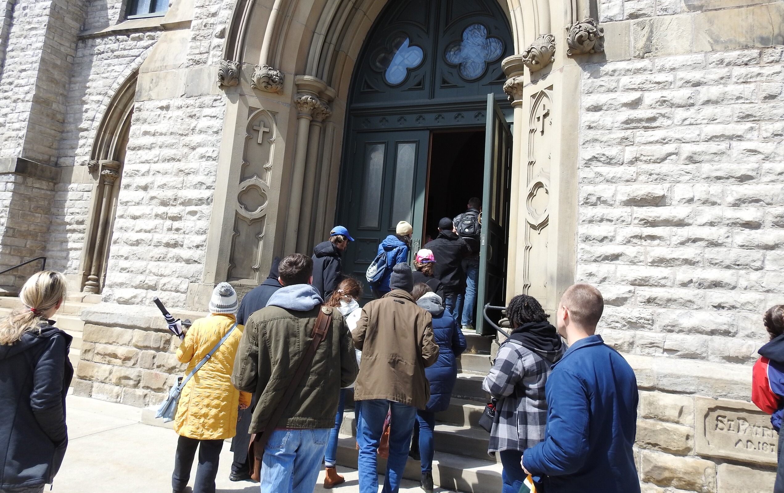 So, Father Bona mapped out six churches on Cleveland’s West Side that are within walking distance of the Cathedral of St. John the Evangelist. The cathedral was the starting and ending point for the pilgrimage. In addition to a meditation and short prayer time at each church, the pilgrims learned about the rich legacy of some of the diocesan parishes. Before leading the meditation, each pastor gave a brief history of his parish. They noted how the neighborhoods are changing, with gentrification taking place in many of the older areas of the West Side. As a result, there is a renewed opportunity for evangelization and parish growth.