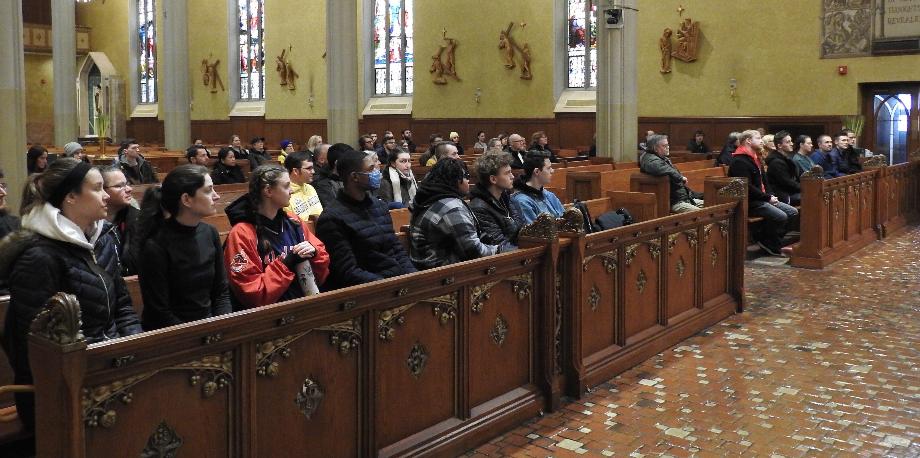 Those participating in the pilgrimage ranged in age from elementary school students to senior citizens. As they left the cathedral in the morning, most were using umbrellas to shield themselves from a cold, sometimes slushy rain. But by the time they arrived at the first stop – St. John Cantius – the sun was popping out. Although it remained chilly, the sun stayed out the rest of the day.