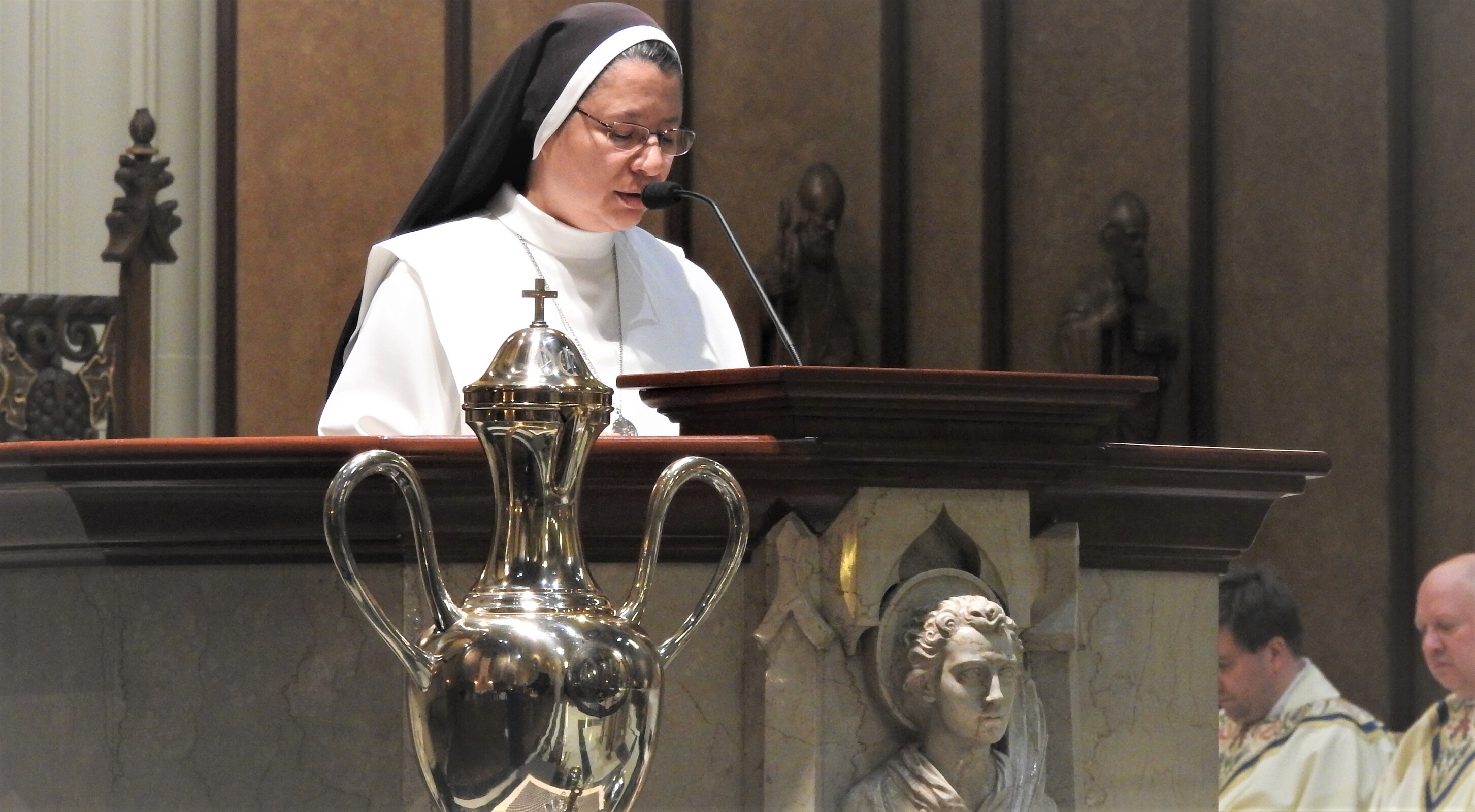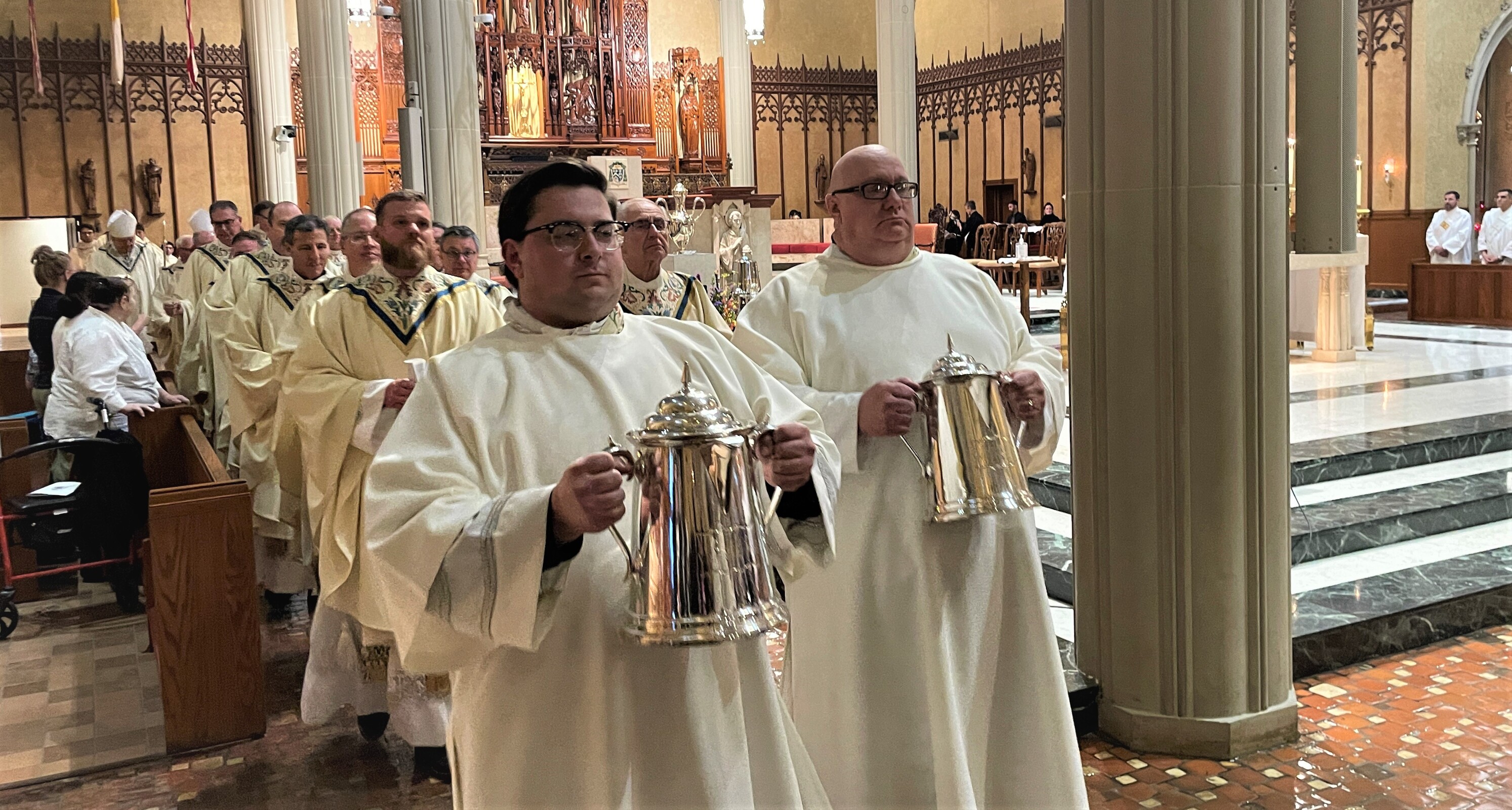 During the liturgy, Bishop Malesic blessed the holy oils and sanctified the chrism which will be used for sacramental purposes throughout the diocese. Deacons carried large containers of the unblessed oil for holy chrism, oil of the sick and oil of catechumens which were placed in the appropriate places in the sanctuary.