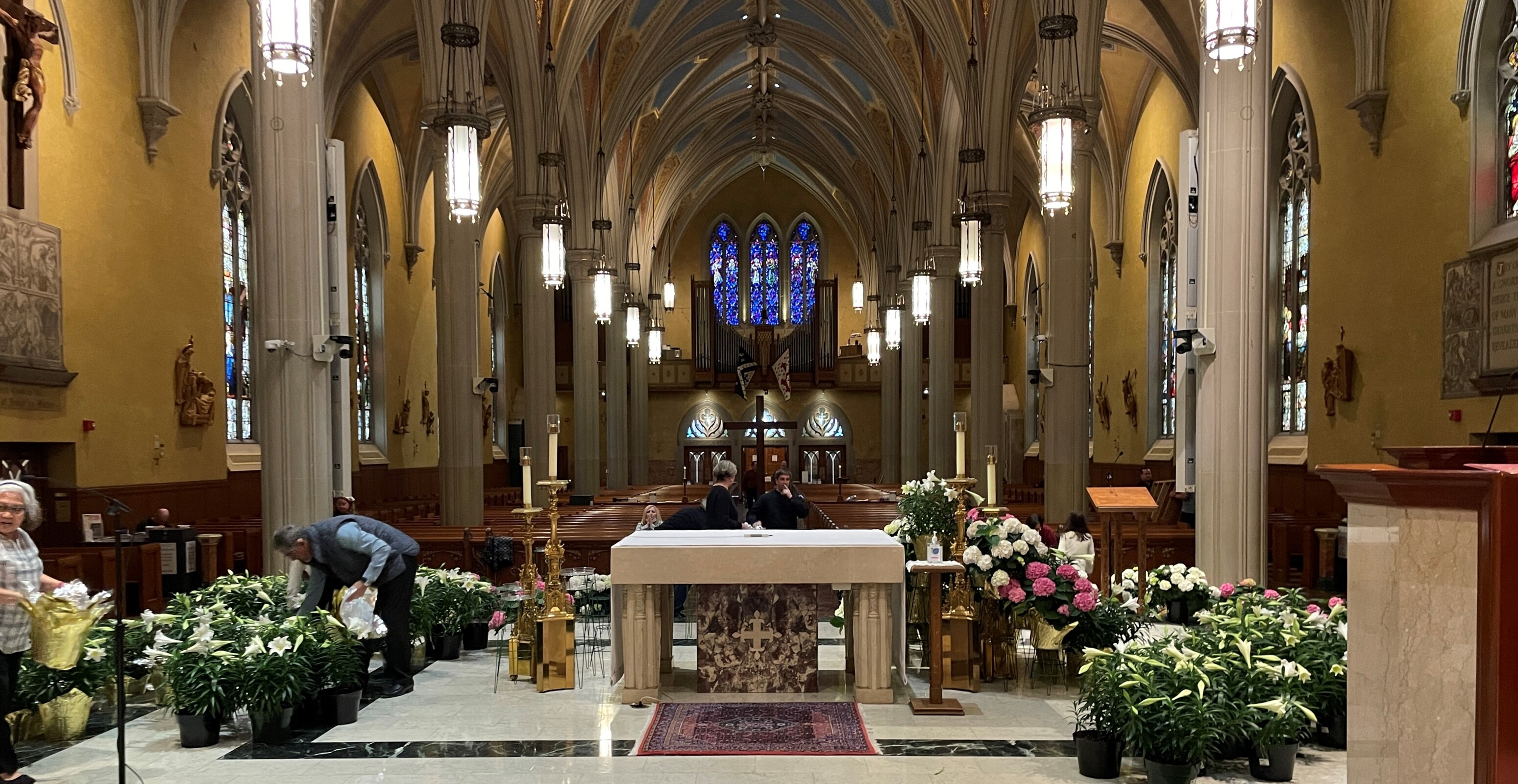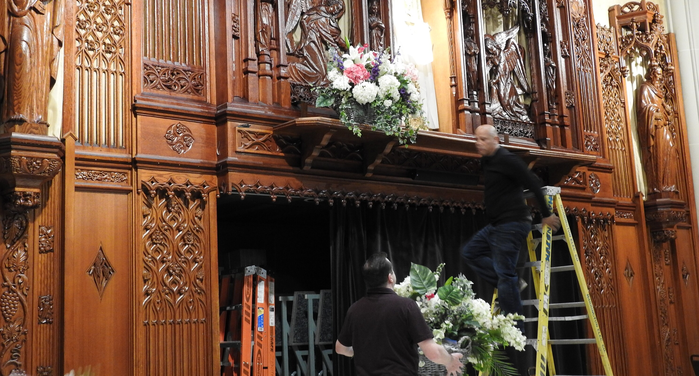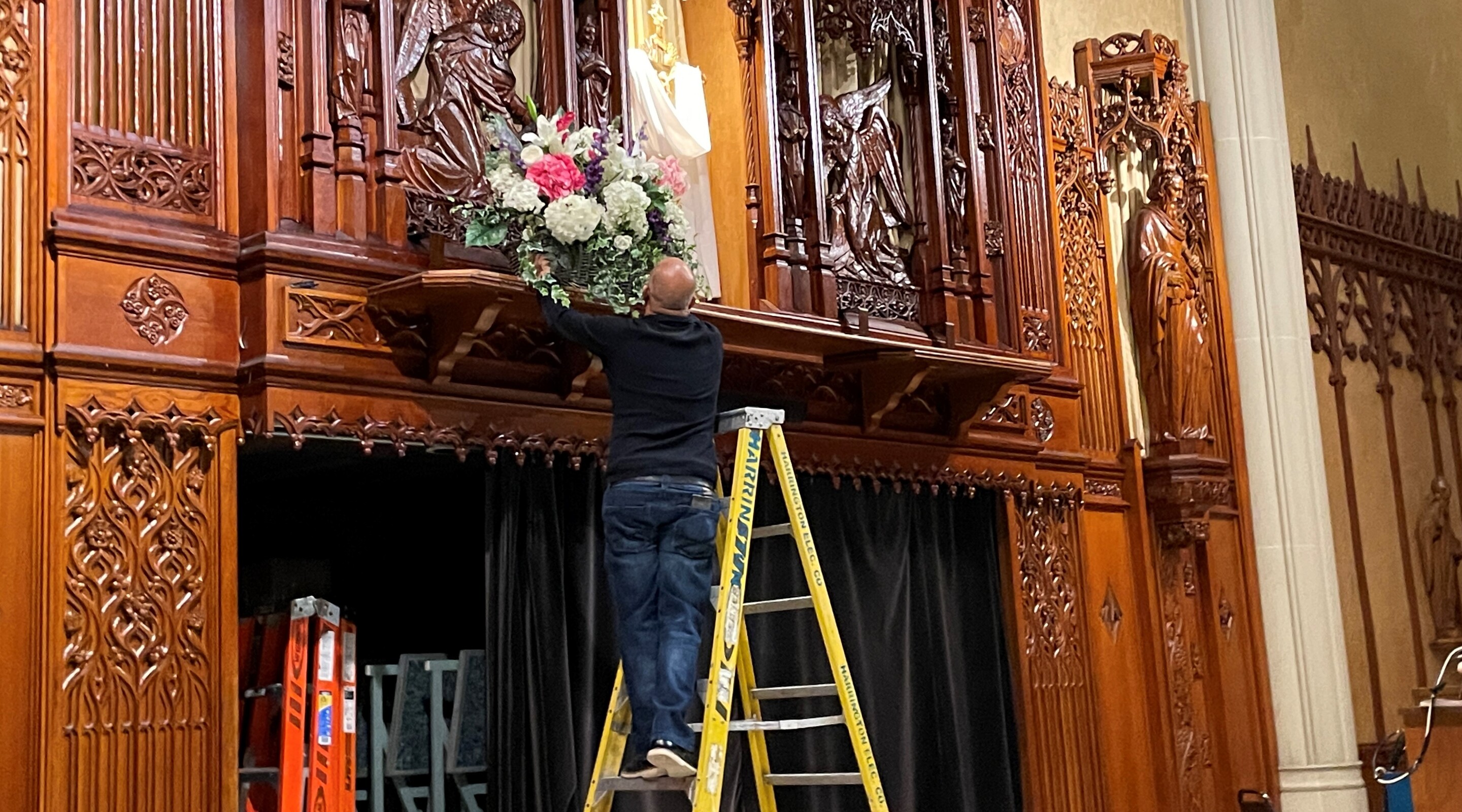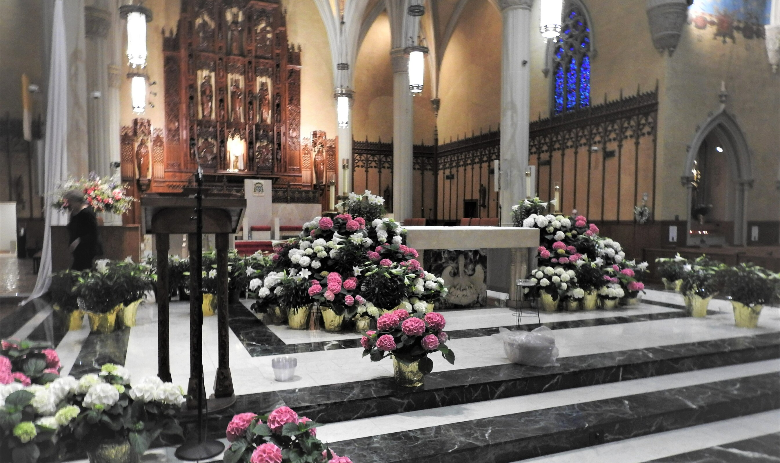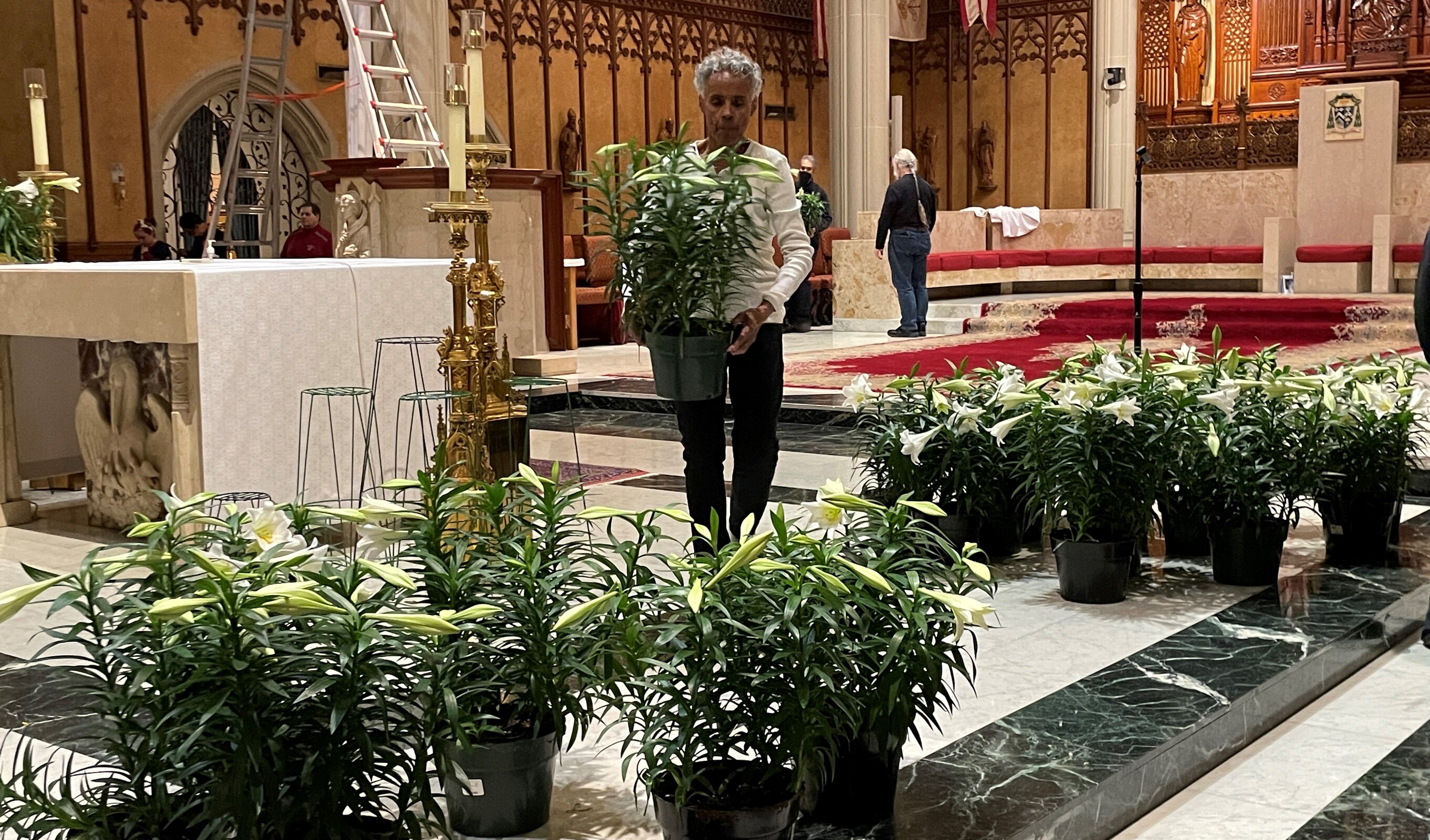 About a dozen people, including Father Sean Ralph, cathedral rector, brought the fresh flowers from their storage sites in the cathedral, placed them in decorative foil sleeves, added a plastic tray to collect water and then carefully placed them by size, type and color on the floor or on plant stands on both sides of the altar, next to the baptismal font and in other strategic areas.