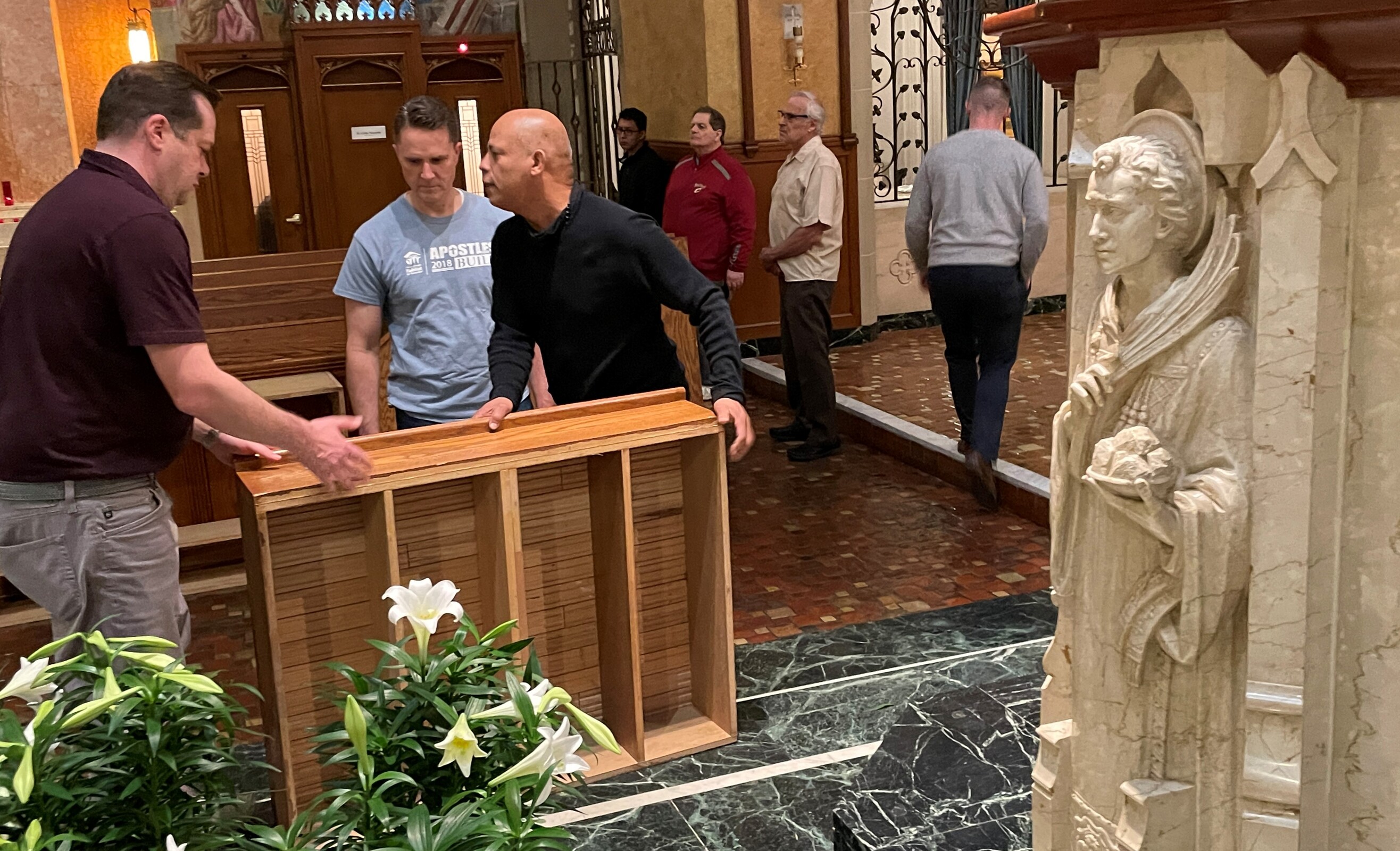 Volunteers went into the cathedral basement and carried up several large wooden pieces that were assembled adjacent to the ambo to form a structure for other plants and to reach the paschal candle.