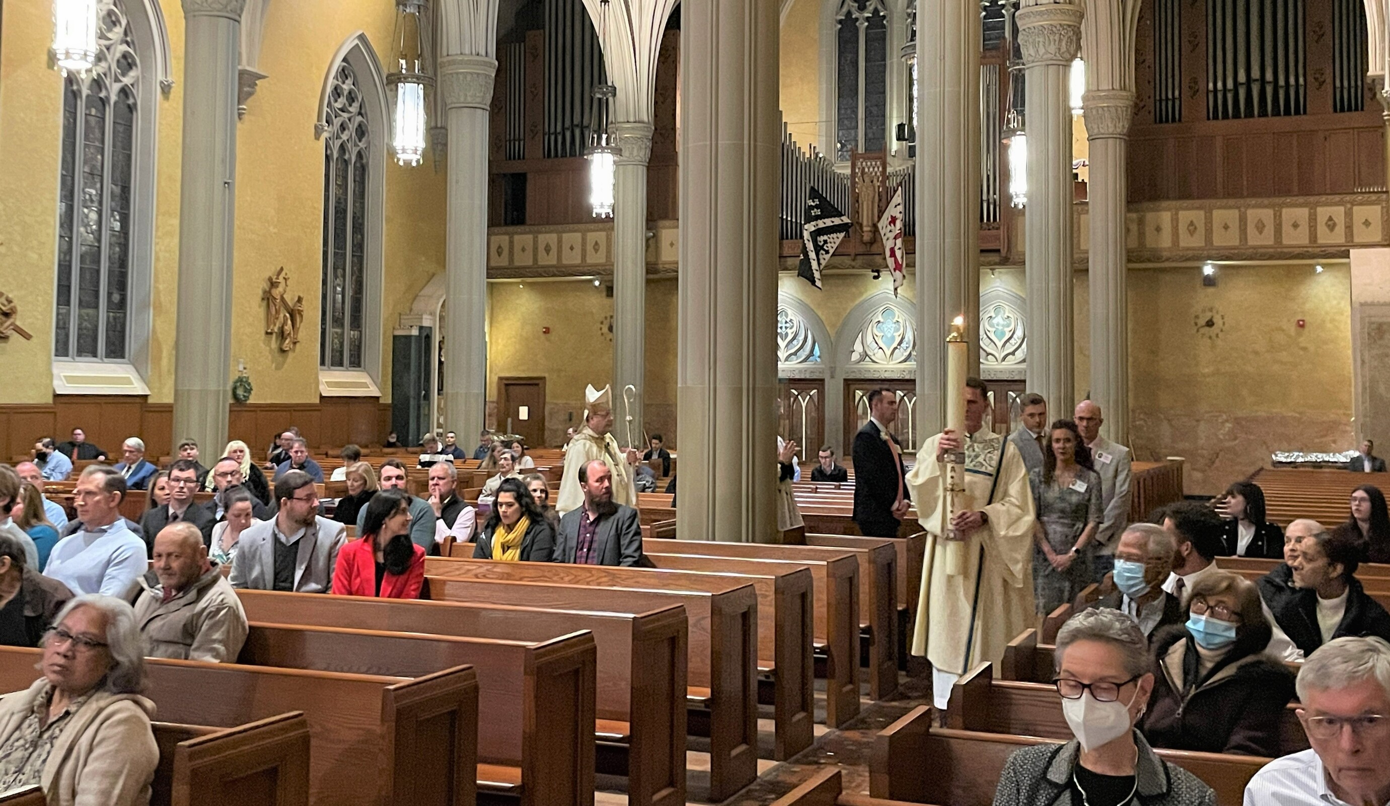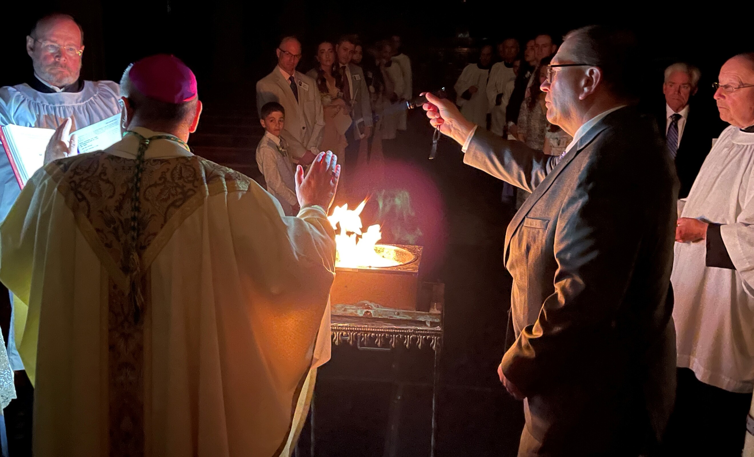 The liturgy began on a solemn note as the church lights were turned off. In the darkness, at the back of the cathedral, Bishop Edward Malesic lit and blessed a fire. He also blessed the 2022 paschal candle, which would be used during the baptisms. The faithful lit small candles from the paschal candle and the light gradually returned to the church.