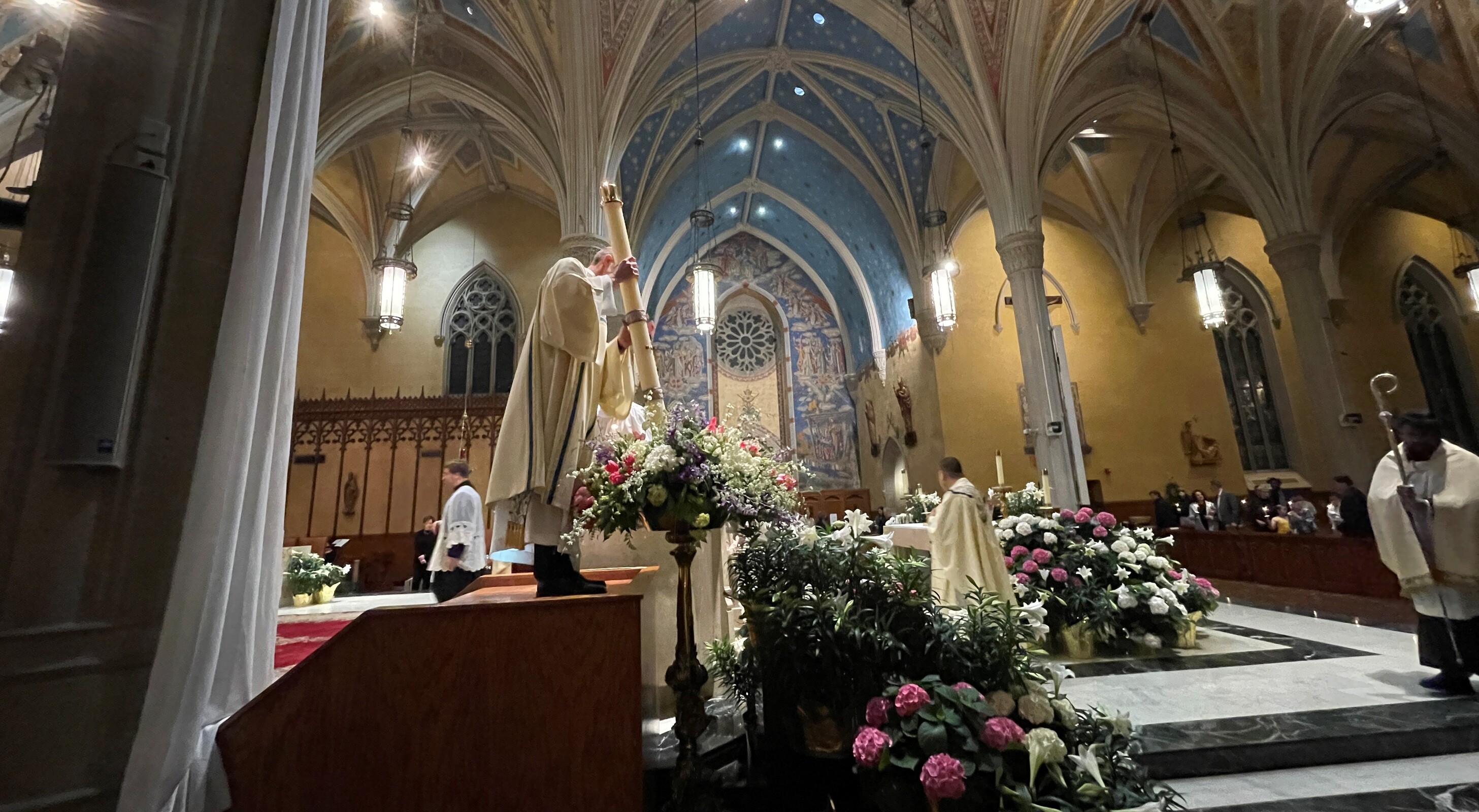 After processing to the front of the cathedral, the deacon placed the paschal candle in its holder in the front of the sanctuary near the ambo. He then chanted the Exsultet, the proclamation of Easter, which was a departure from the solemn chants of Good Friday.