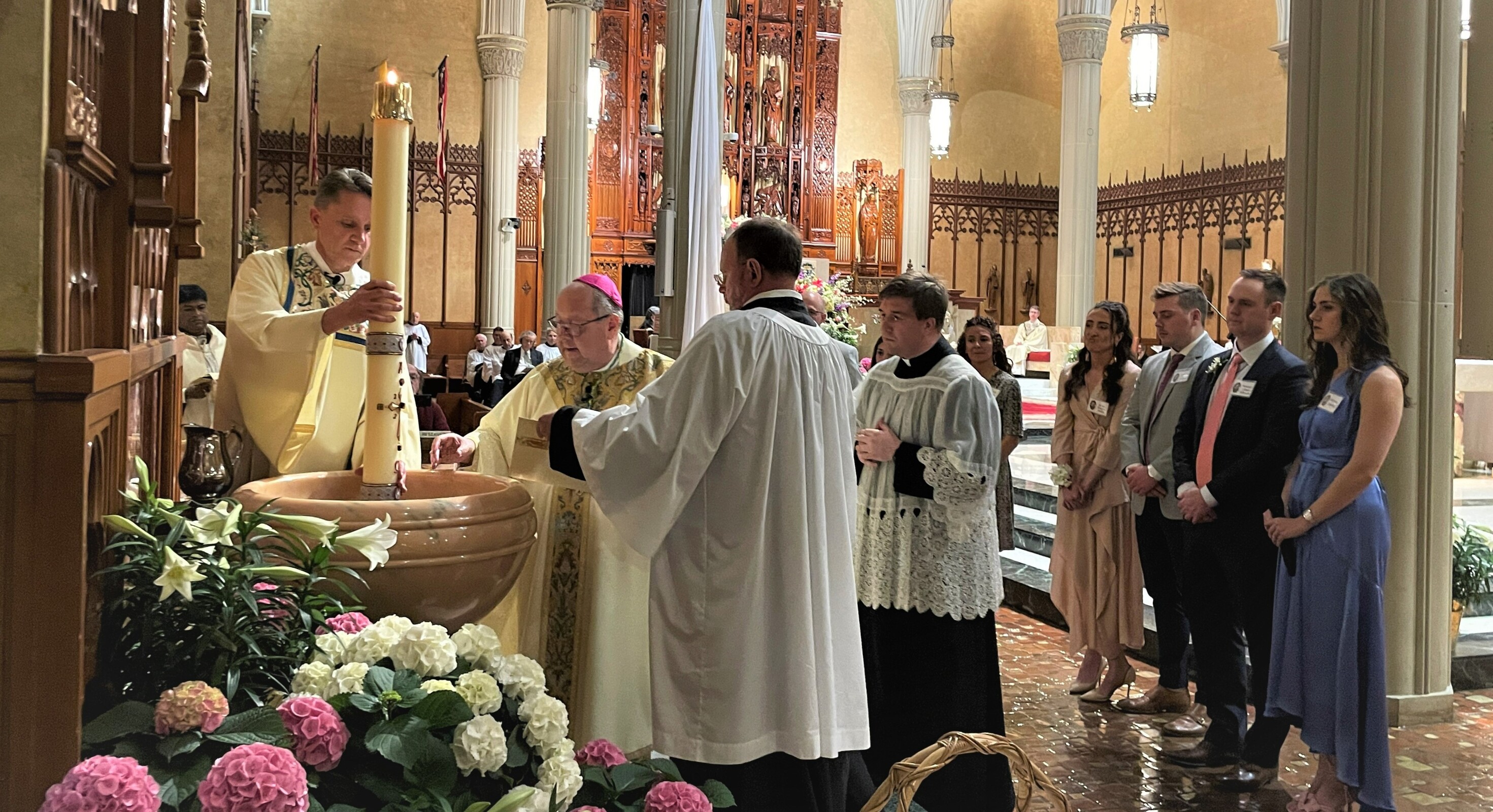 After the Gospel, those to be baptized were called to the front of the congregation and presented for the sacrament. They professed their faith and each was baptized by the bishop, received a white garment and a candle. They shared the light from that candle with their family, friends and others in the church. The rest of the congregation renewed their baptismal promises and the bishop and deacon passed through the cathedral sprinkling the faithful with holy water.