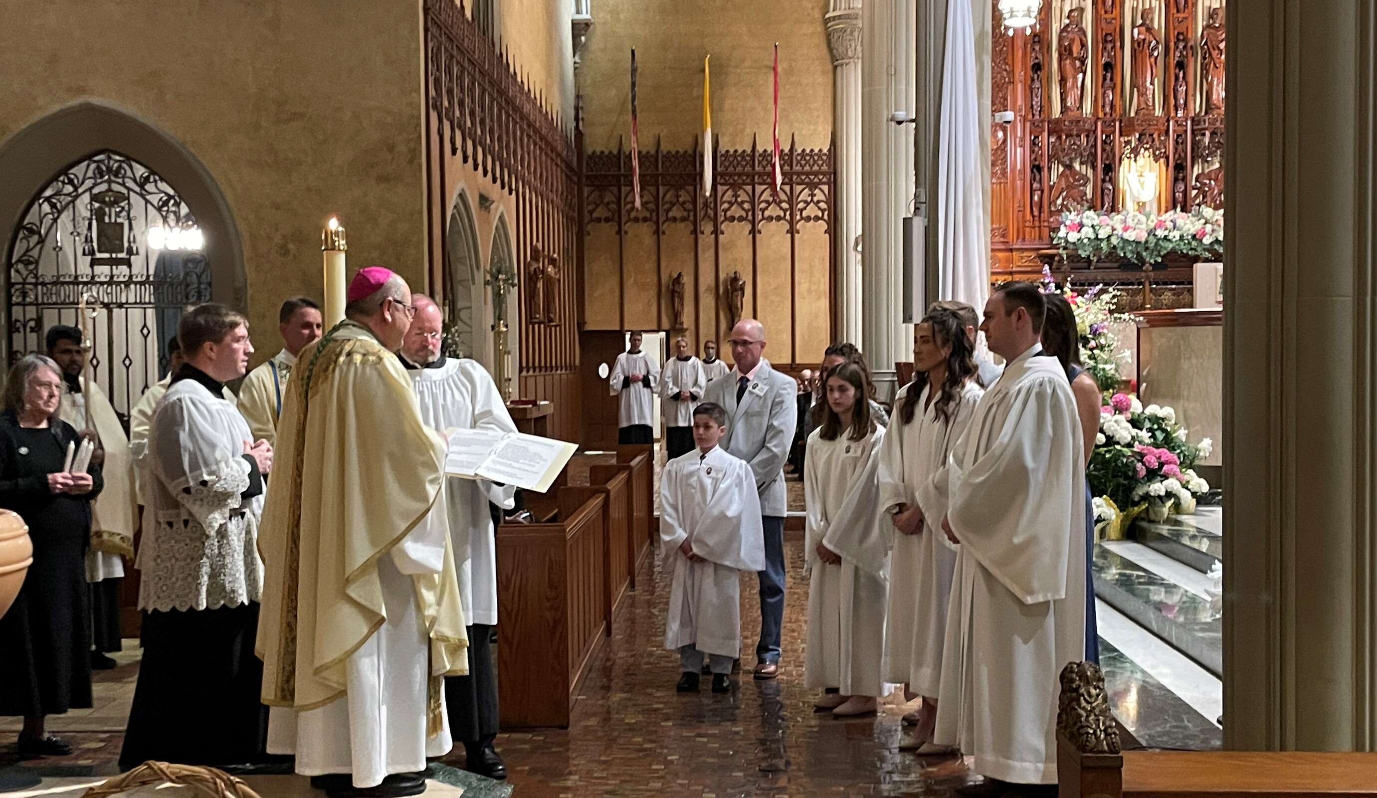 “Tonight, we will baptize Alexander, Jordan, Isabella and Giuliano and confirm them and give them first holy Communion, along with Katyln. Let me just say a few words to the five of you. You help us to renew our faith in Jesus. You have found him and remind us that our faith is a great gift,” the bishop said.