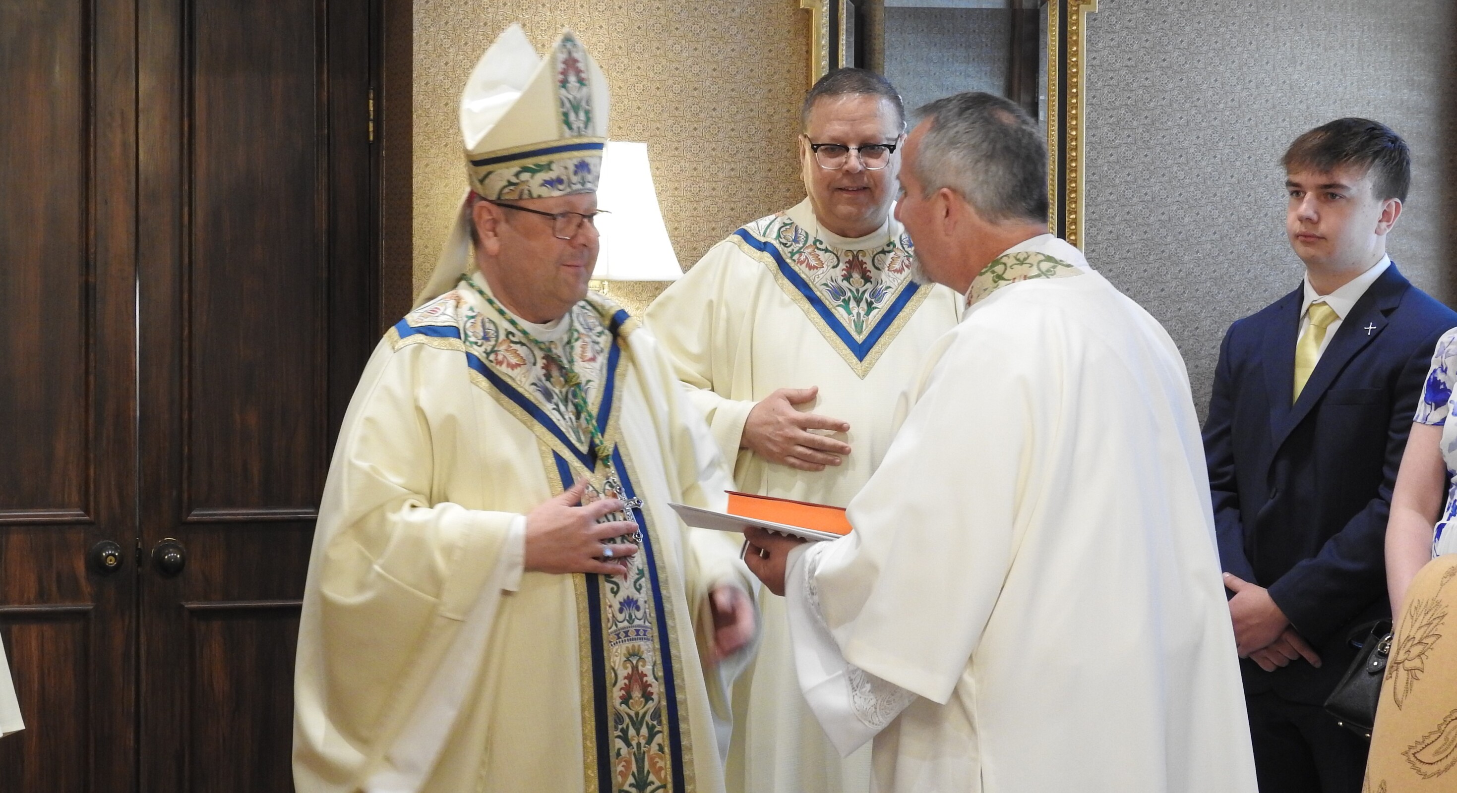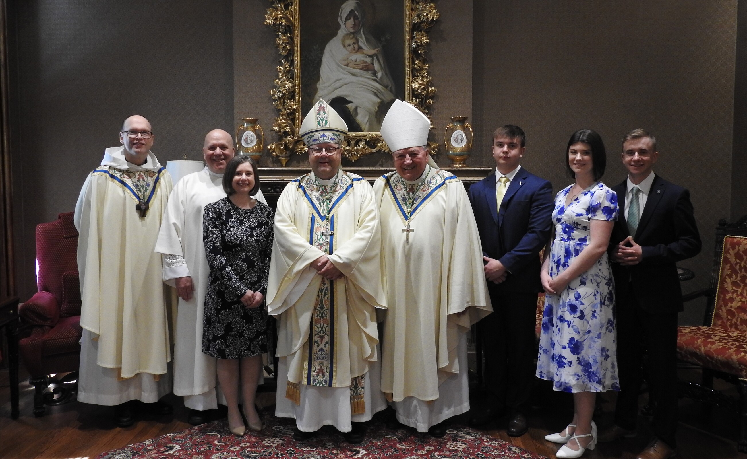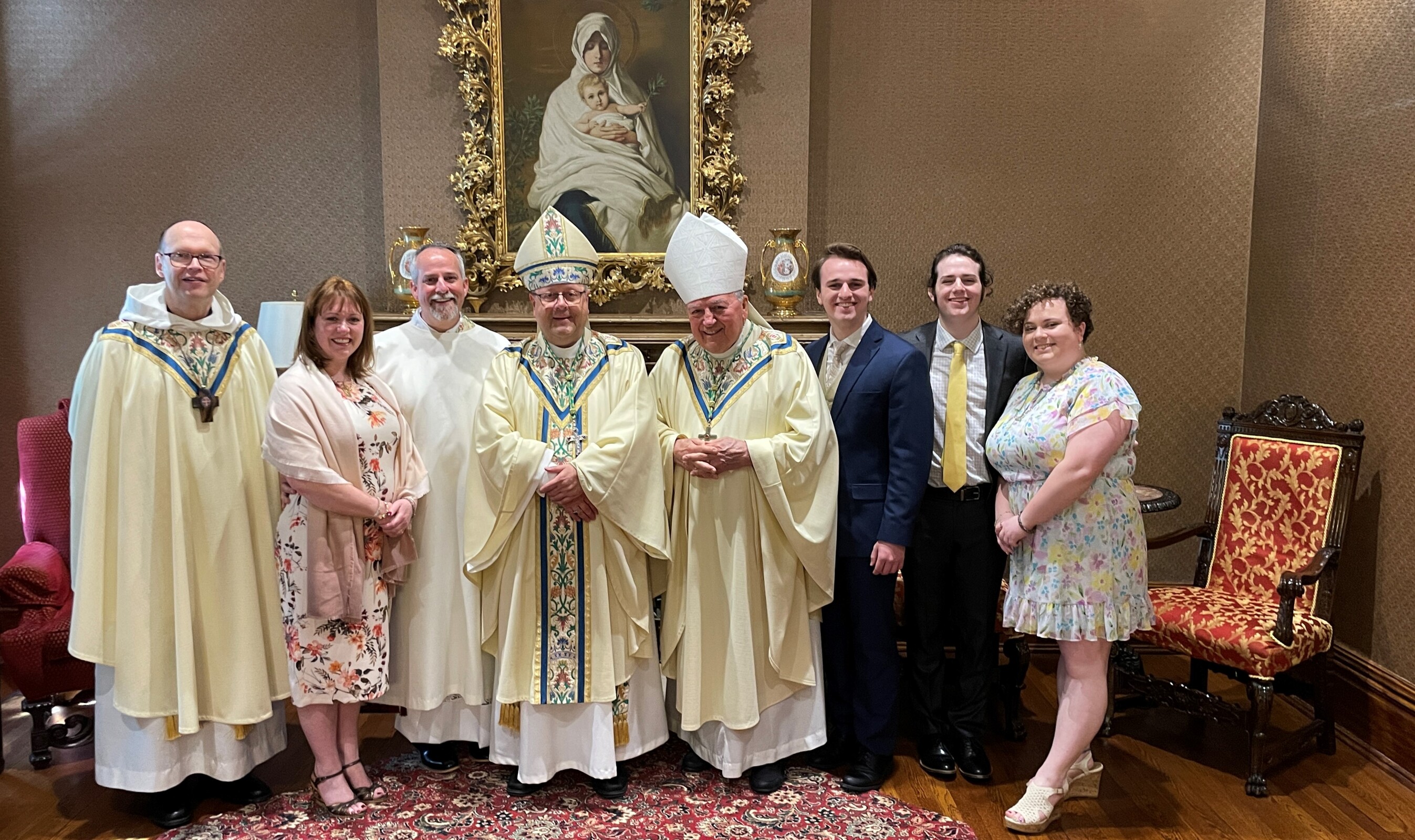 After Mass, the newly ordained deacons and their families met the bishop in the rectory parlor where he once again offered his congratulations and appreciation for their ministry and sacrifice. Each deacon received a Book of the Gospels and his parish assignment. Families and the deacons also posed for photos with the bishop, Auxiliary Bishop emeritus Roger Gries and Benedictine Abbot Gary Hoover, OSB.
