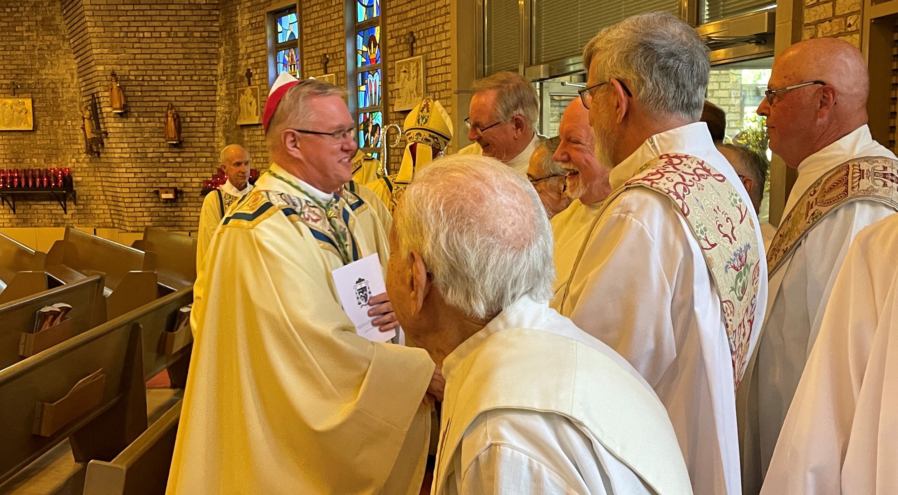 The night of May 10, the bishop-elect joined Bishop Malesic, Auxiliary Bishop emeritus Roger Gries and other priests at St. Basil the Great Church in Brecksville to concelebrate the annual jubilee Mass for deacons in the diocese. Before Mass, he was surrounded by deacons who offered their best wishes on his new ministry. After Mass, he mingled with the celebrating deacons, their wives and other guests at a reception on the parish Family Life Center.