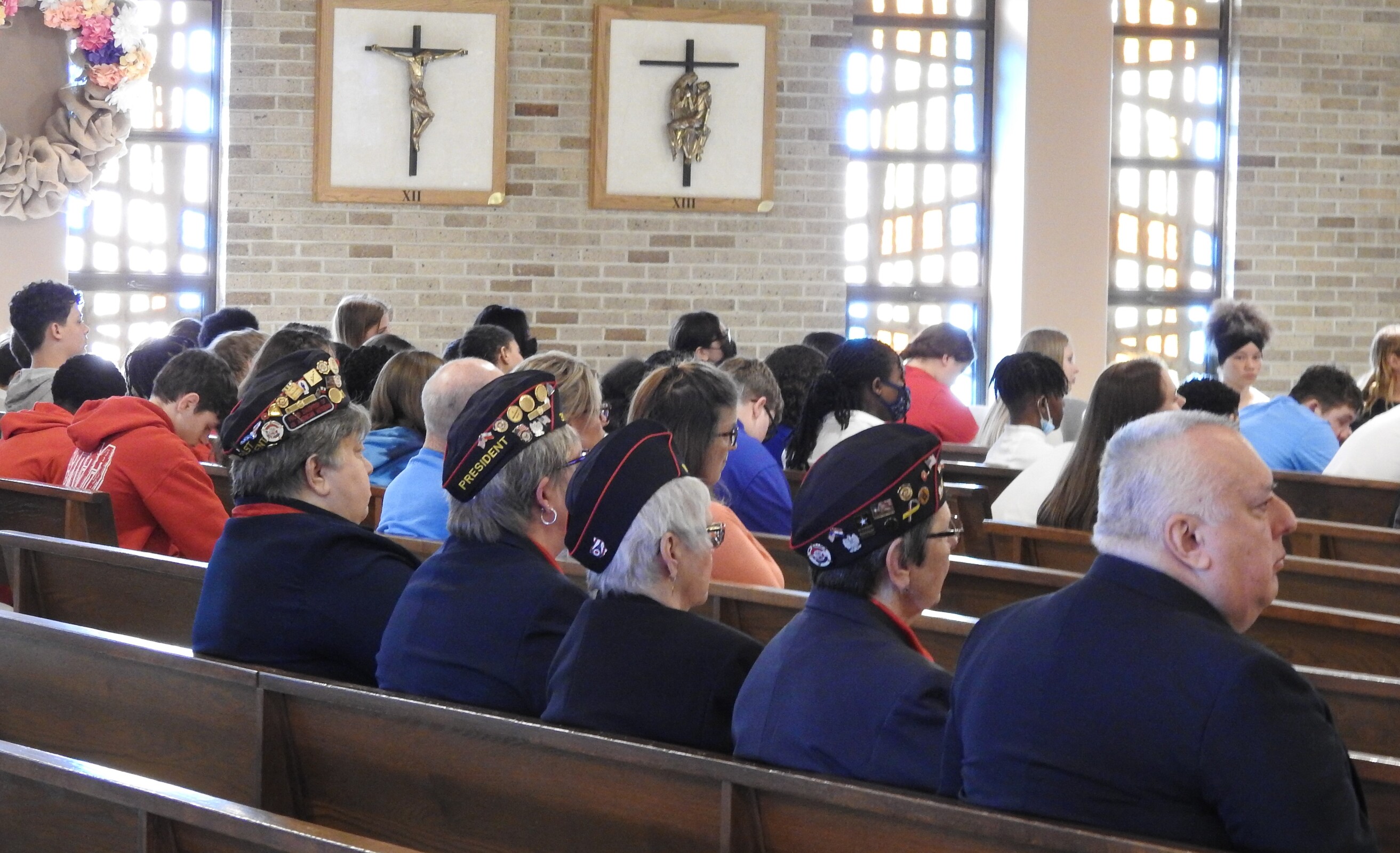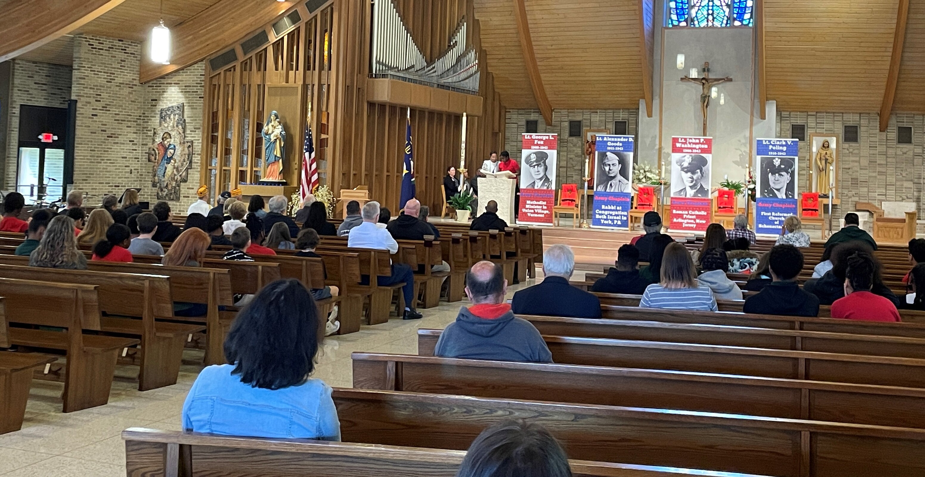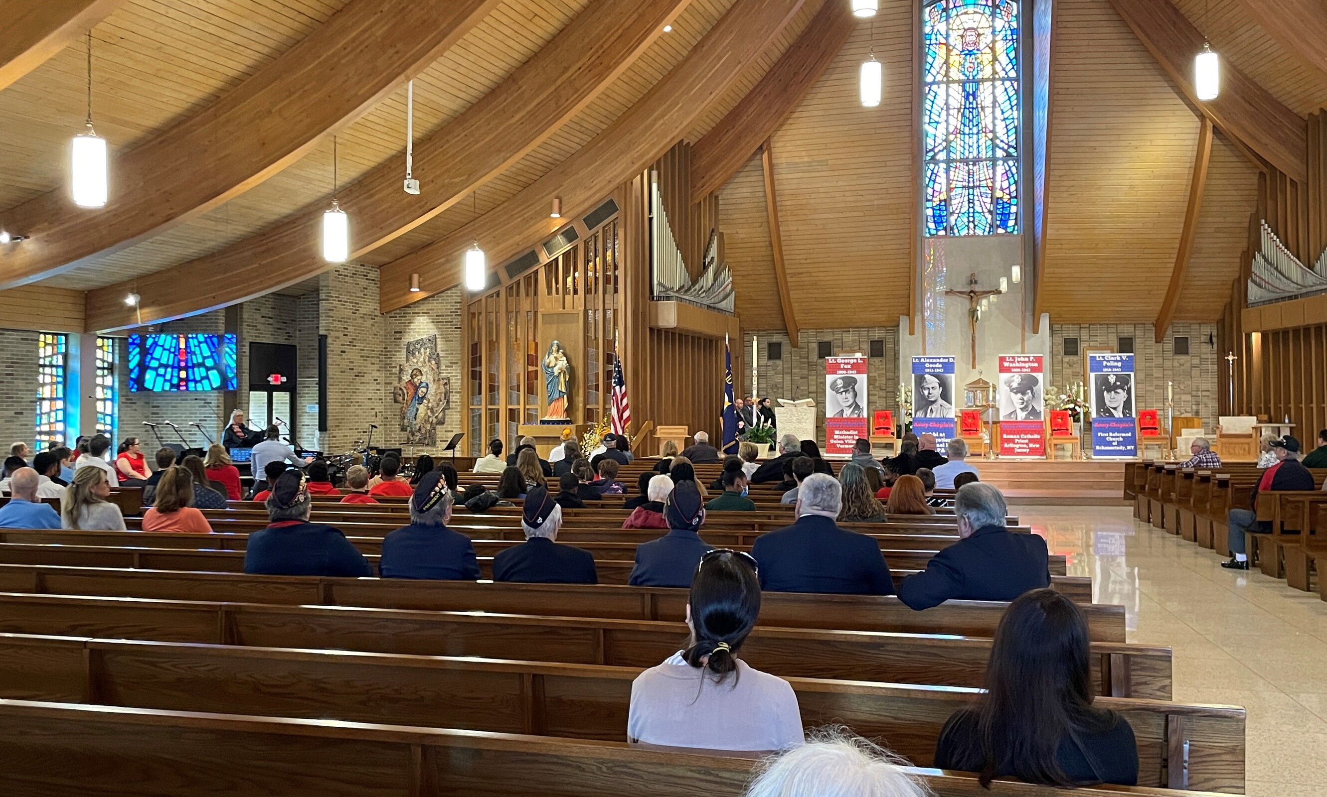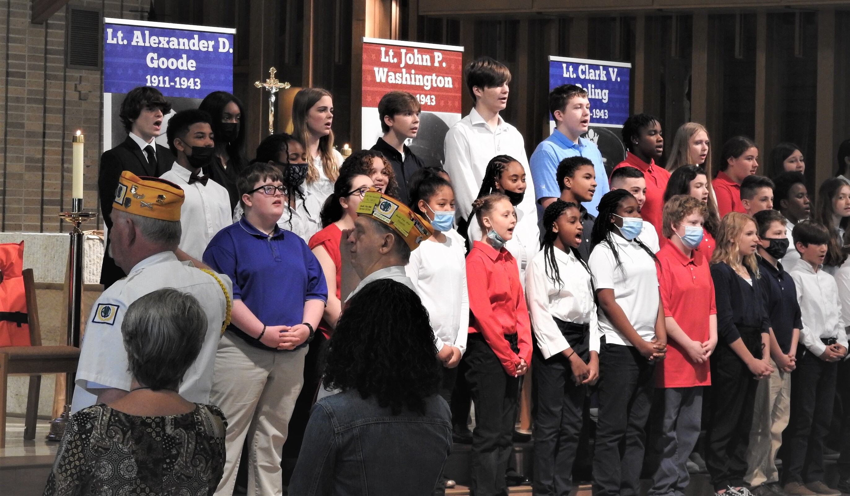 Retired Col. Cheryl Ludwa directed the posting and retirement of the colors, after which SS. Robert & William students sang and signed – using American Sign Language – the national anthem. Ludwa also gave an introduction to the Four Chaplains.