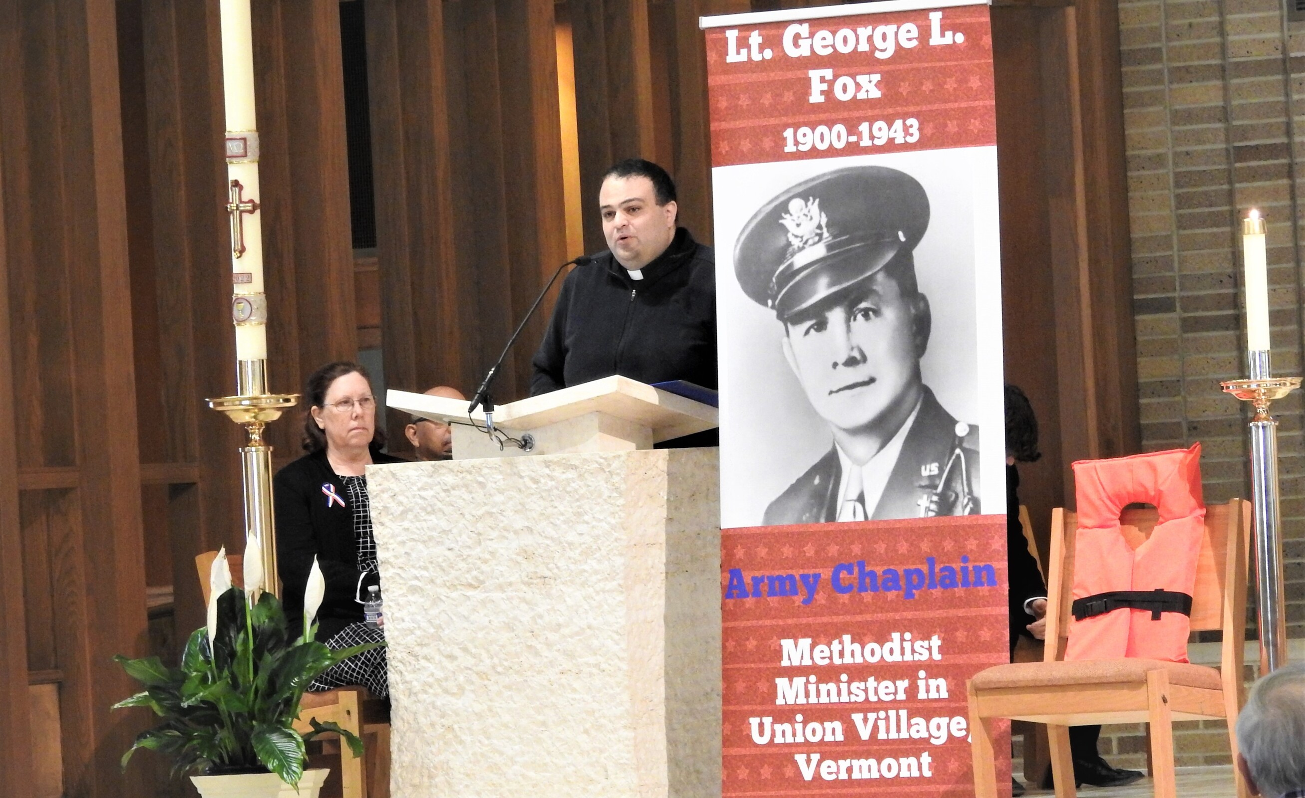 The ceremony took place in the church. Four large banners, each bearing the name, photo and religious affiliation of a chaplain, were displayed in front of the church. Next to each banner was a chair with a life jacket, a somber reminder of the sacrifice made by the chaplains.