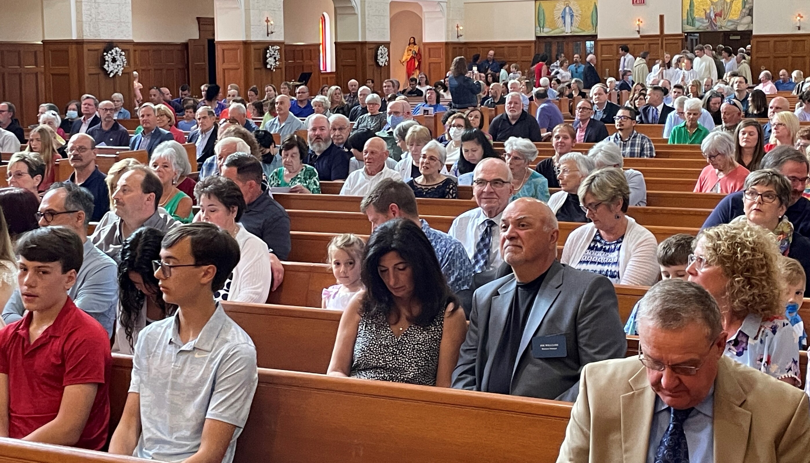 In 2008, the church was renovated and a baptismal font for immersion was added near the altar. A statue of the Holy Family was added, the tabernacle was moved to a more prominent location, the sanctuary was made handicap accessible, stained-glass windows were added to the gathering area and prayer room and other improvements were made to the parish physical plant.