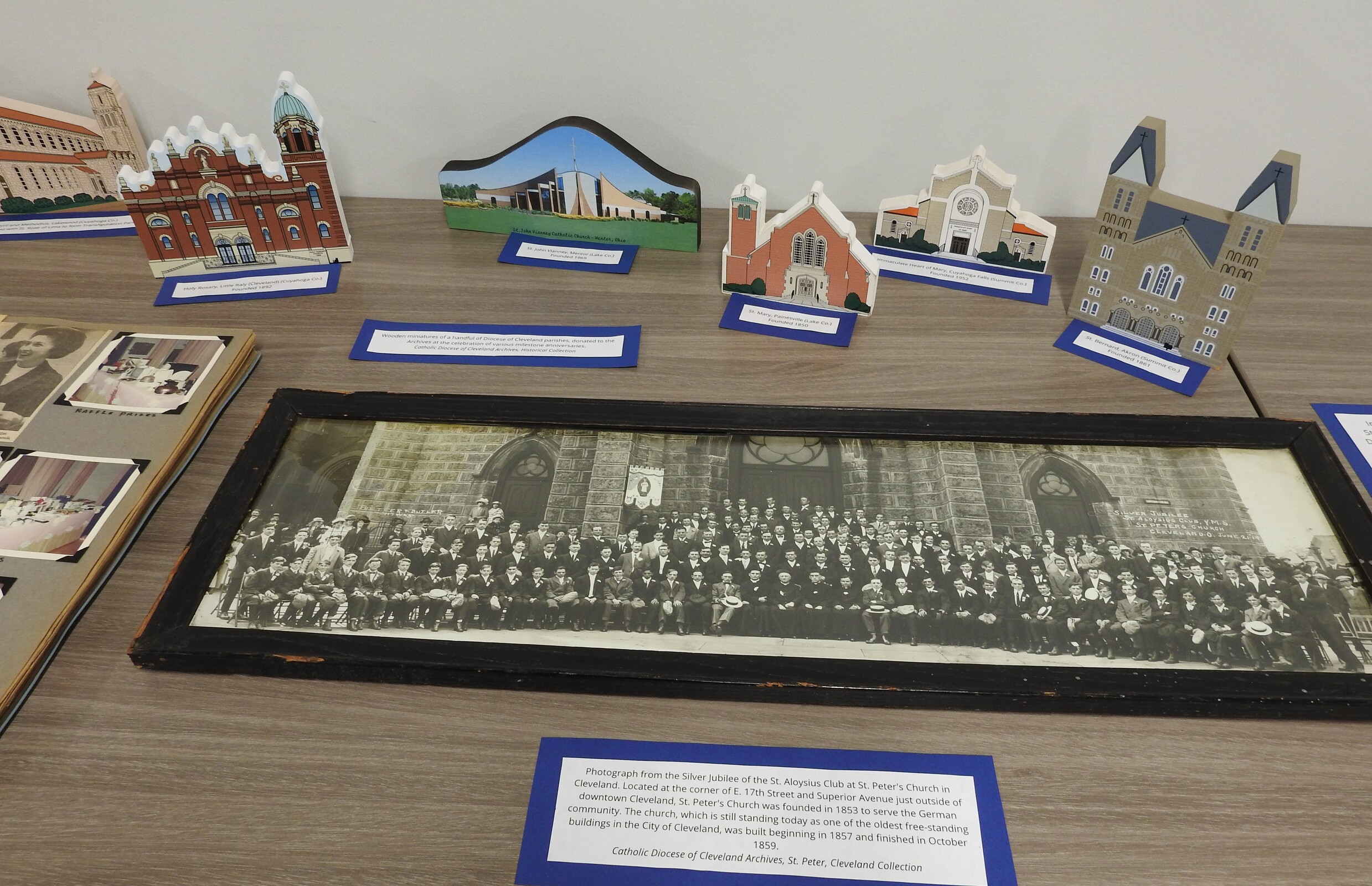 Father Yanus invited the group to visit a display assembled by Emily Ahlin, diocesan archivist, showcasing some artifacts and events from the 175-year history of the Cleveland Diocese.