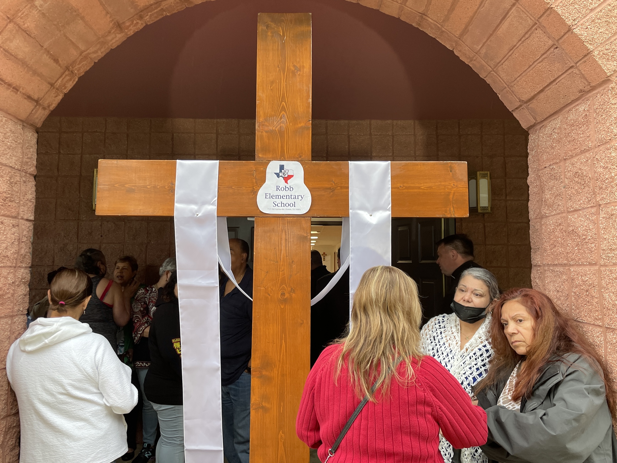 Twenty-two small white crosses – one for each victim – were placed on the lawn in front of the church. Father Francisco “Paco” Honorato Garnica, CSJ, pastor, said the crosses were donated by the Knights of Columbus. Some Knights attended the prayer service, which was livestreamed on the parish Facebook page. The group gathered in front of the church near a large cross draped in white with a sign bearing the school’s name and address.