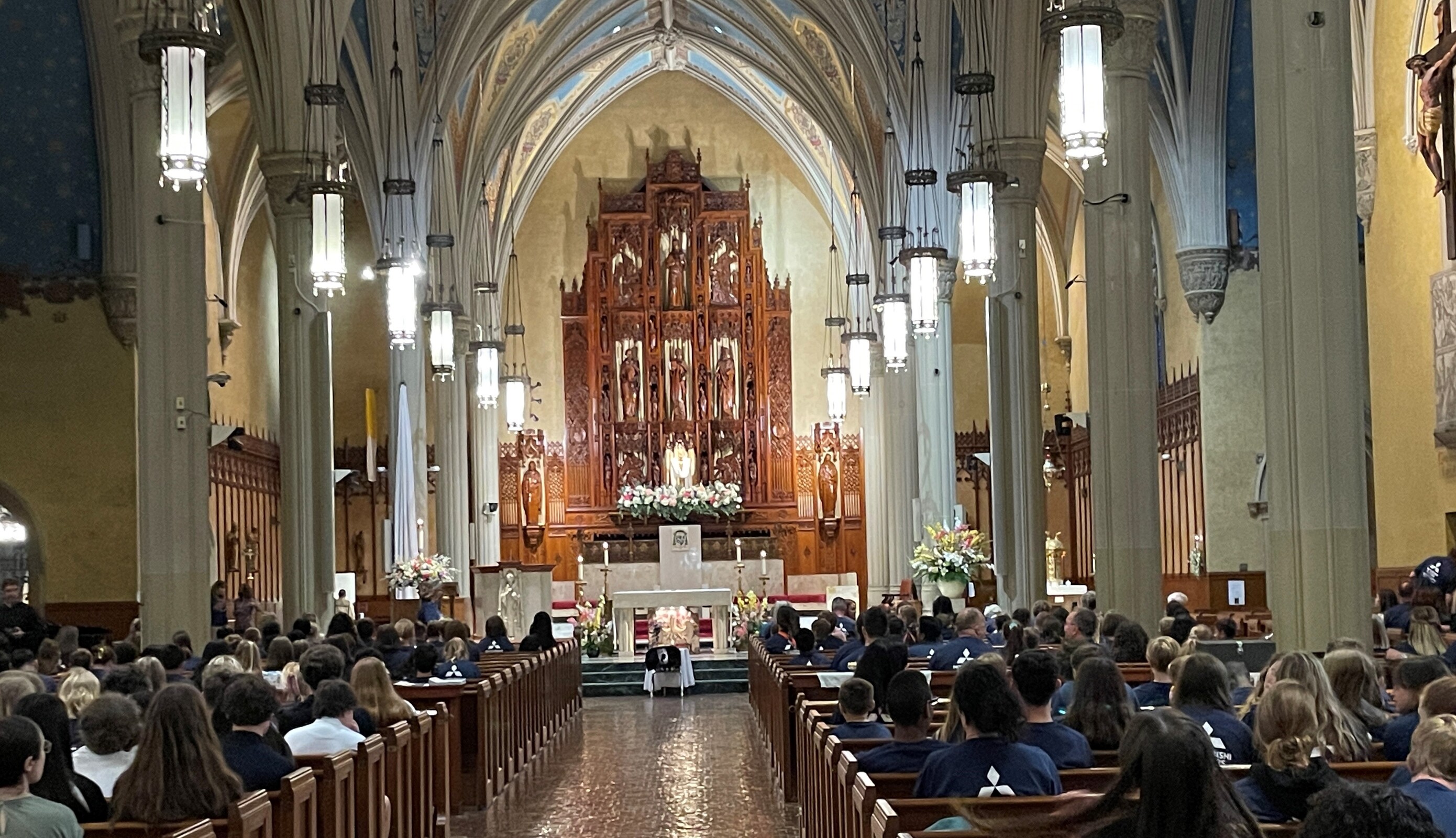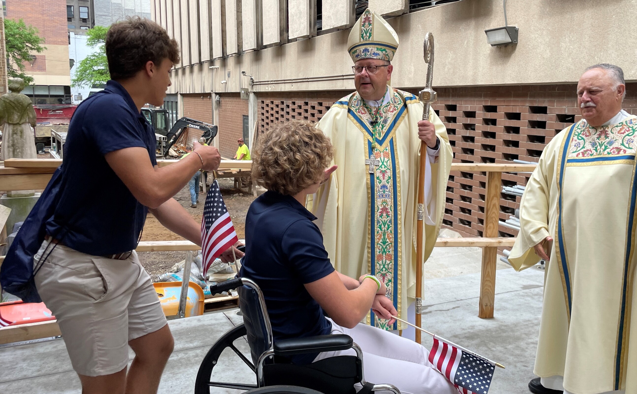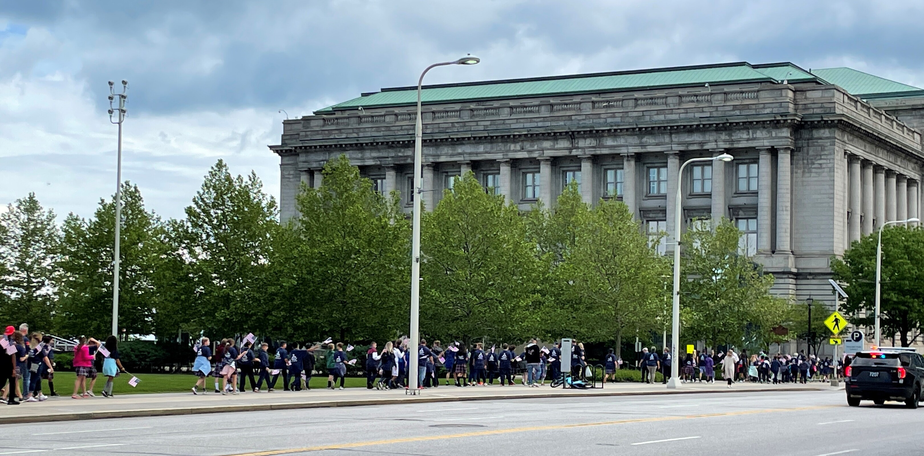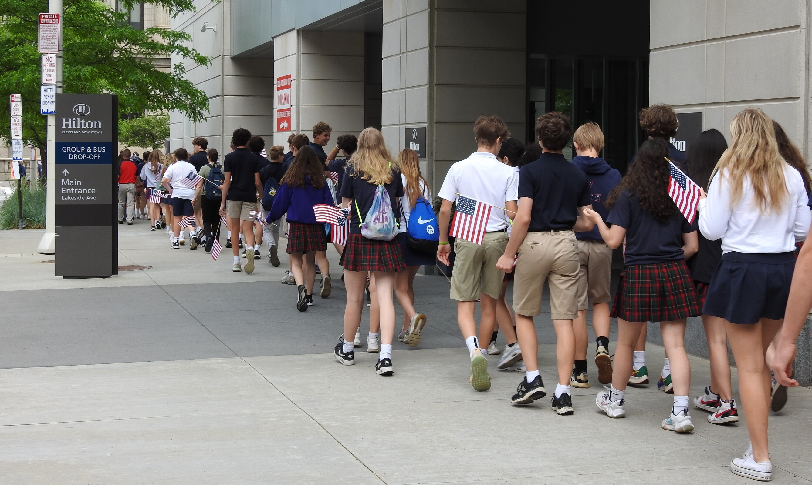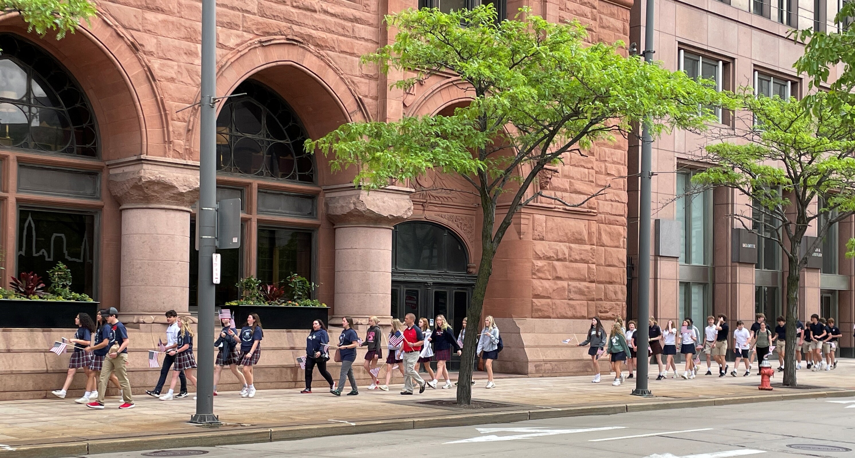 After Mass, the bishop greeted the students as they lined up, small American flags in hand, for an approximately three-mile walk around downtown Cleveland. The Cleveland Browns welcomed the group to FirstEnergy Stadium for lunch after the walk.