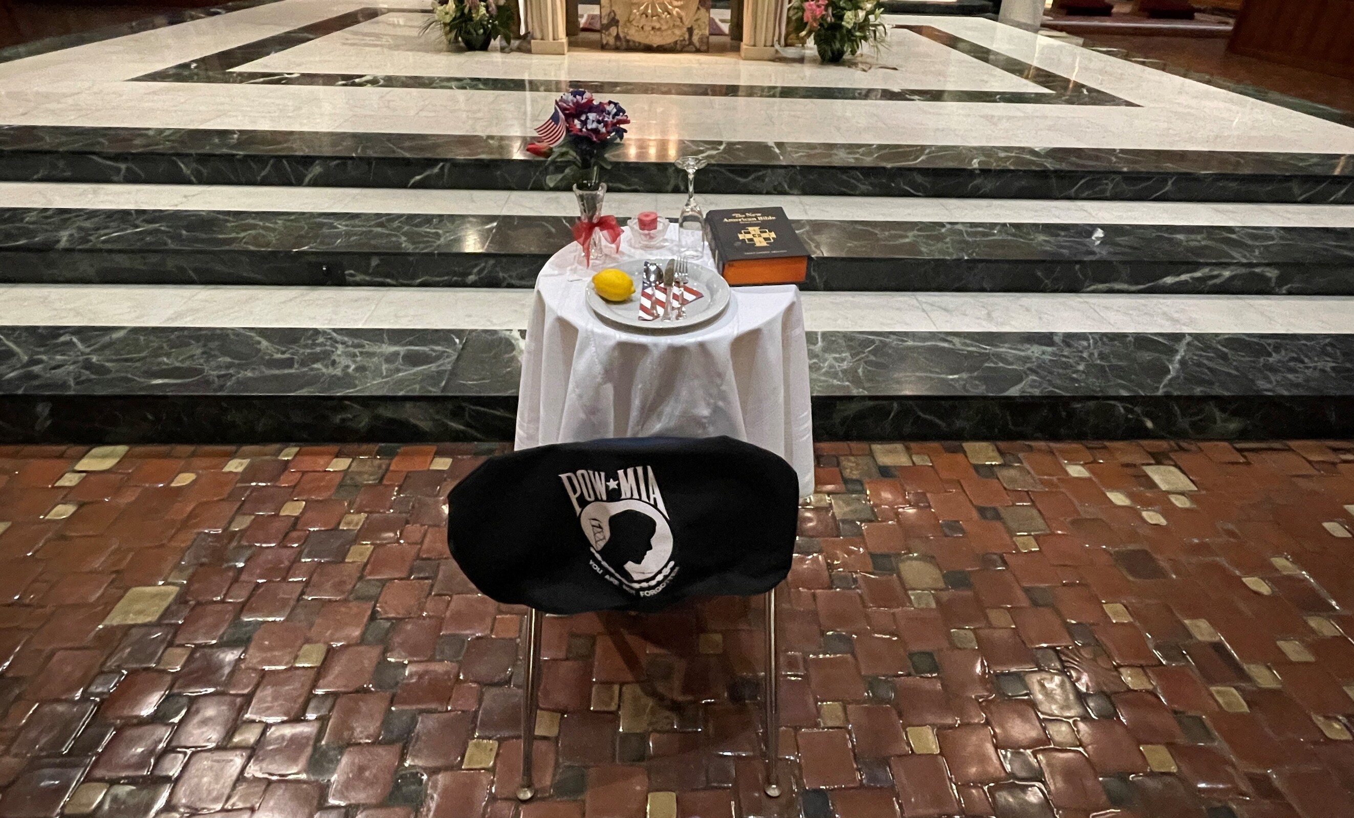 Sgt. First Class Ryan Acker and seventh-graders set the POW/MIA table, a poignant ceremony in honor and remembrance of all prisoners of war and those who are missing in action. The symbolism of the table was explained as they set a small table with a white tablecloth and added a single candle, a Bible, an inverted glass, a vase of flowers, a plate with a lemon and some salt. A chair was draped with a POW cover.