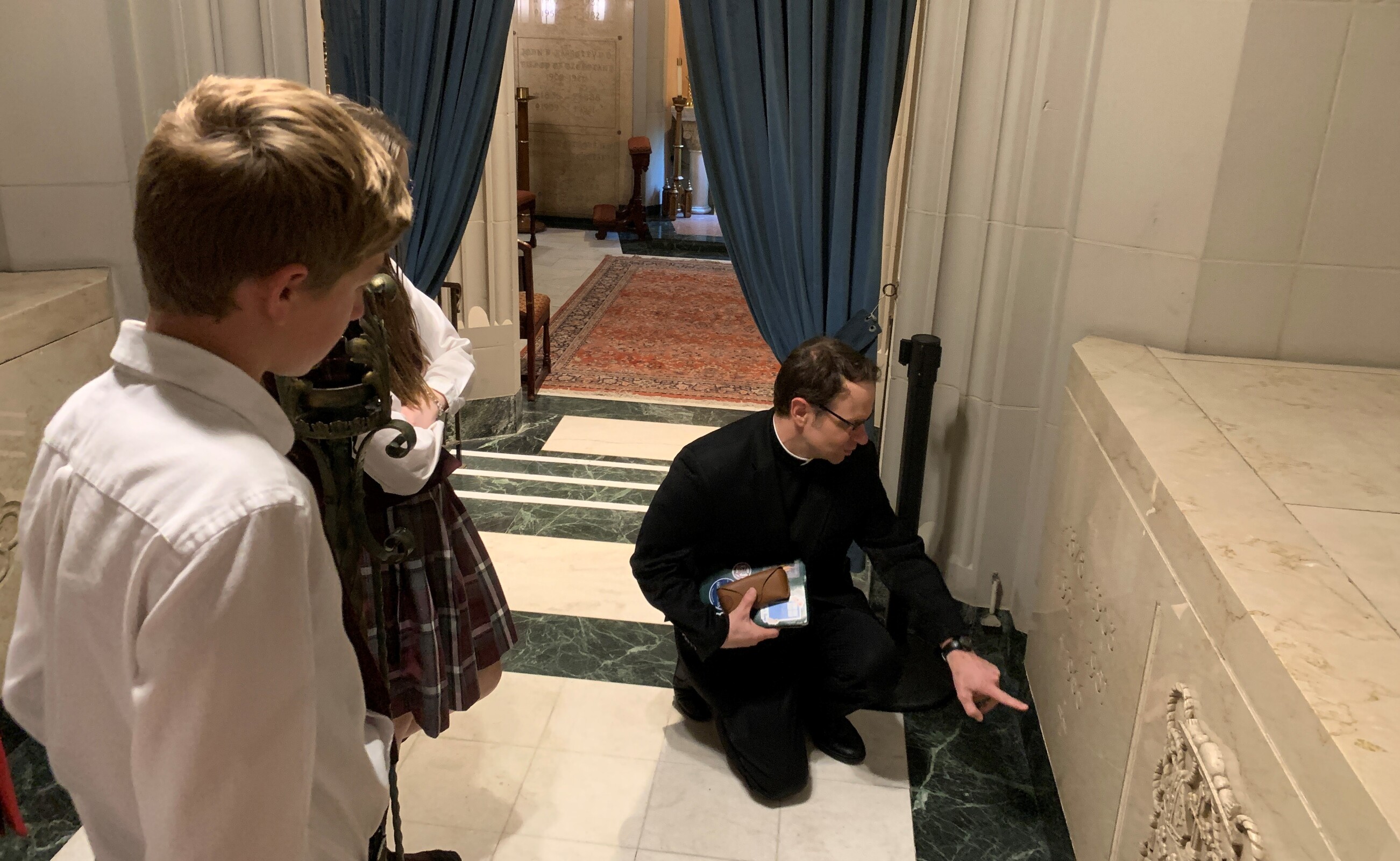 As the tour progressed, students got a chance to view the bishop’s cathedra -- the raised seat behind the altar – where he sits during liturgies. The students also learned about Bishop Edward Malesic’s crest and motto from cathedral docents (volunteer tour guides) before moving on to explore the crypt with Father Ference. Many bishops of the diocese are buried in the crypt. Most recently, Bishop Anthony Pilla and Bishop Richard Lennon, the ninth and 10th diocesan bishops, were laid to rest there.