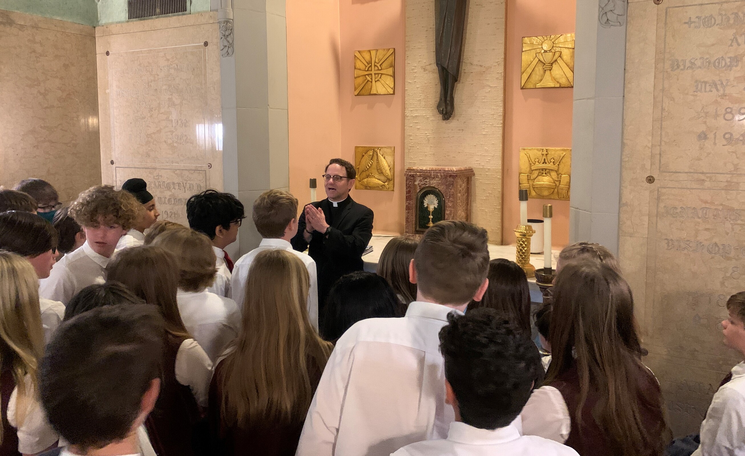 During their tour, IWA alumnus Father Damian Ference, diocesan vicar for evangelization, spoke to the students about the “Mother Church” and the Holy Spirit working within their lives.