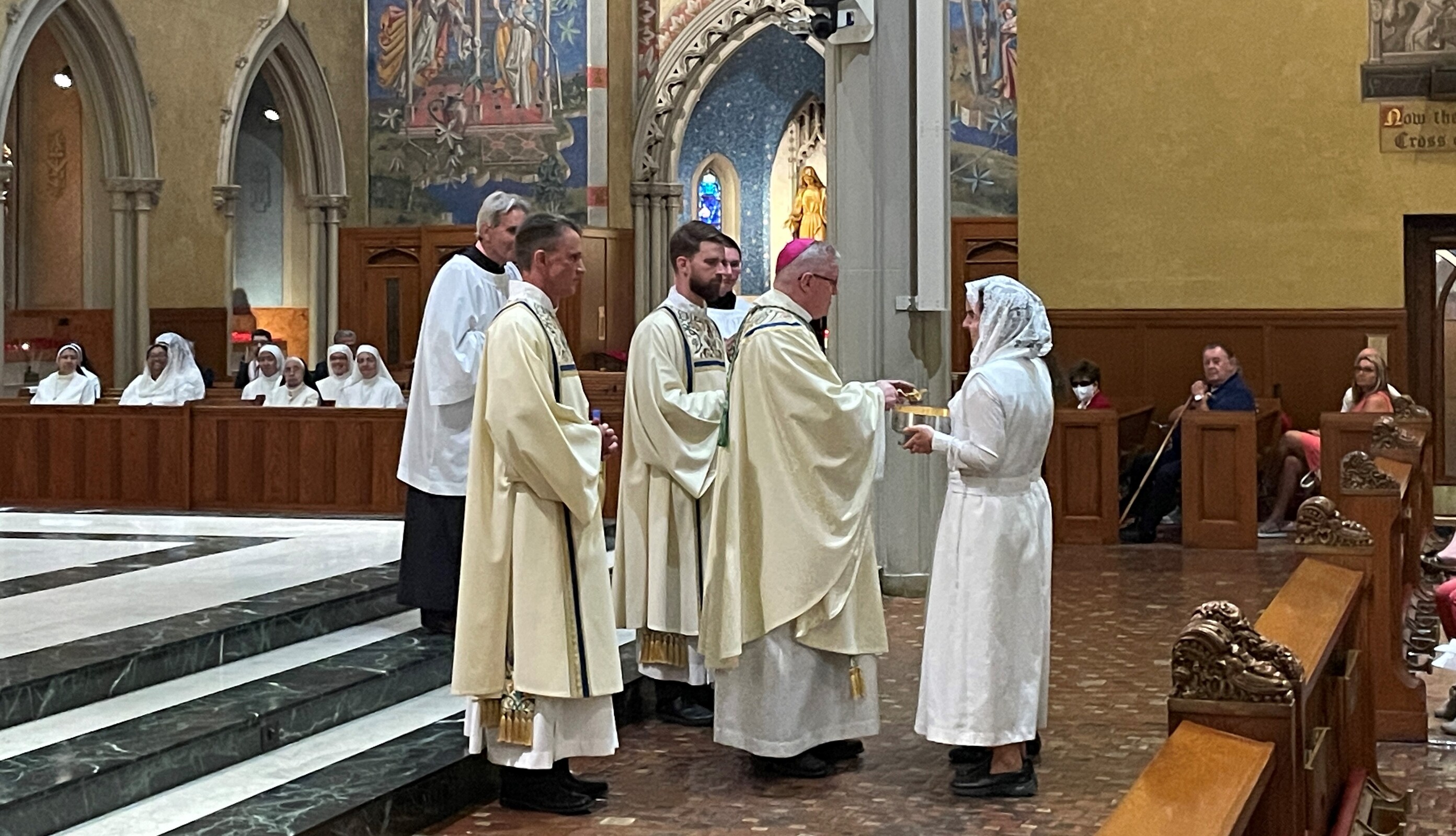 The Knights of Columbus served as an honor guard for the Mass, procession and XLT/adoration that followed. Members of the Mercedarian Sisters of the Blessed Sacrament carried a large banner at the head of the procession while the faithful received bandanas imprinted with the diocesan revival logo: Gathered, Blessed, Broken, Shared.