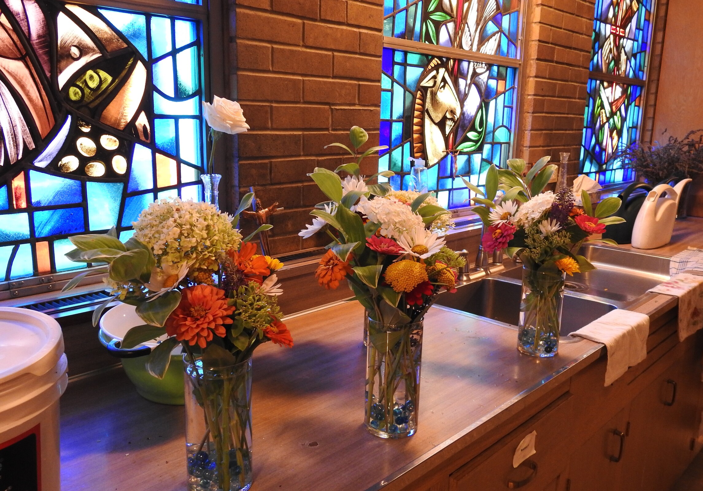 “Unfortunately, they looked lost,” said Spangler, who also serves as the sacristan. She explained that St. Sebastian Church in Akron is large and the altar is located quite a distance from the congregation. That means larger flowers were needed to ensure the arrangements were scaled properly to the church’s size.