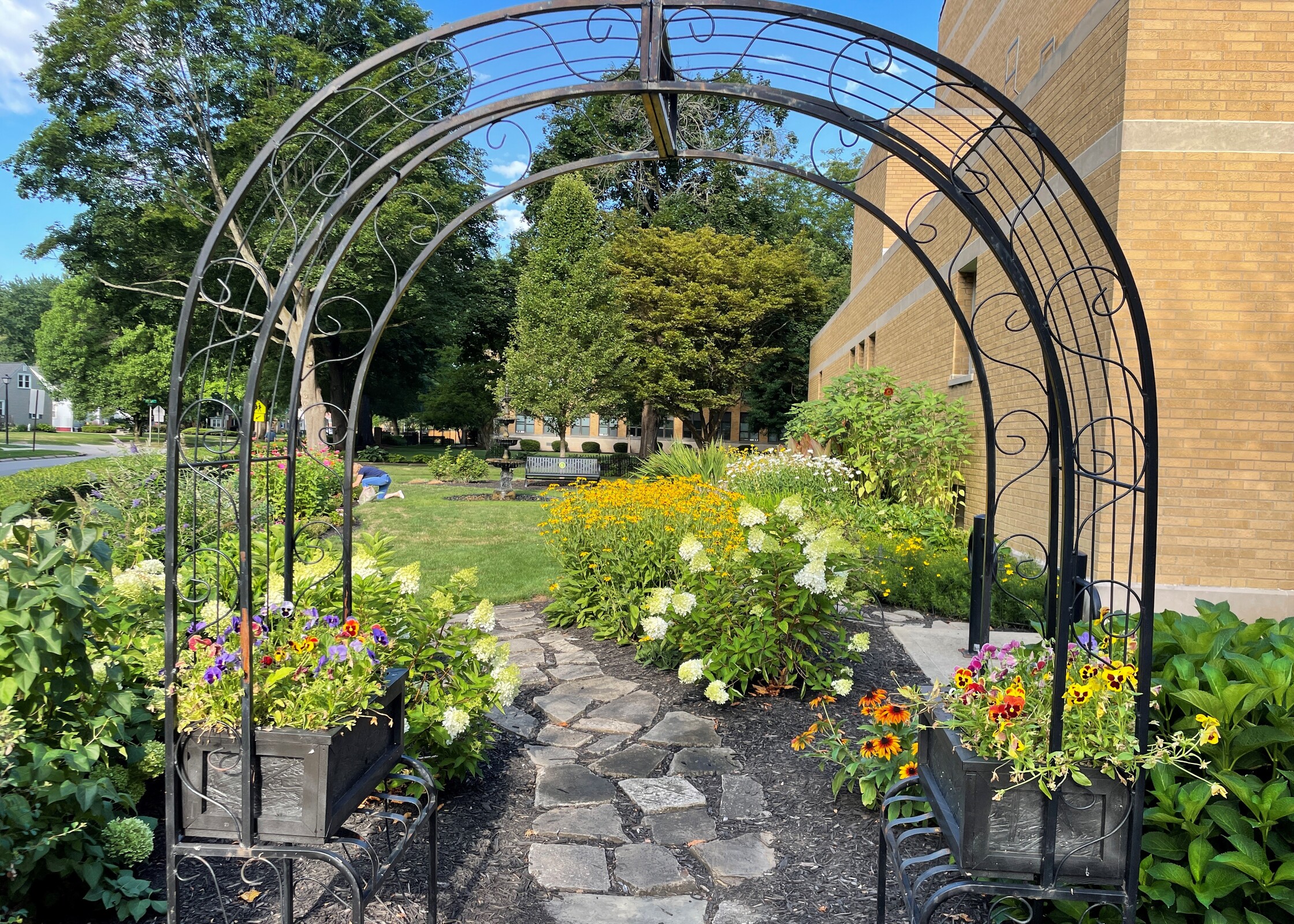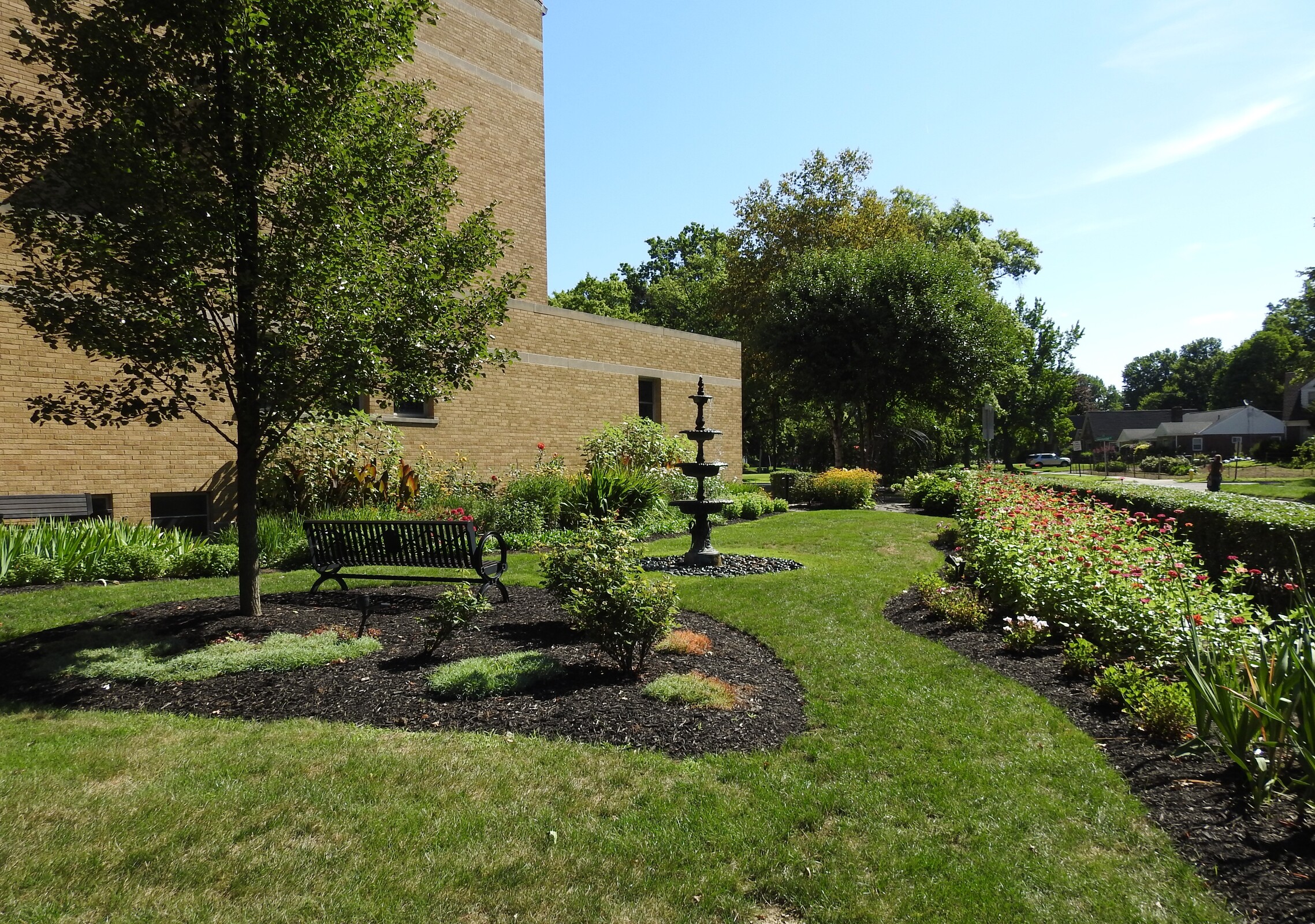 There is an arched entranceway to the garden from the church parking lot. The carefully landscaped area also features a bench, making it a perfect place for meditation or personal prayer.