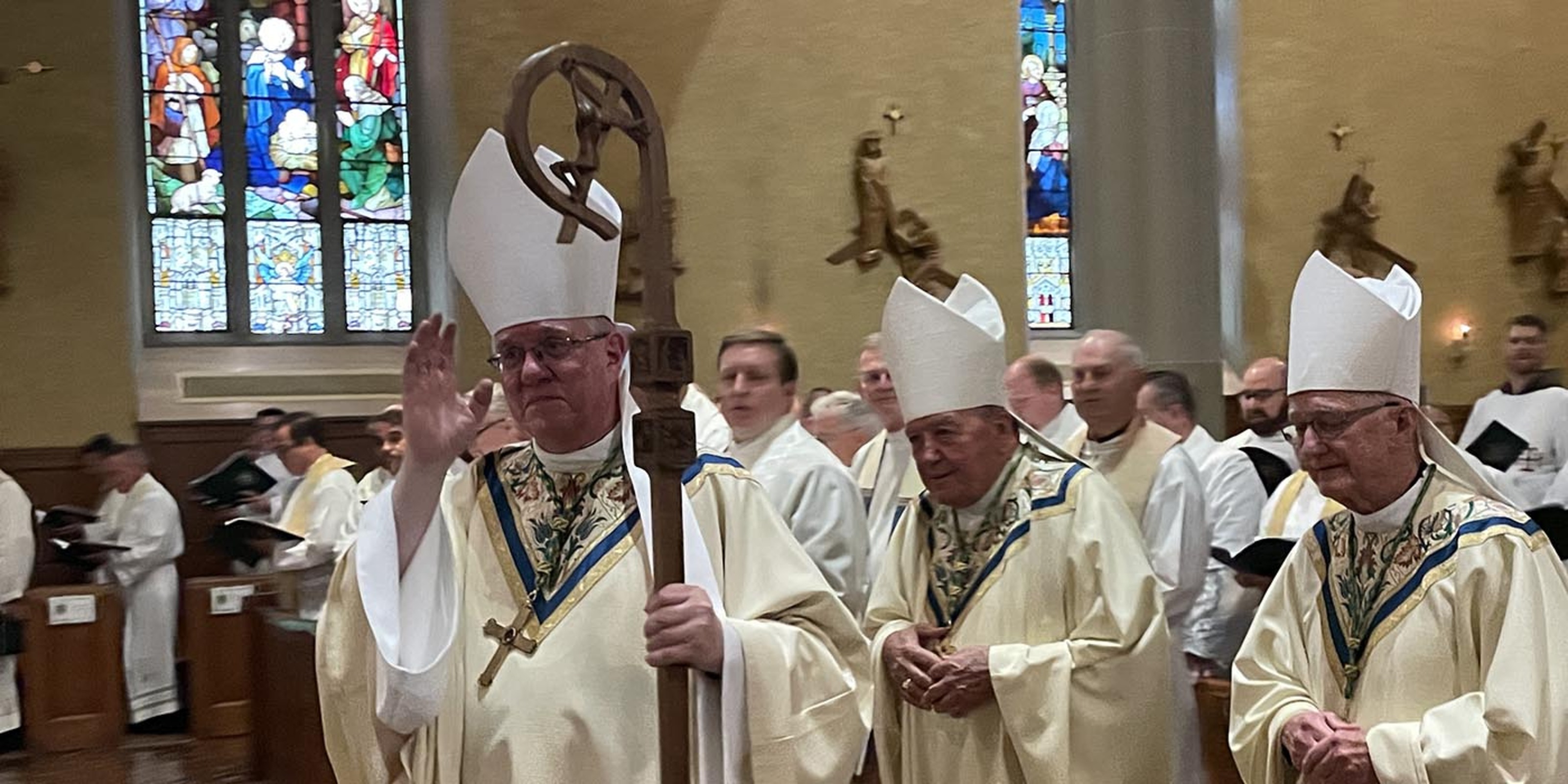 After members of the presbyterate and other invited guests filed into the cathedral, Bishop Woost and his two brothers who are diocesan priests entered the church. Father Dave Woost, pastor of Divine Word Parish in Kirtland, and Father Tom Woost, pastor of St. Brendan Parish in North Olmsted, accompanied their older brother to the tabernacle where they spent a few minutes in silent prayer. They joined members of the presbyteral council, visiting bishops and other clergy processing along Superior Avenue onto East Ninth Street, up the newly rebuilt front steps of the cathedral and into the church.