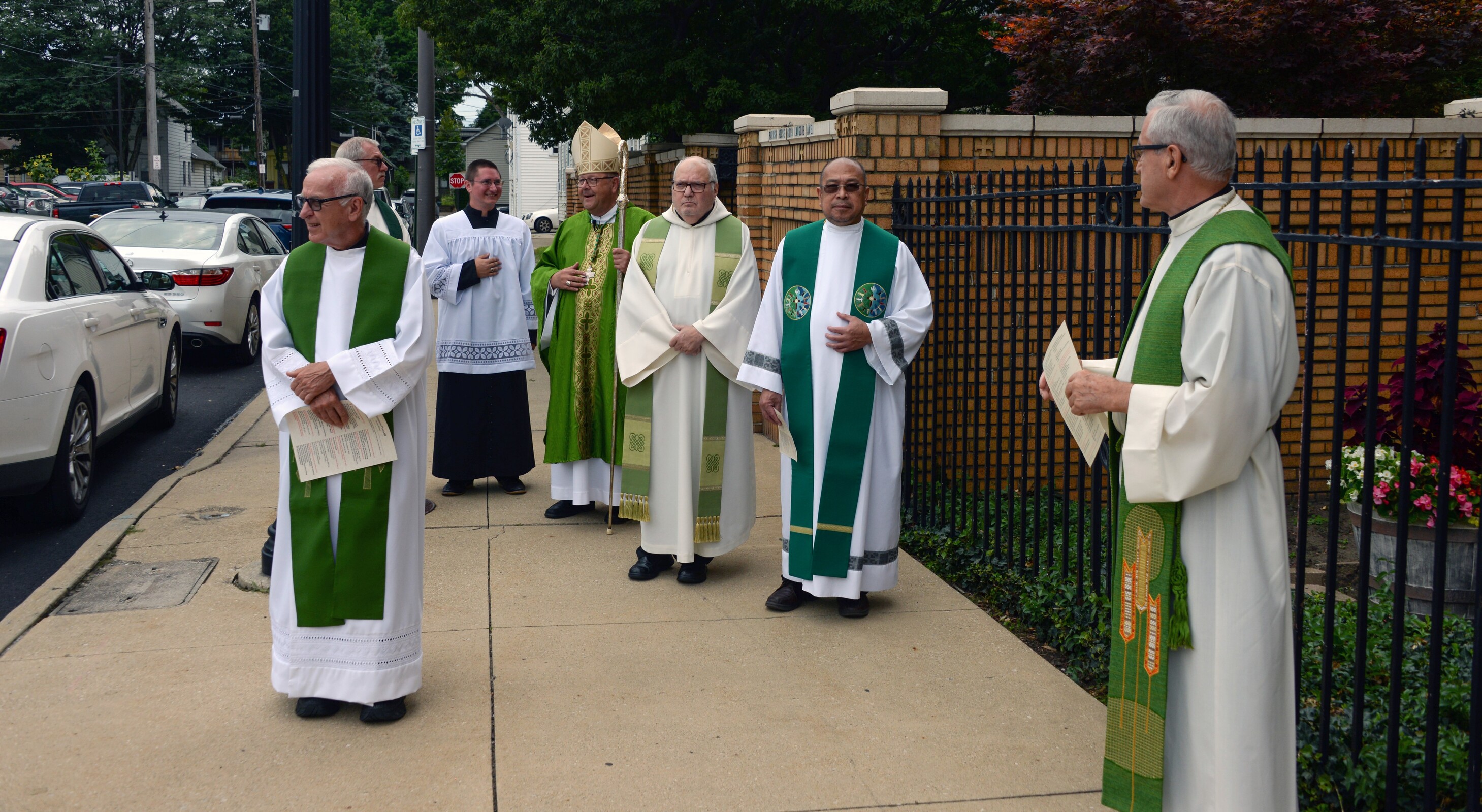 The entrance procession began across the street from the church at the new parish hall. Servers led other participants and the clergy across the street and into the church. Tony Leksan directed the servers. Many people representing the parish and dressed in colorful Slovenian costumes also participated in the procession, followed by ushers, parish staff and members of the pastoral and finance councils. The clergy, followed by Bishop Malesic and his emcee, entered the church last.
